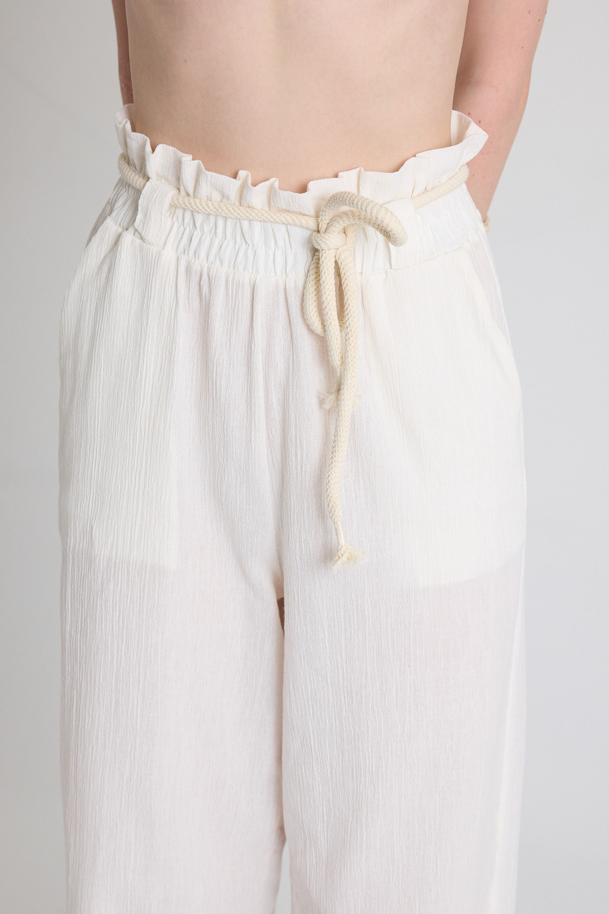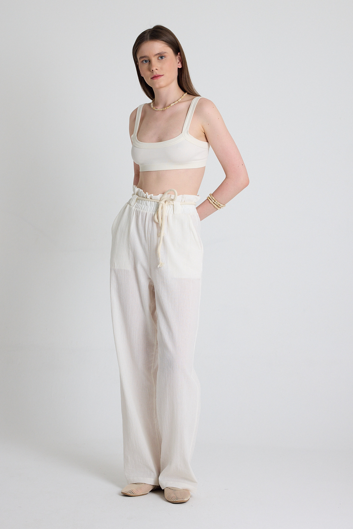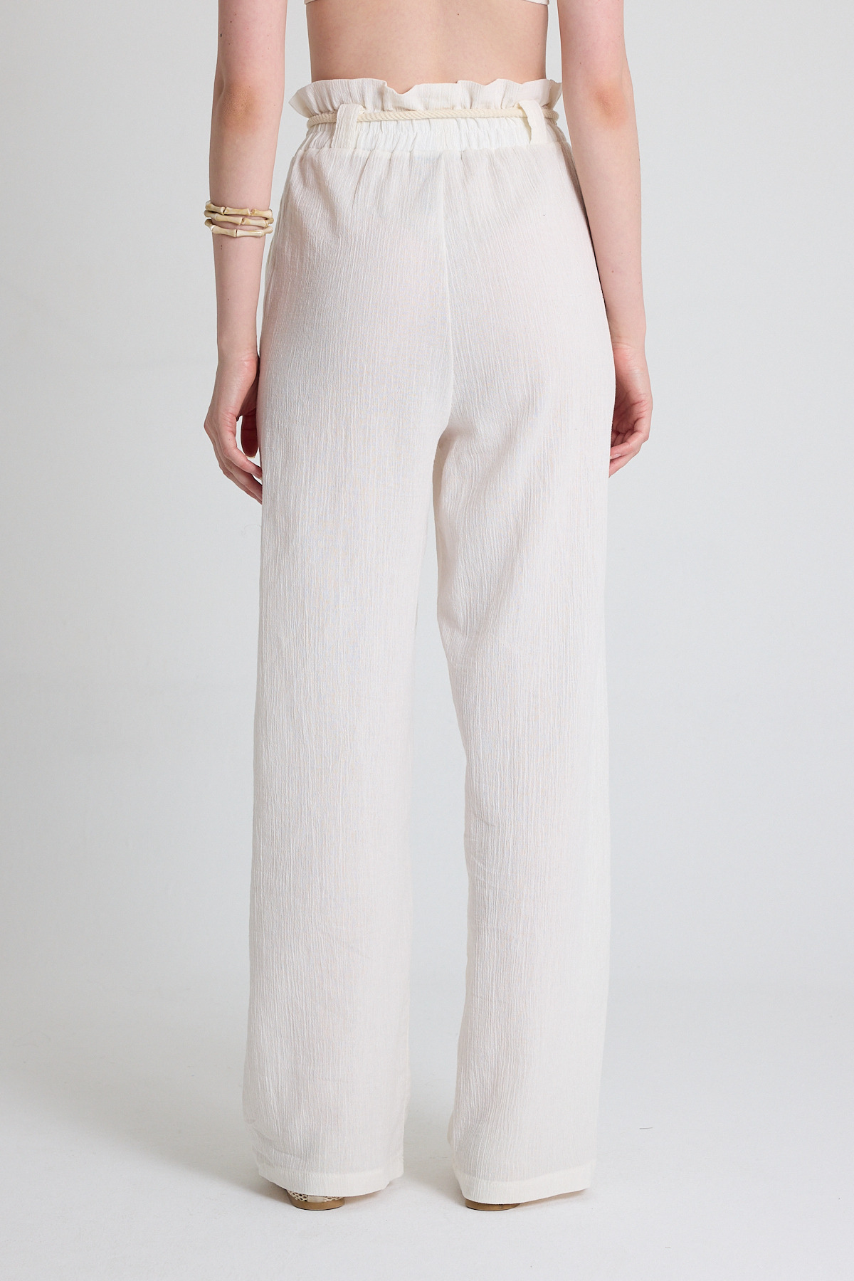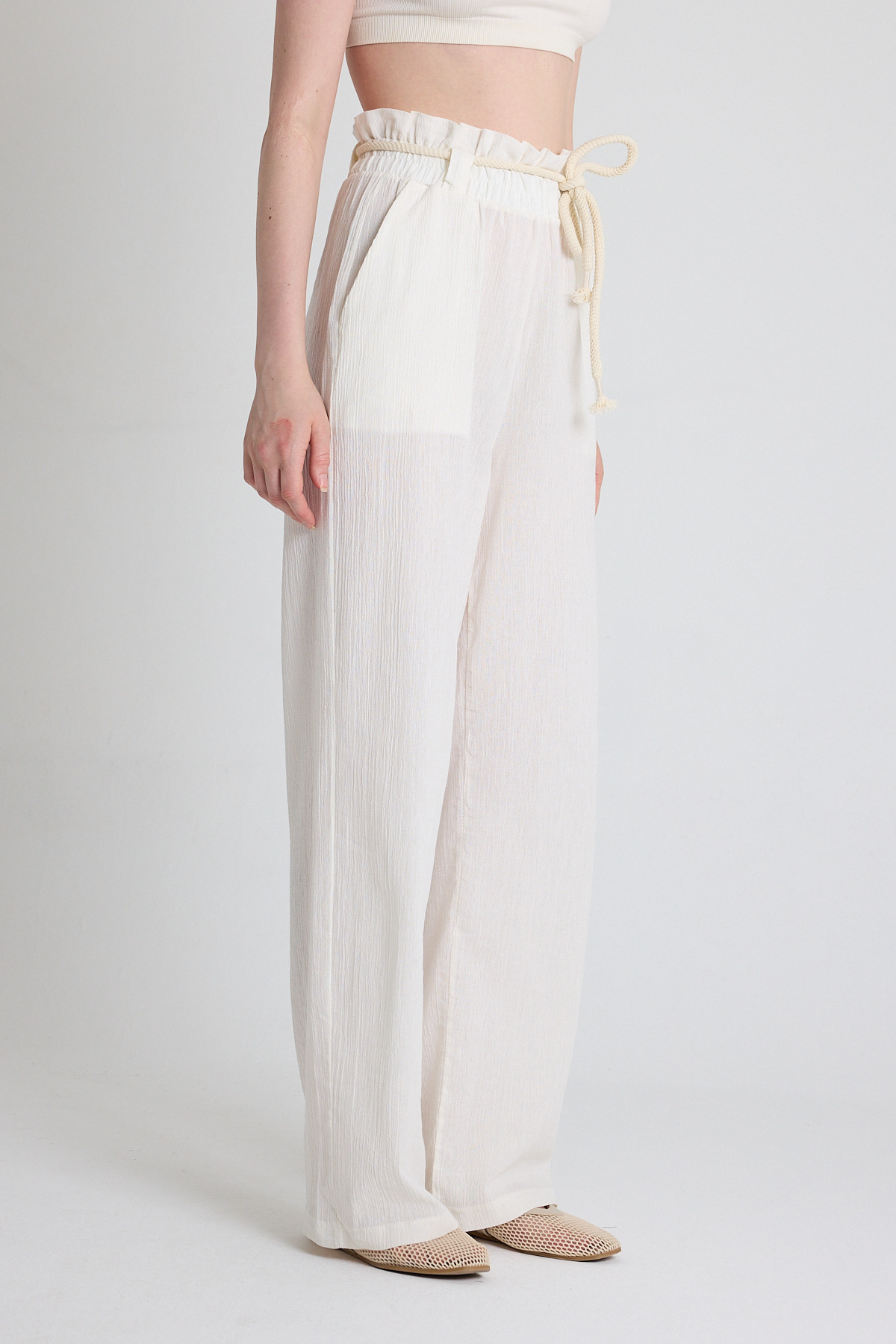 Beyaz Keten Görünümlü %100 Pamuk Büzgülü Bel Hasır Kemerli Bol Paça Pantolon 6941