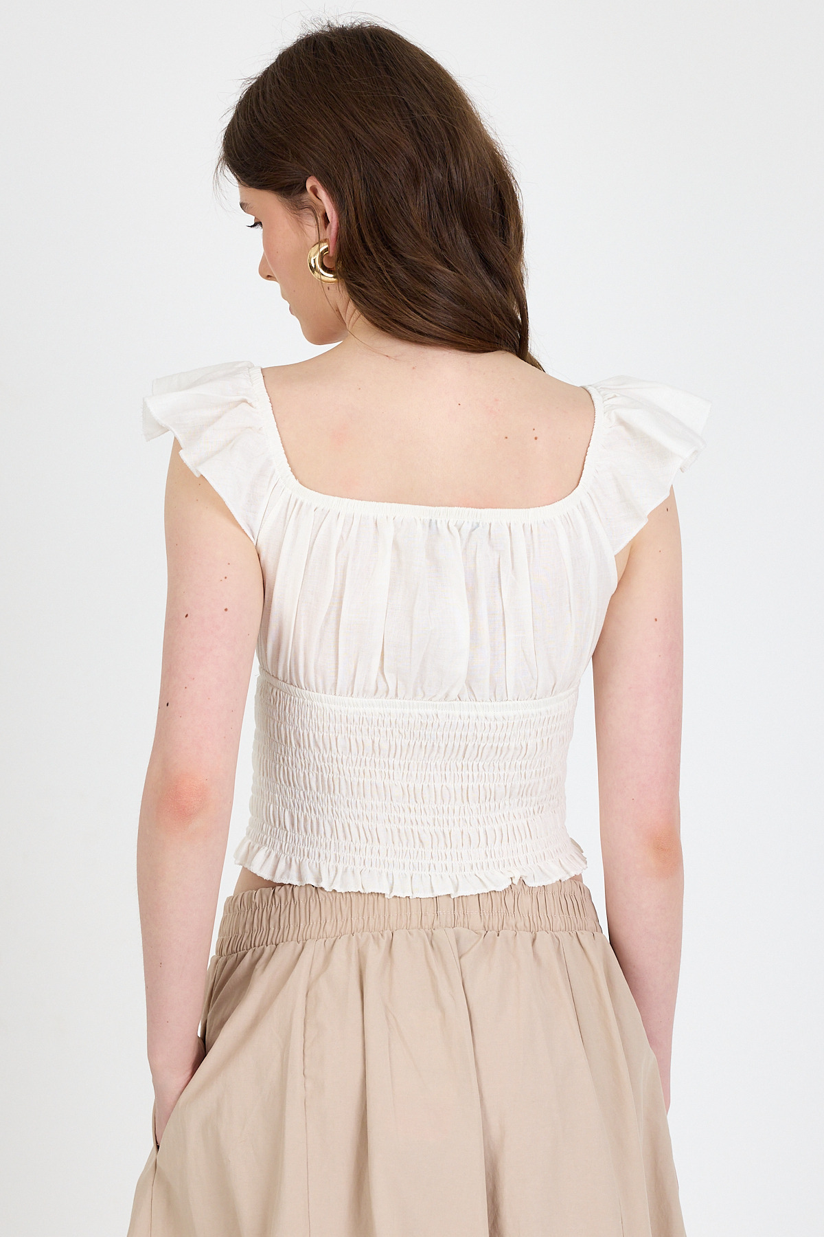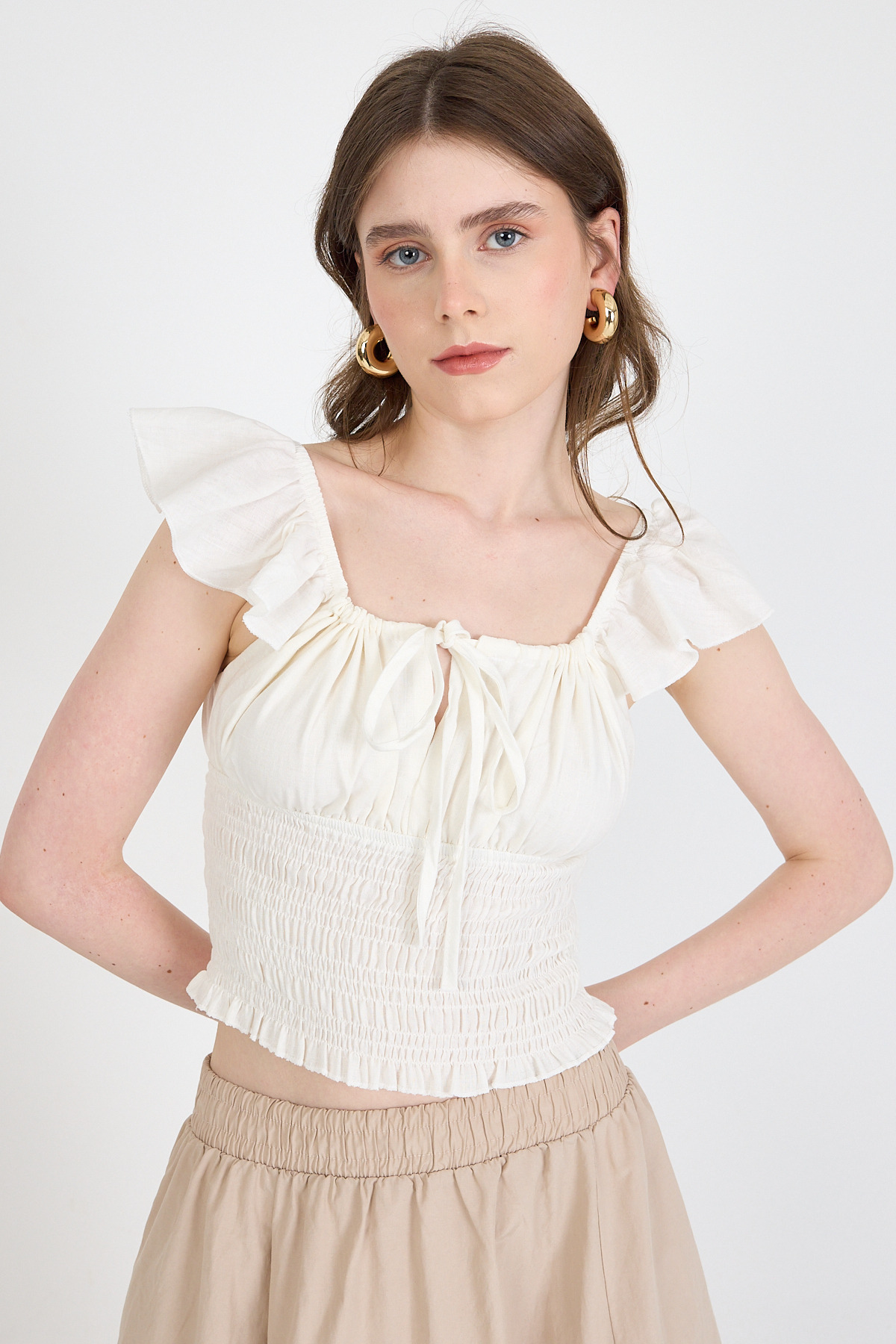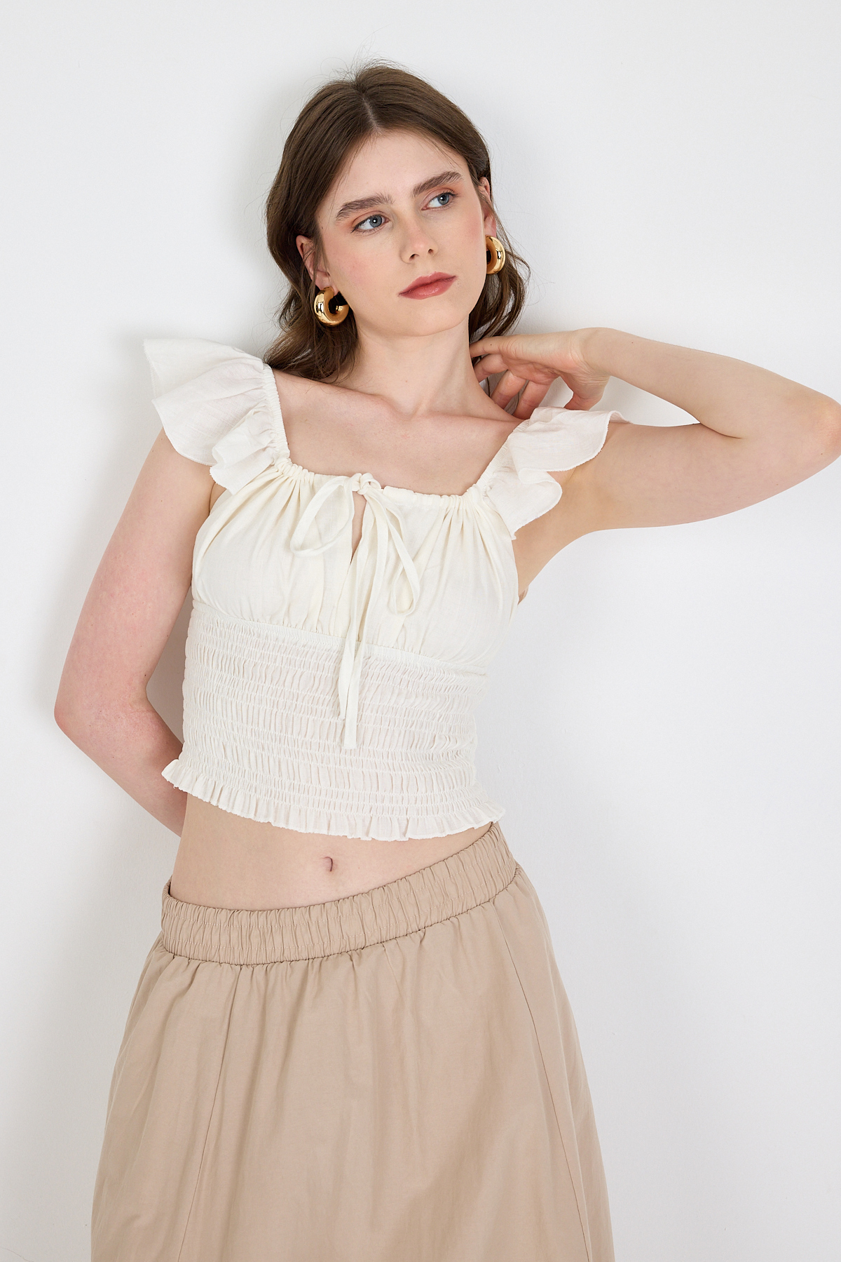 Beyaz Keten Görünümlü %100 Pamuk Büzgülü Fırfır Kol Detaylı Crop Bluz 6892