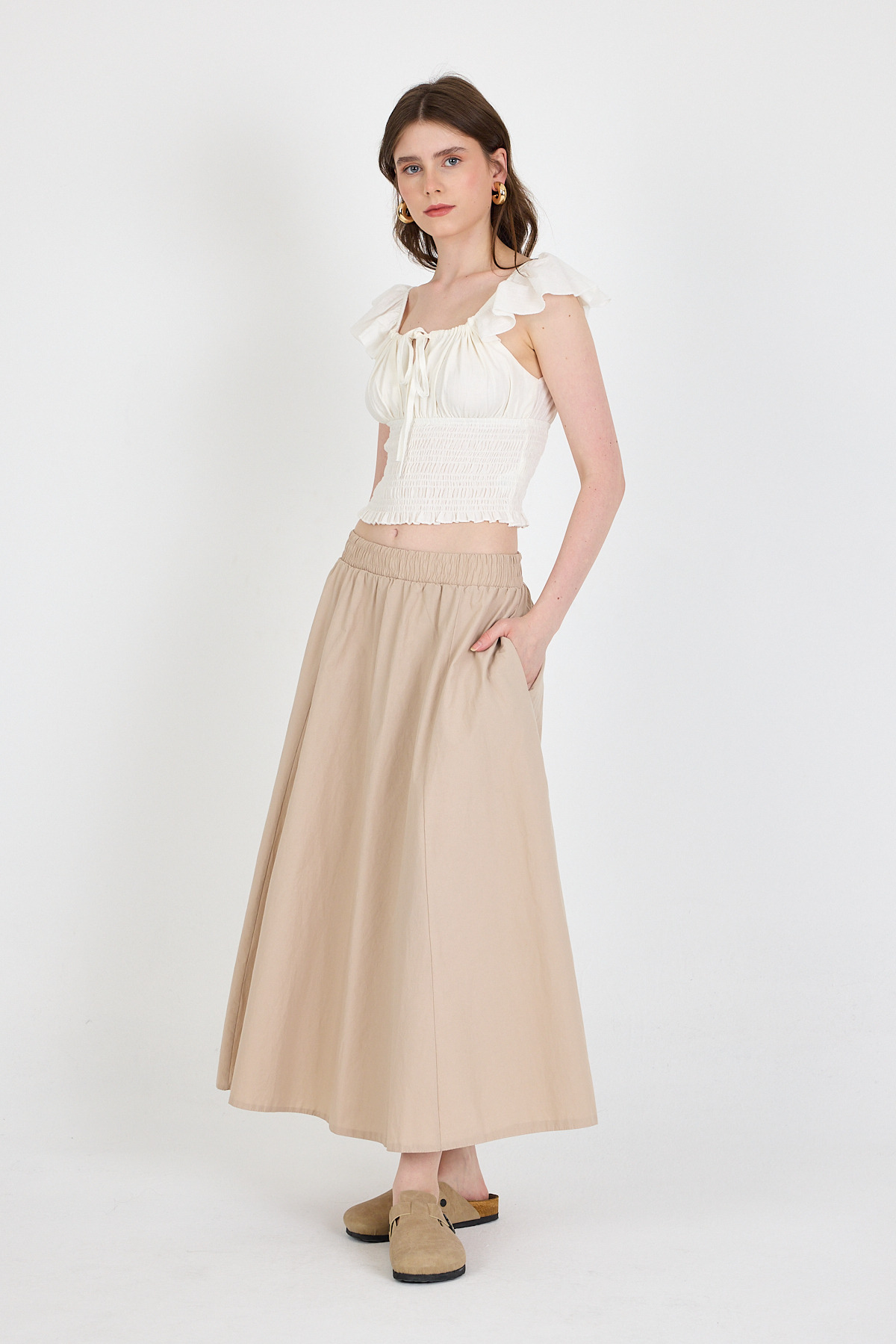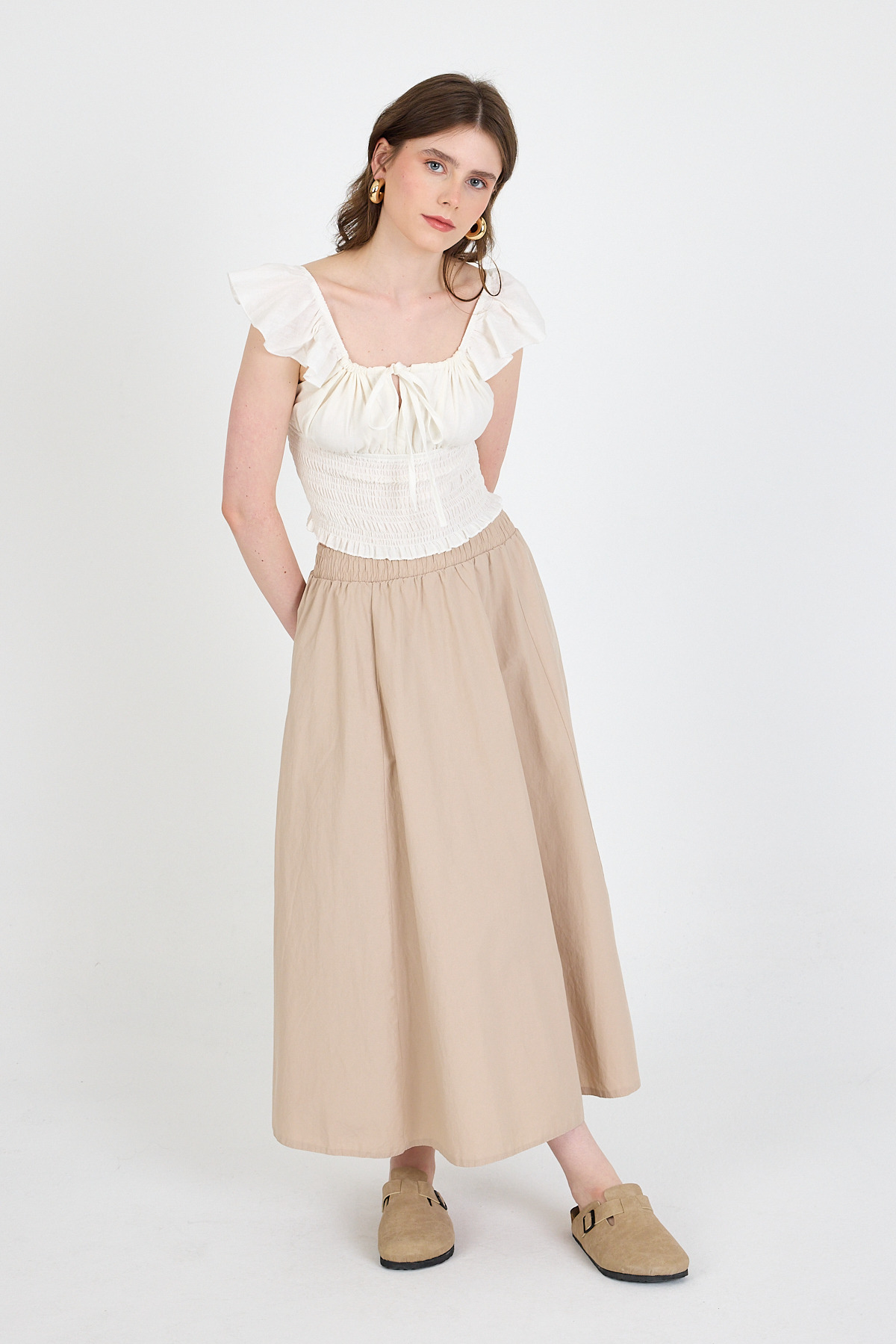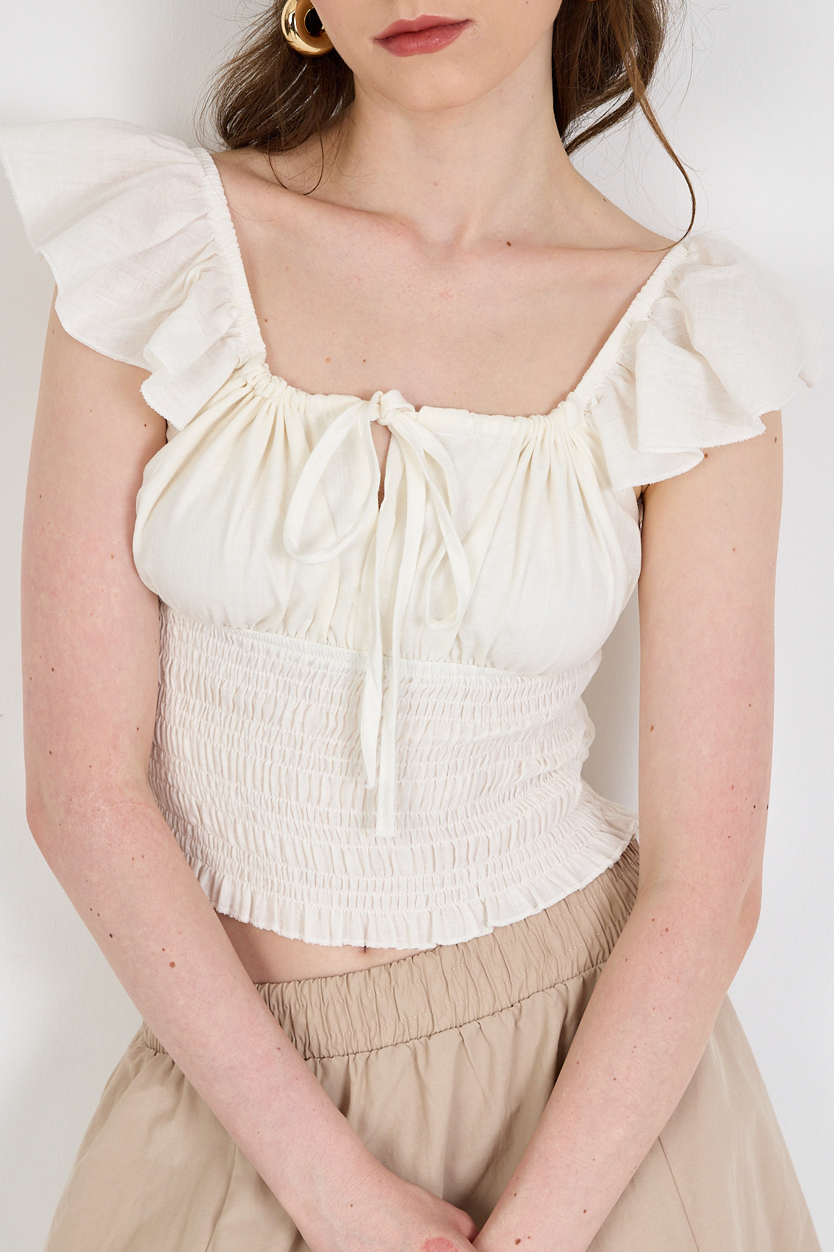 Beyaz Keten Görünümlü %100 Pamuk Büzgülü Fırfır Kol Detaylı Crop Bluz 6892