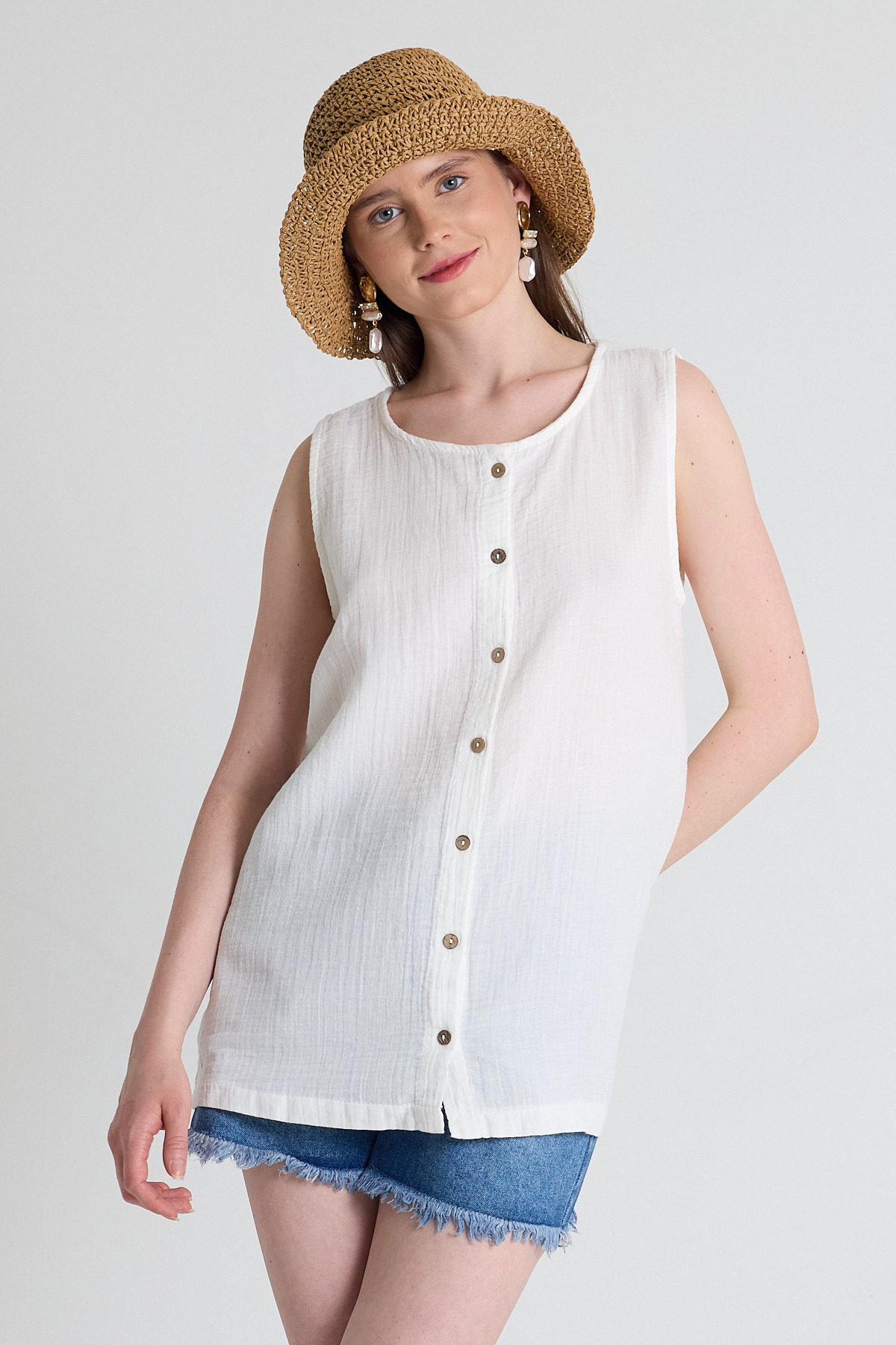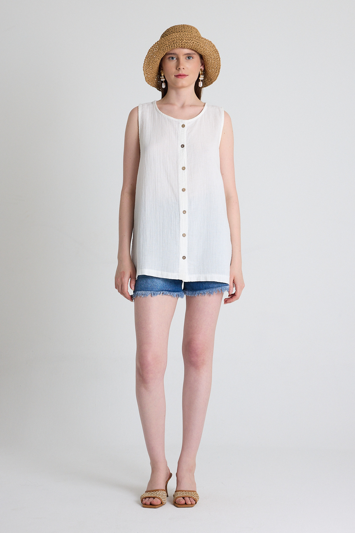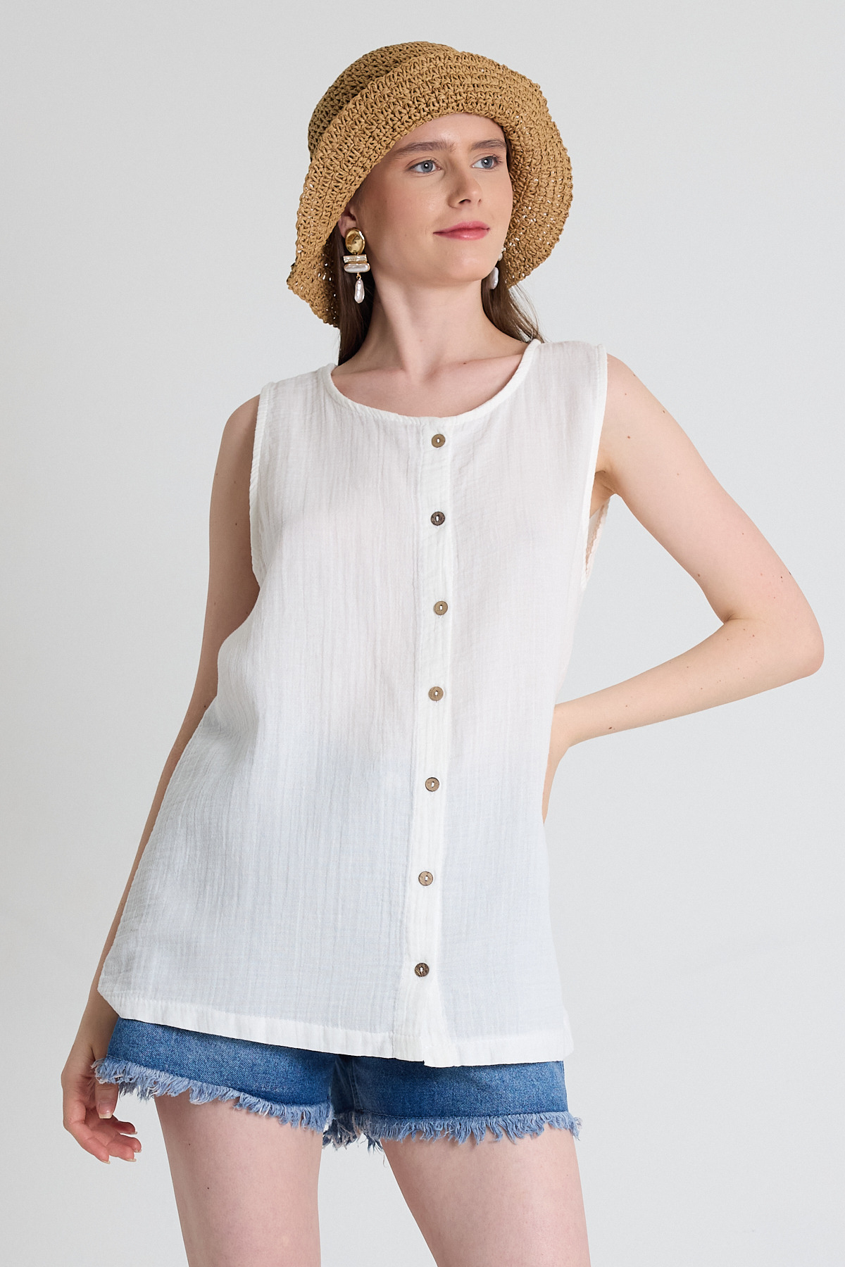 Beyaz Keten Görünümlü %100 Pamuk Düğmeli Kolsuz Bluz 4808A