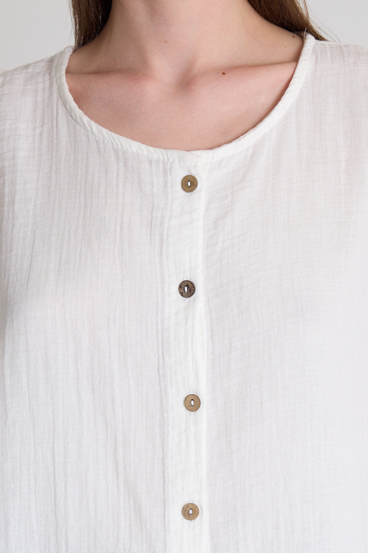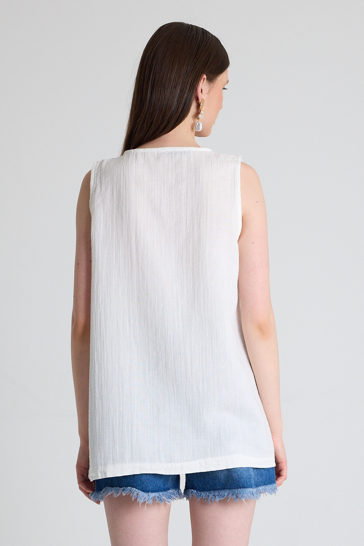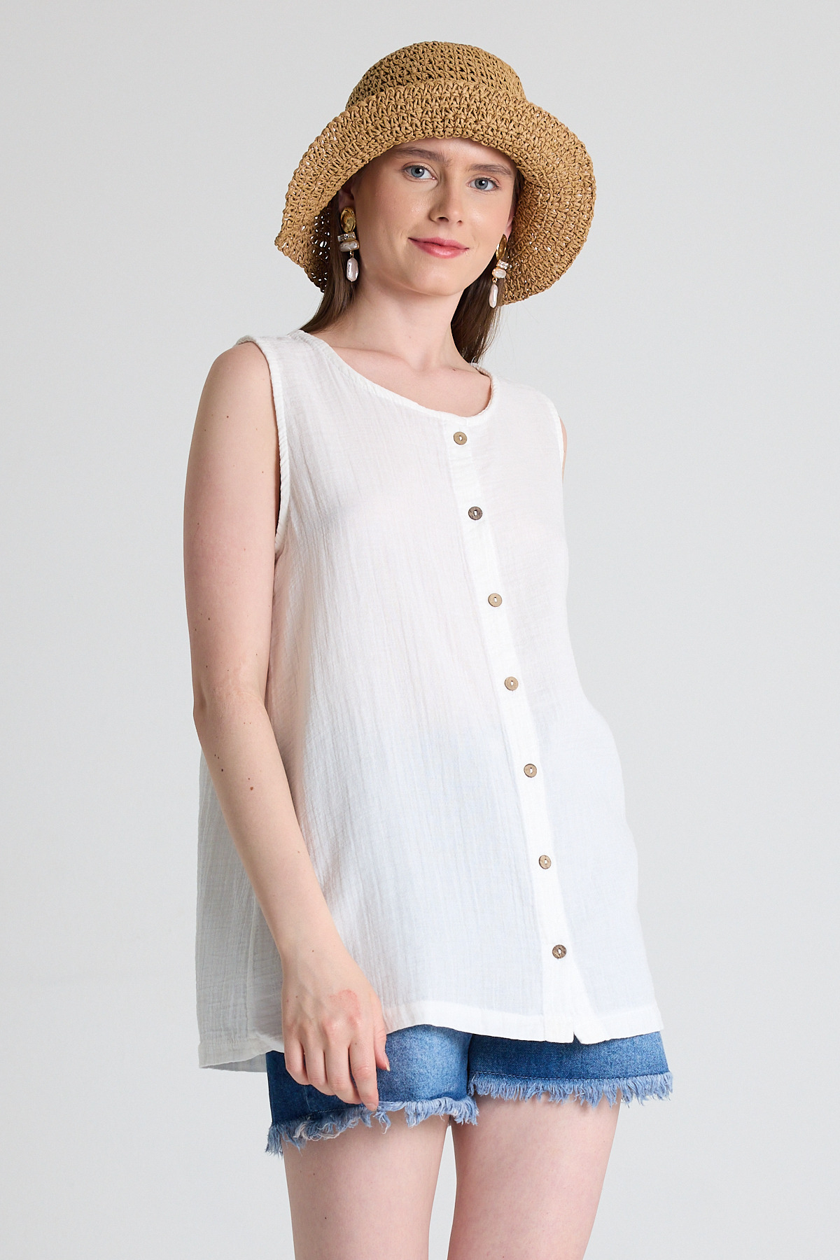 Beyaz Keten Görünümlü %100 Pamuk Düğmeli Kolsuz Bluz 4808A
