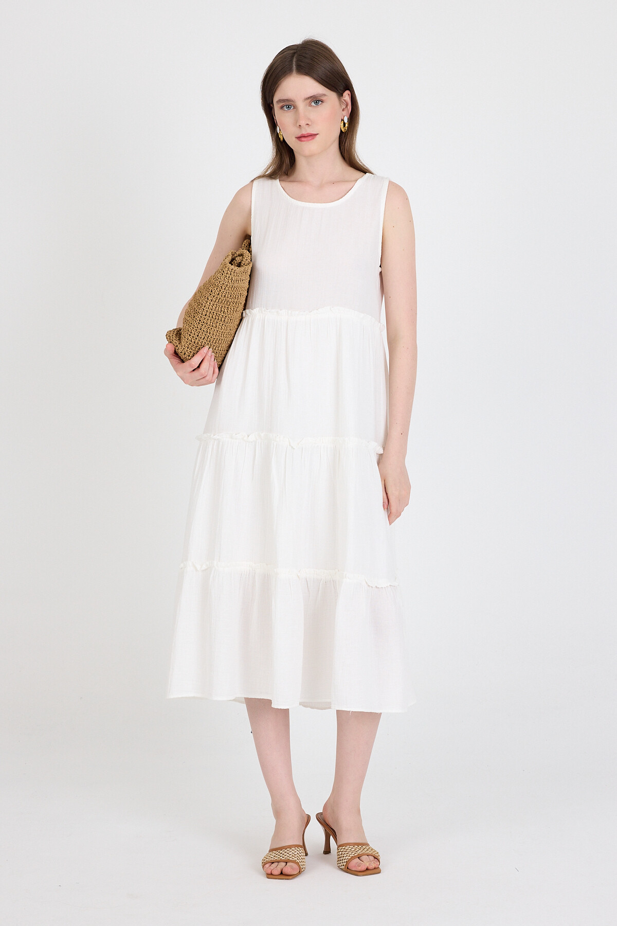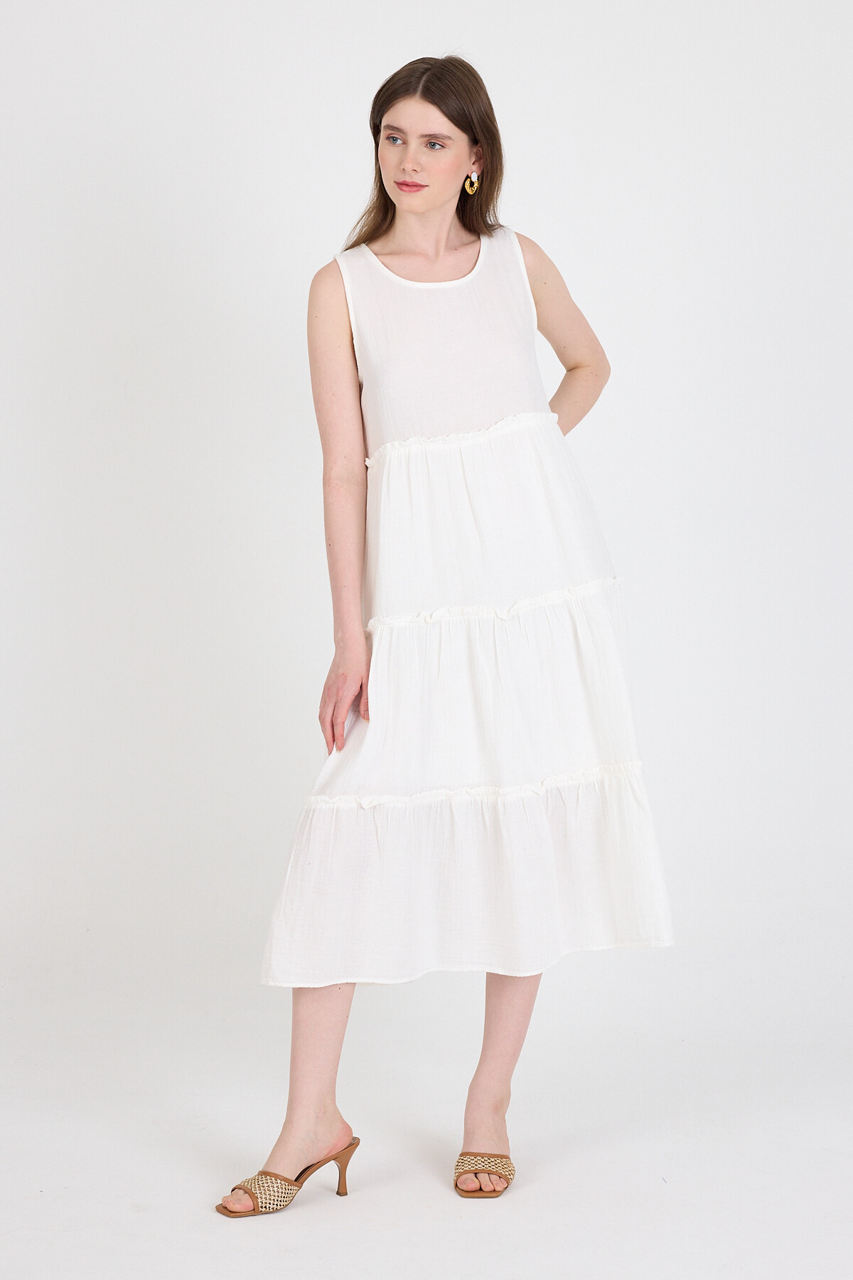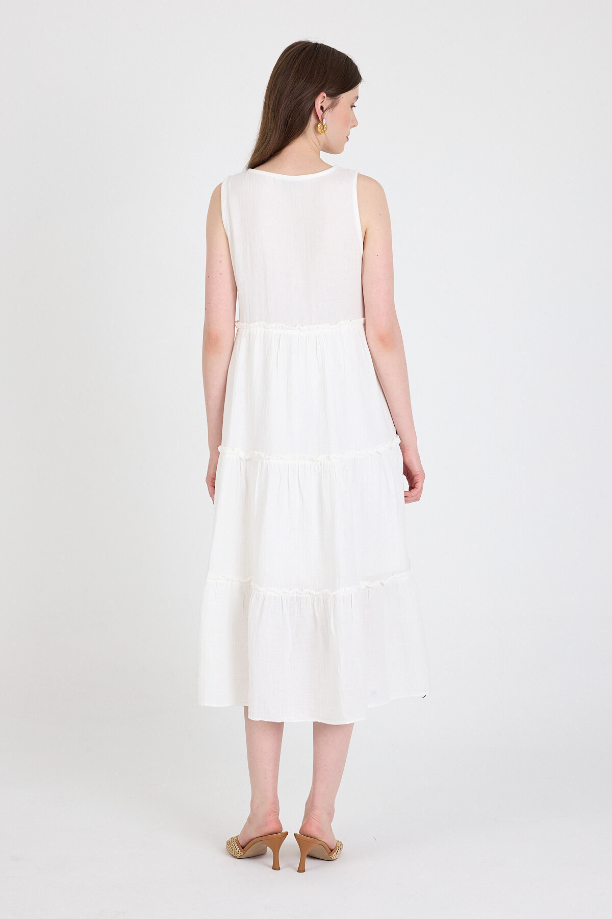 Beyaz Keten Görünümlü %100 Pamuk Fırfır Detaylı Kolsuz Midi Elbise 4738A