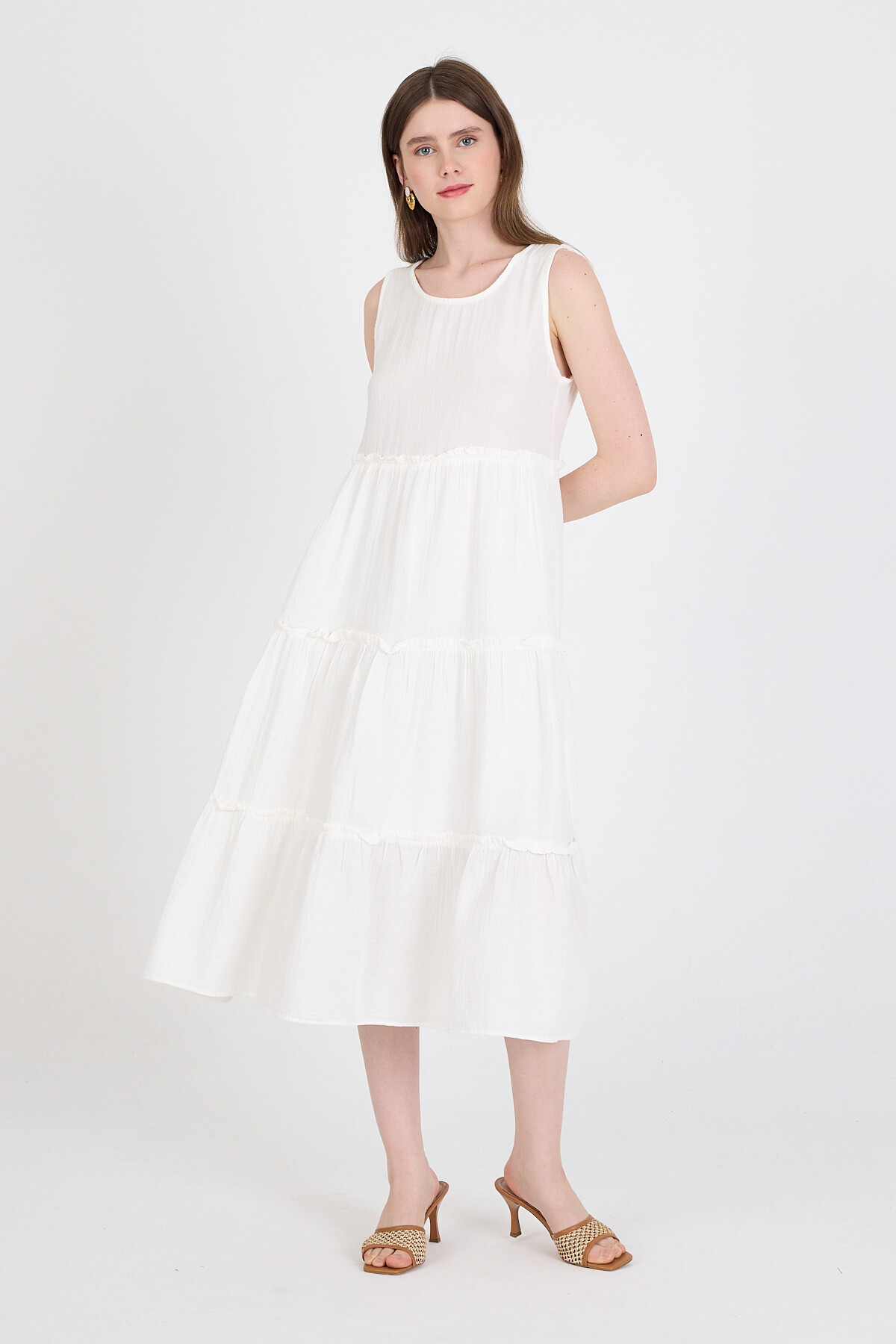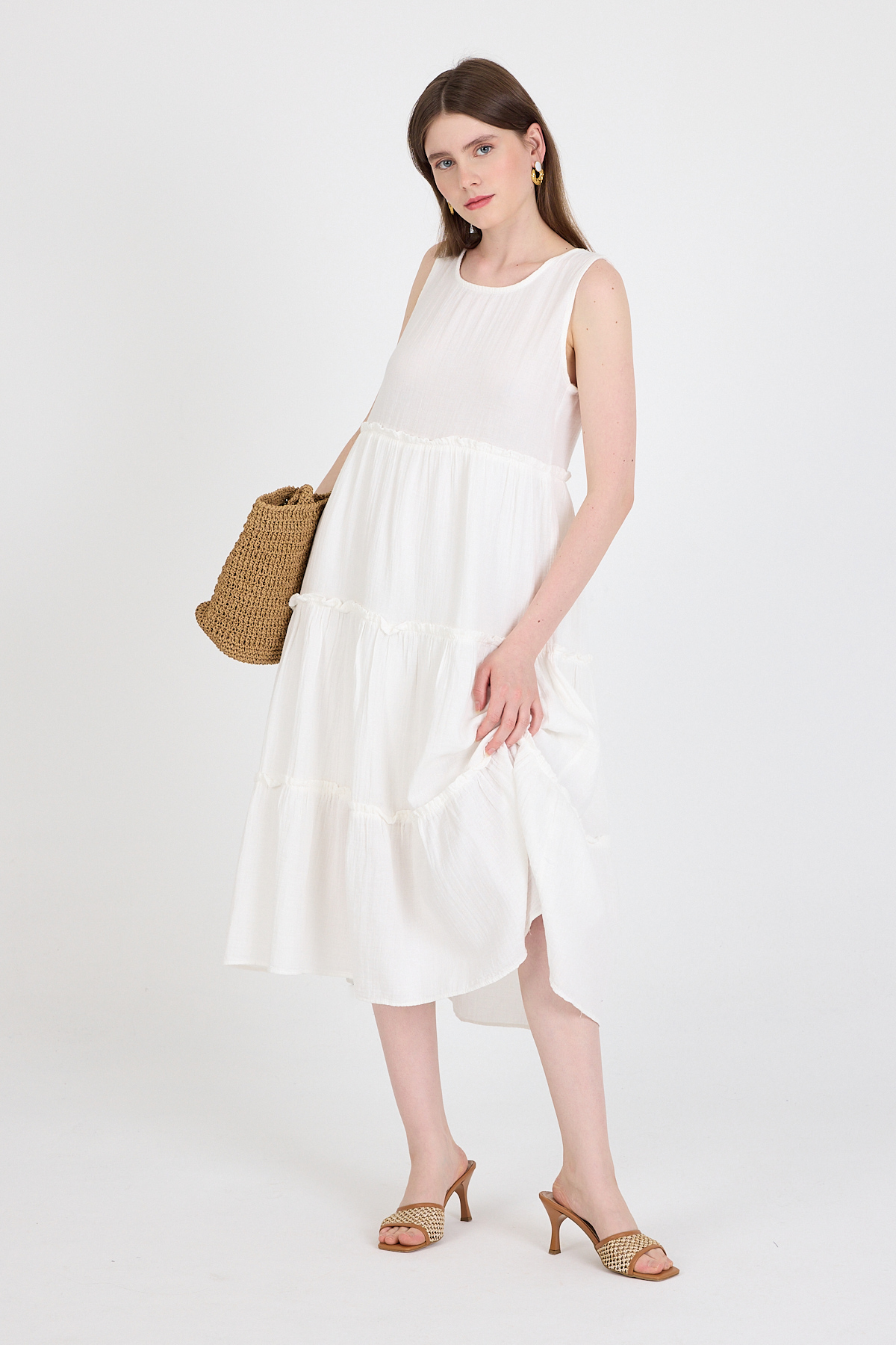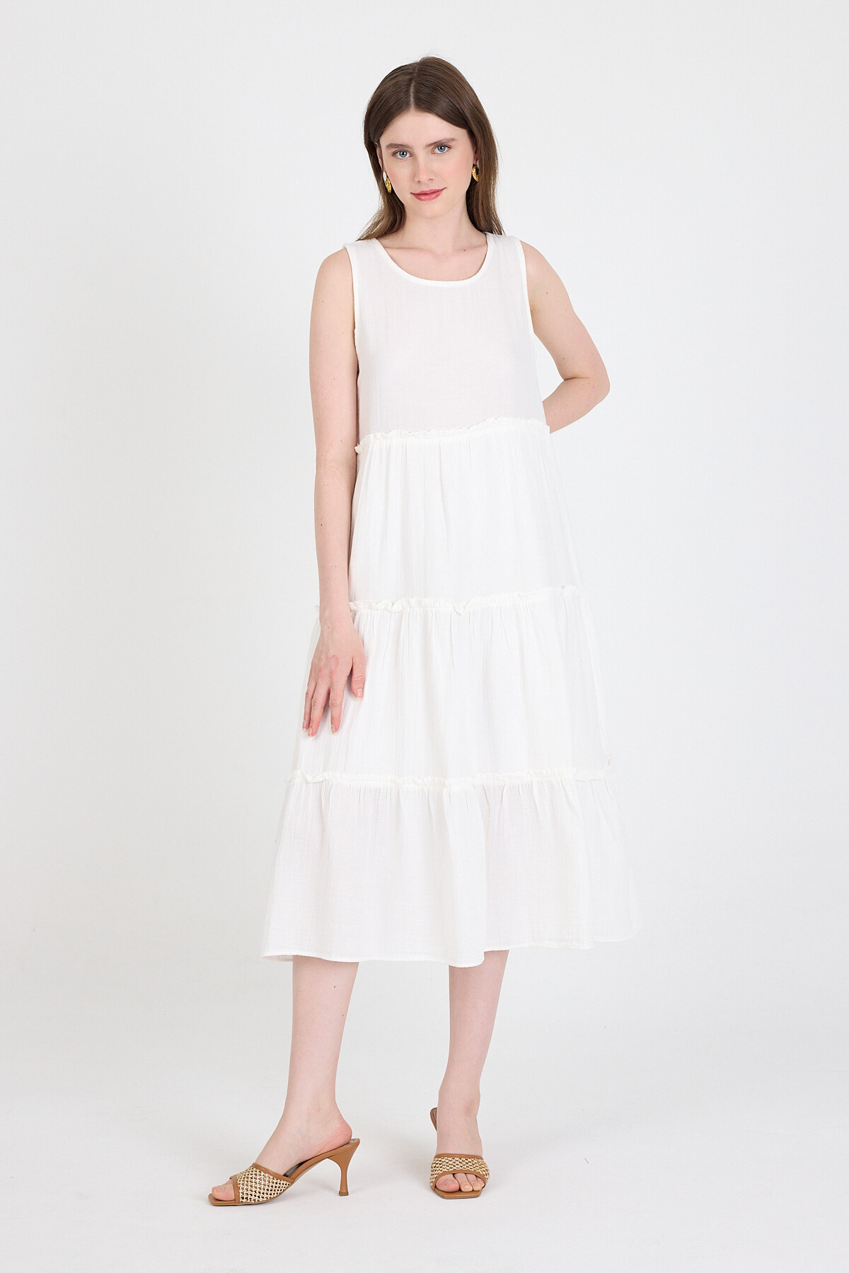Beyaz Keten Görünümlü %100 Pamuk Fırfır Detaylı Kolsuz Midi Elbise 4738A