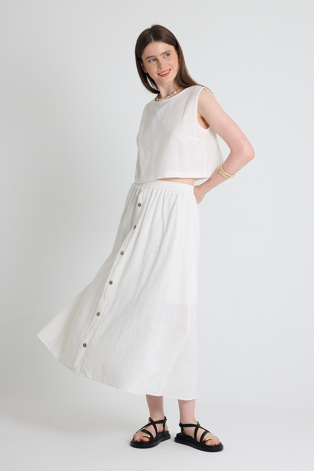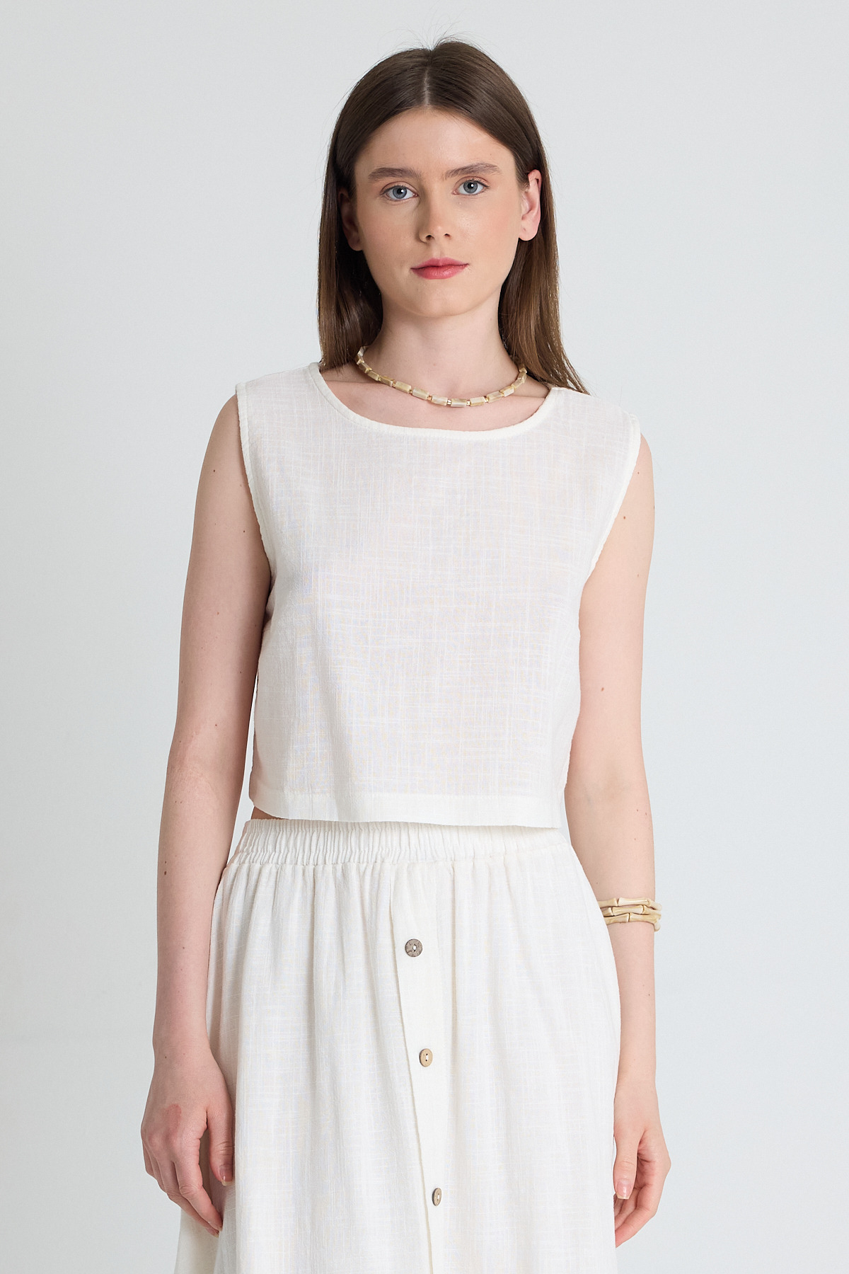 Beyaz Keten Görünümlü %100 Pamuk Kolsuz Crop Bluz 3419-1
