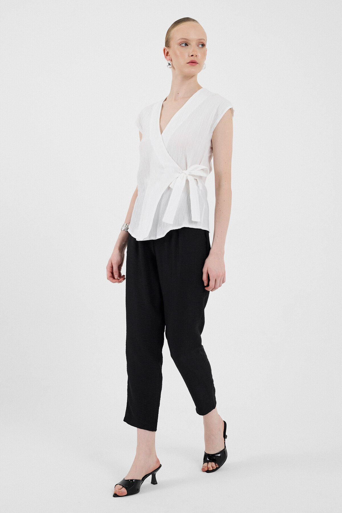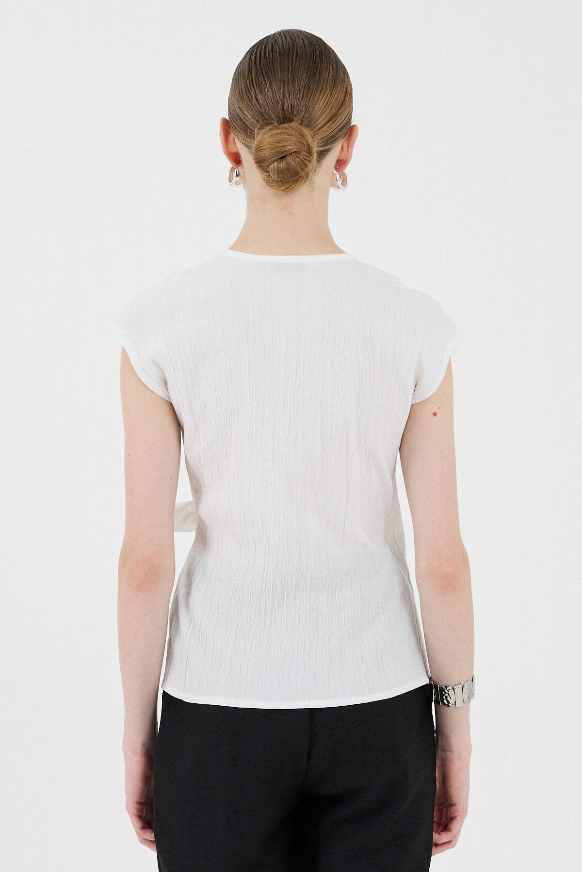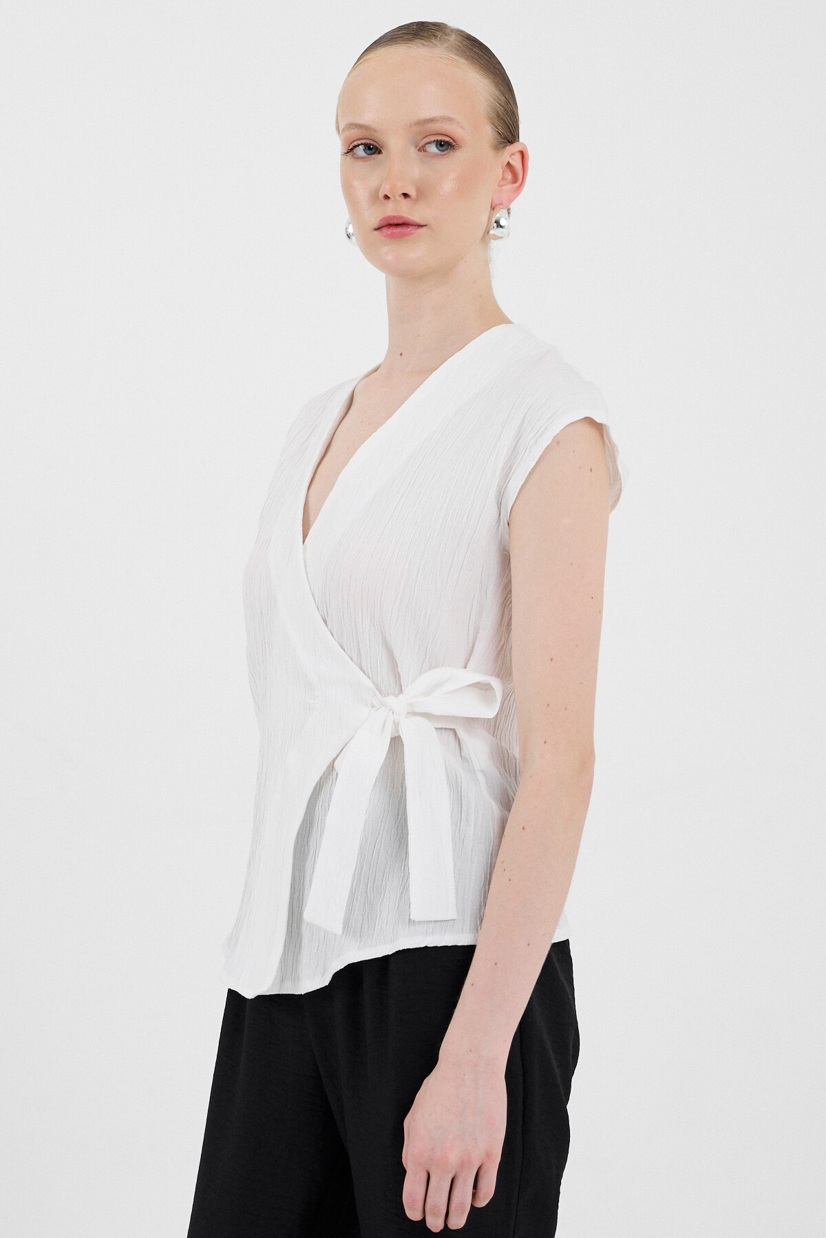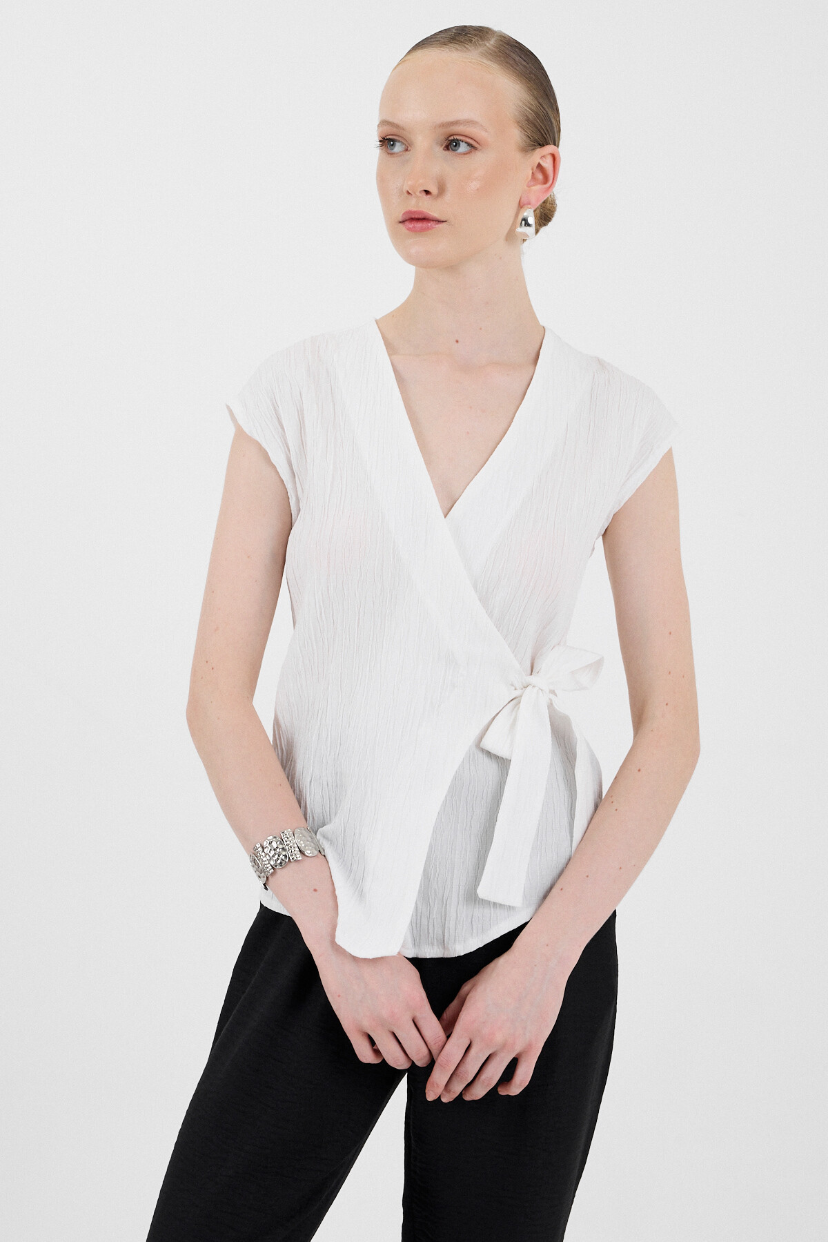 Beyaz Kruvaze Yaka Bağlama Detaylı Bluz 8025A