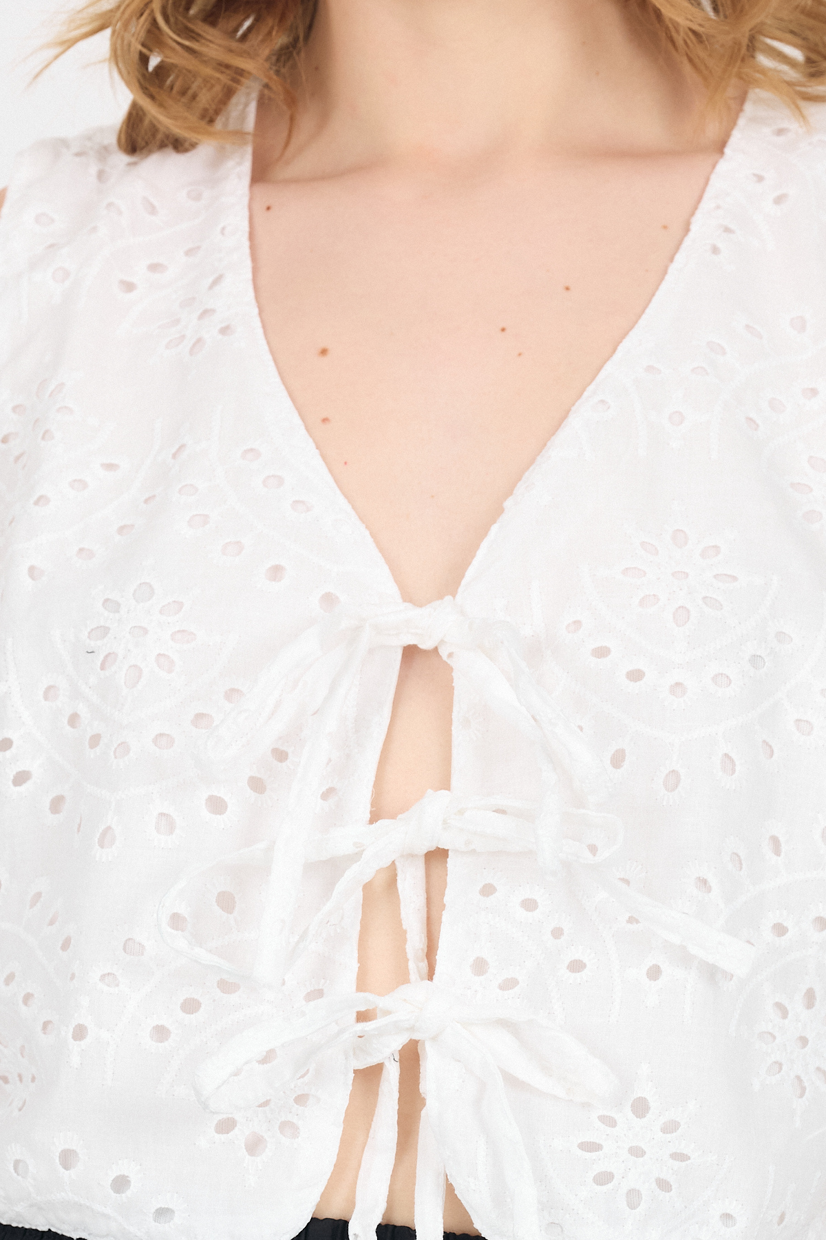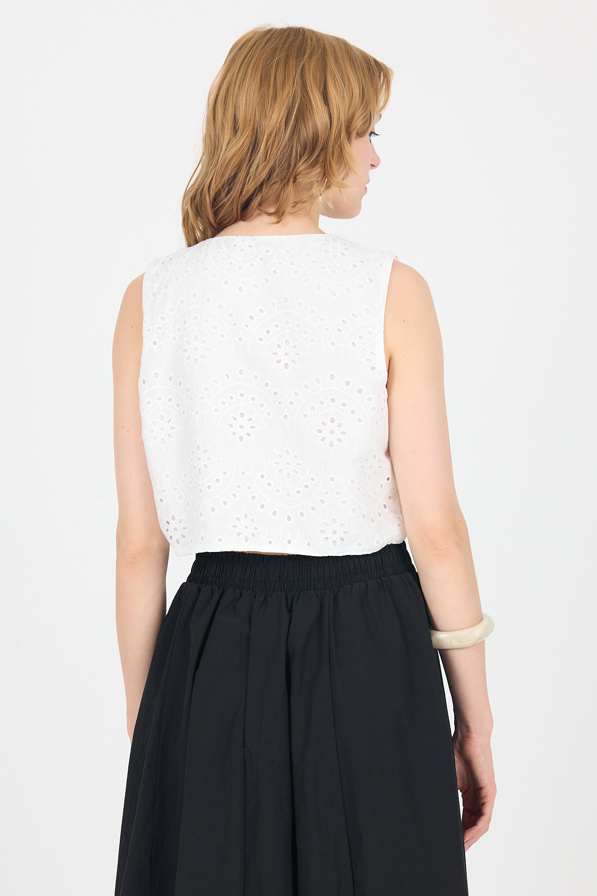 Beyaz Nakışlı Kolsuz Bağlama Detaylı Crop Yelek 8031