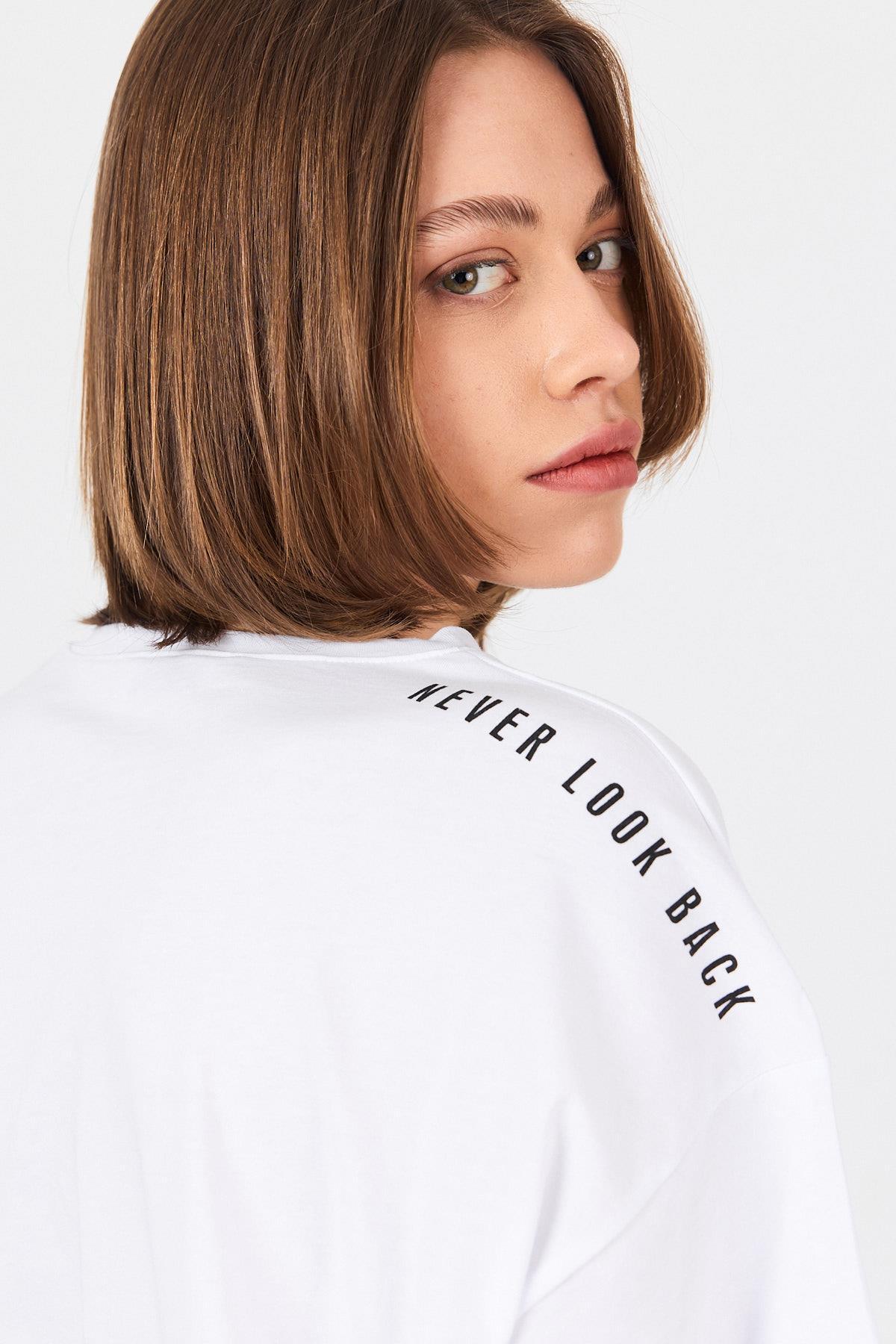 Beyaz Omuz Yazı Baskılı %100 Pamuk Oversize Tişört 2150-30M