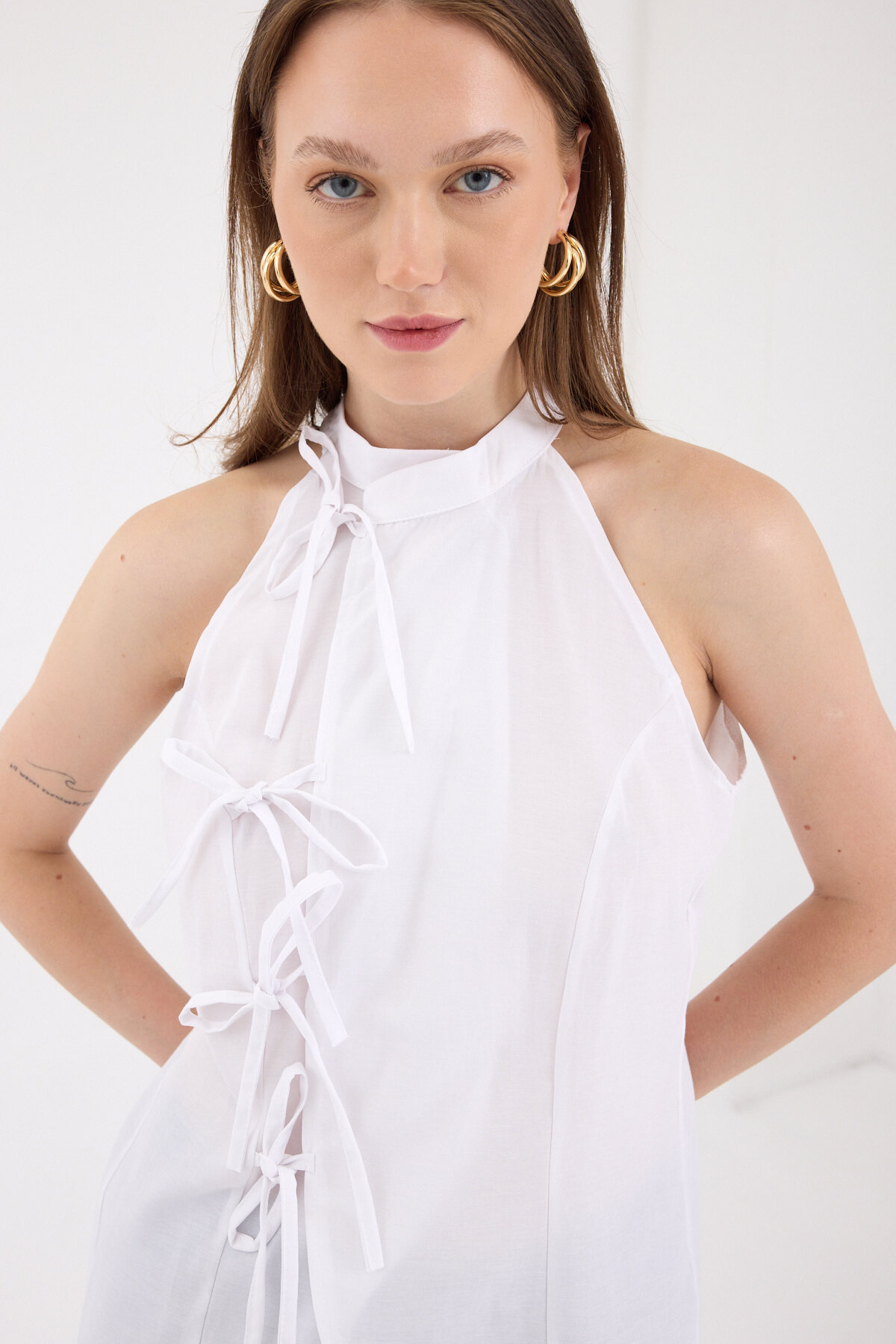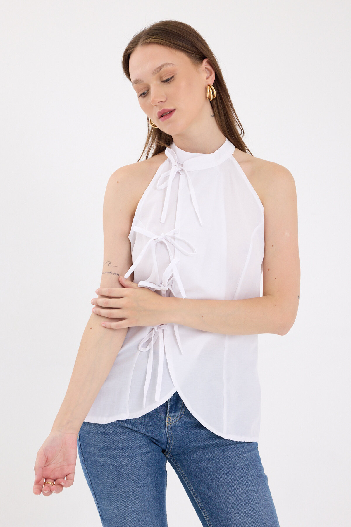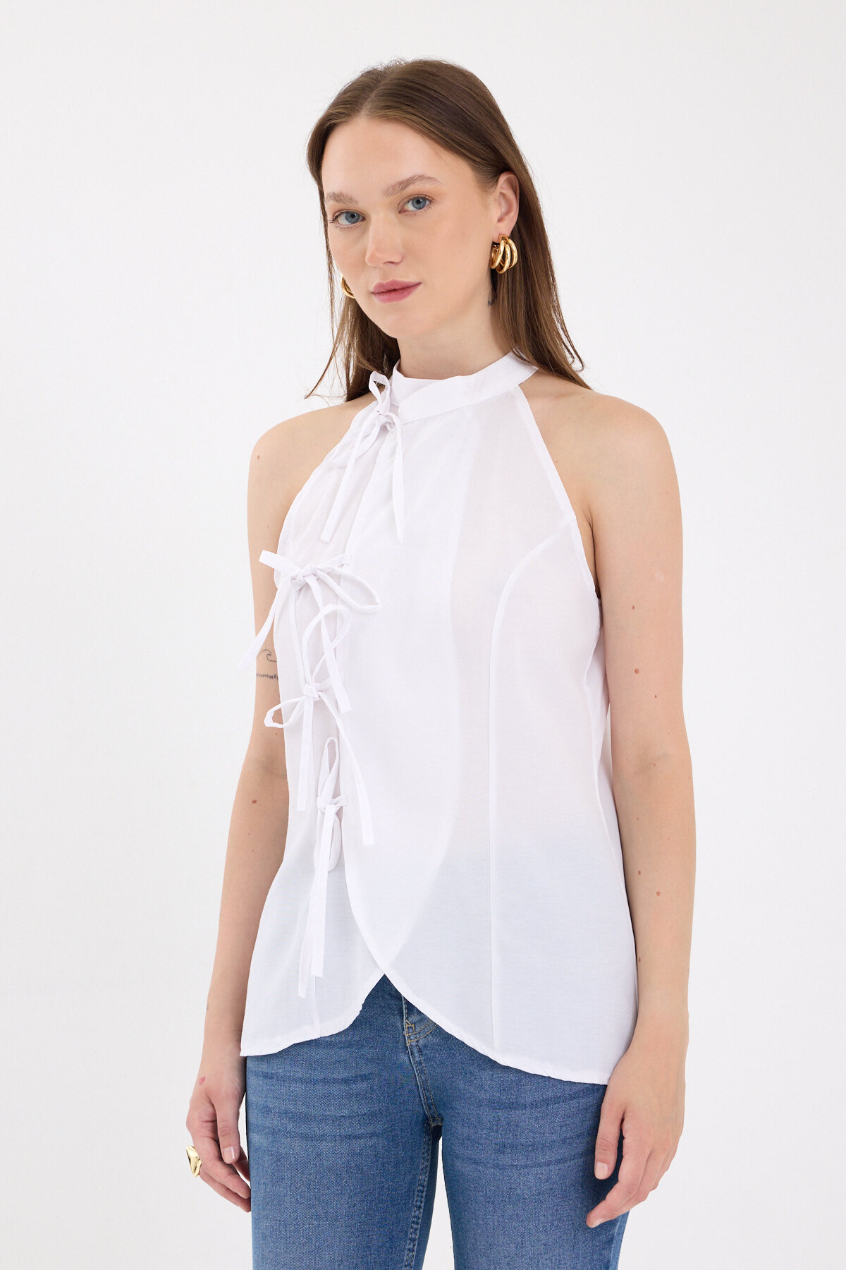 Beyaz Ön Bağlama Detaylı Halter Yaka Bluz 8094A