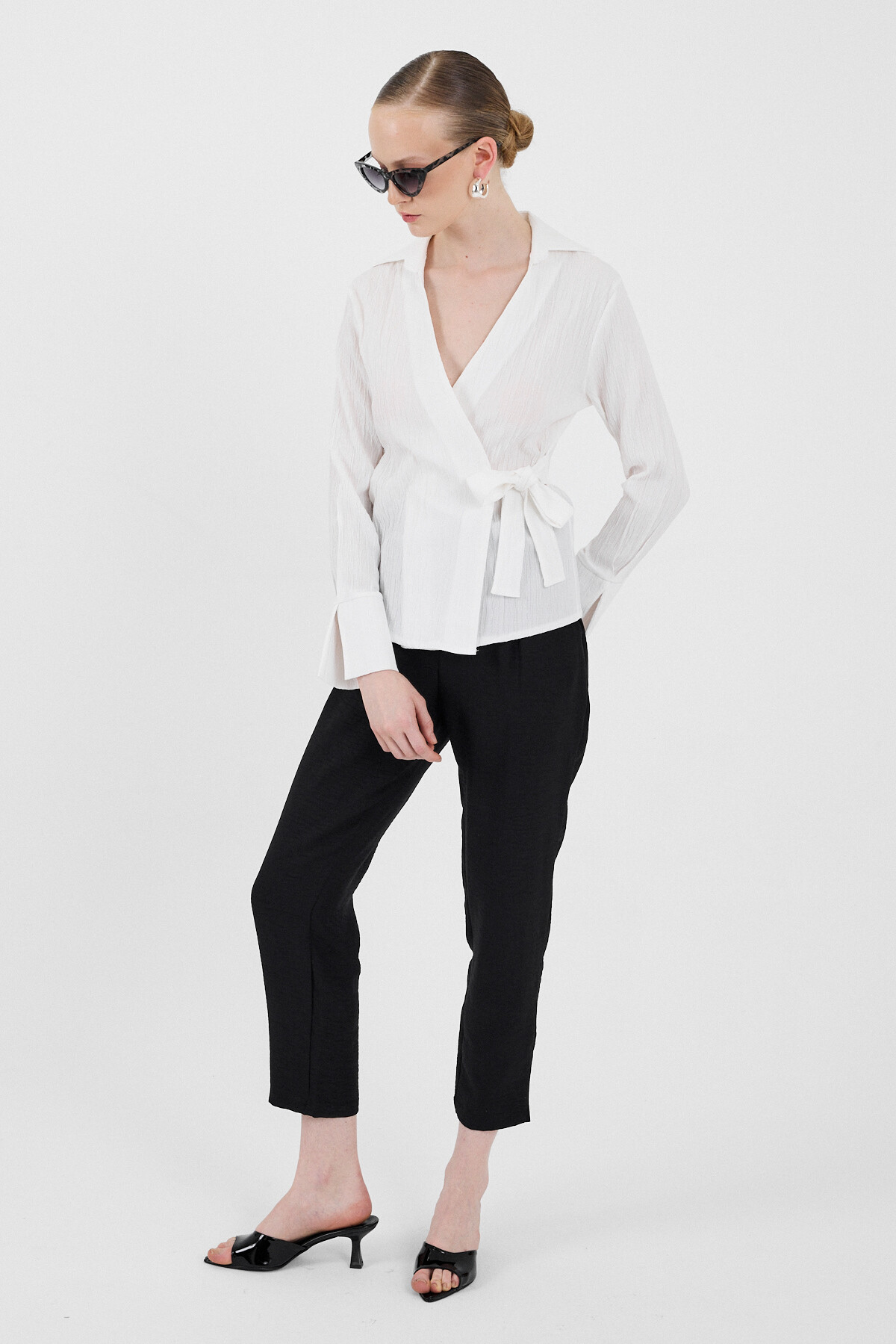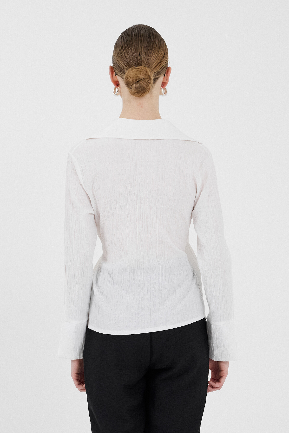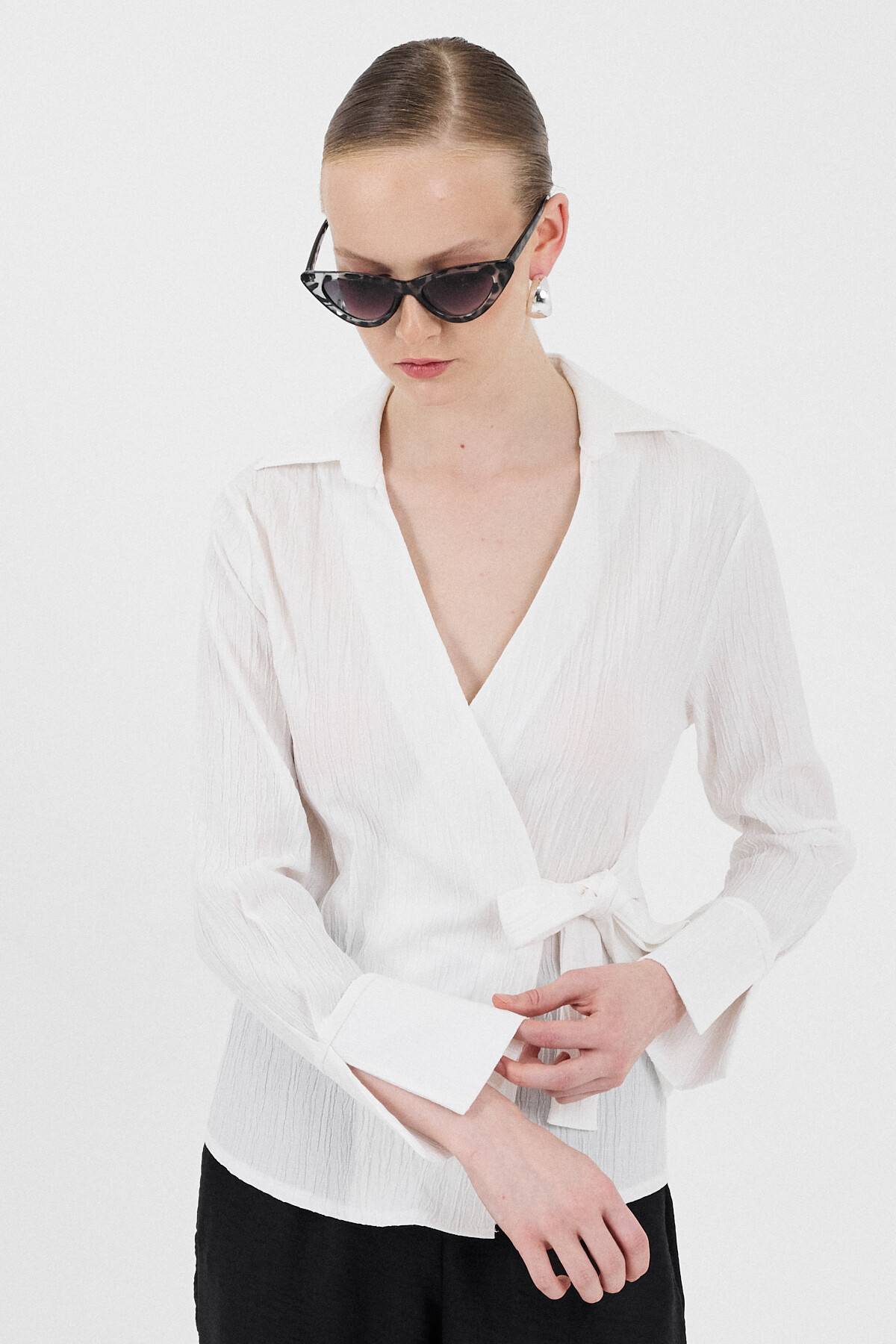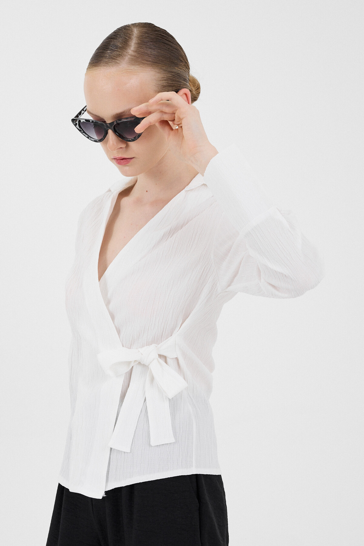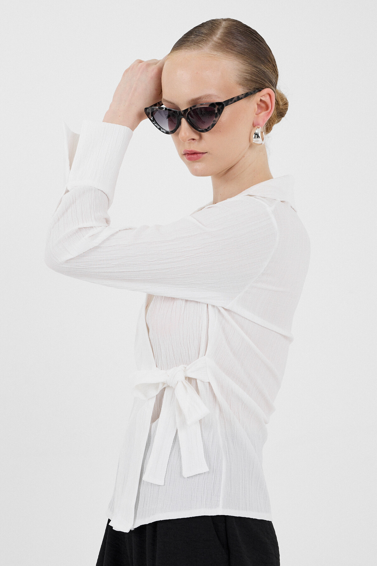 Beyaz Ön Bağlama Detaylı Uzun Kol Bluz 8019A