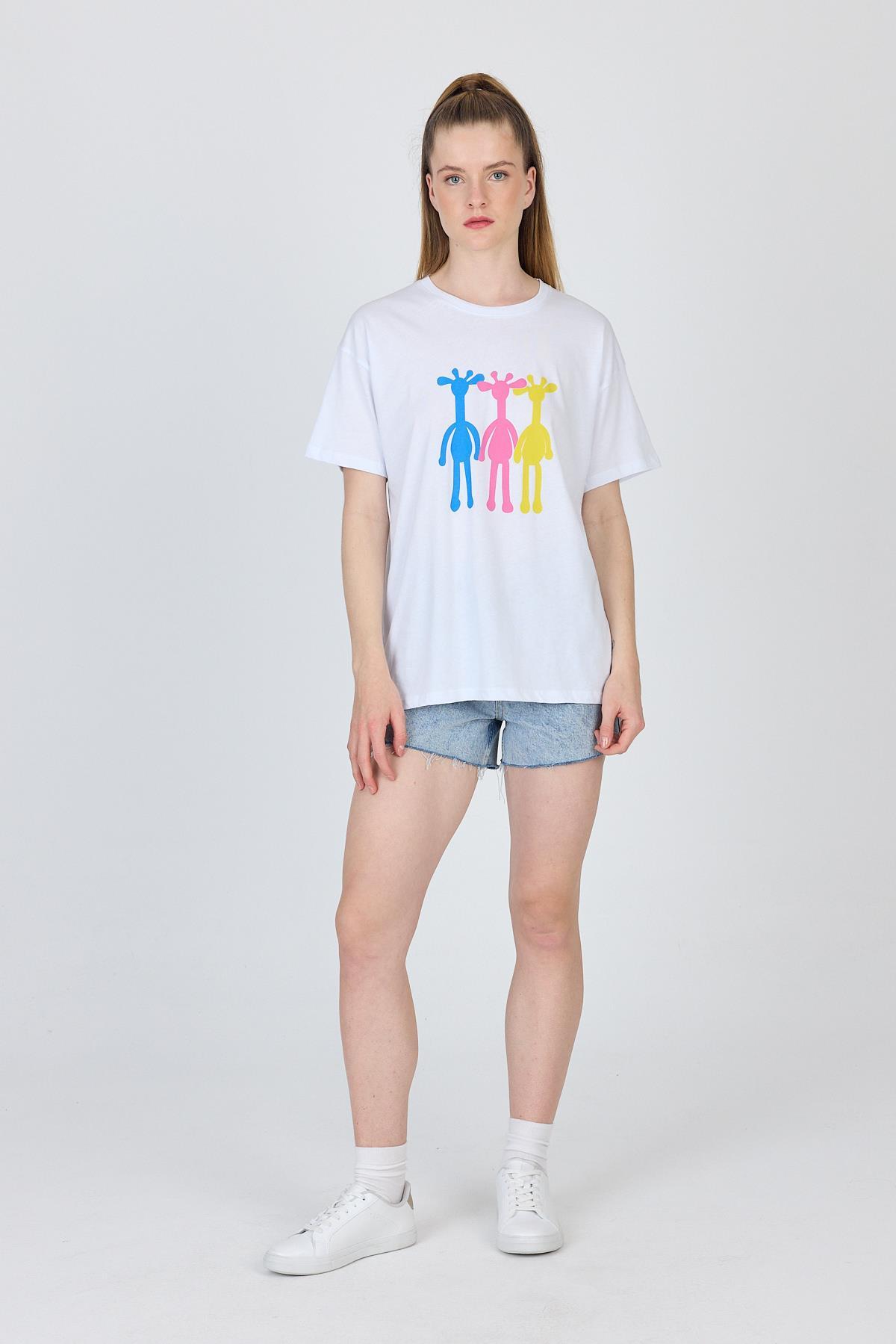 Beyaz Oversize Zürafa Baskılı Tişört 2150-12M