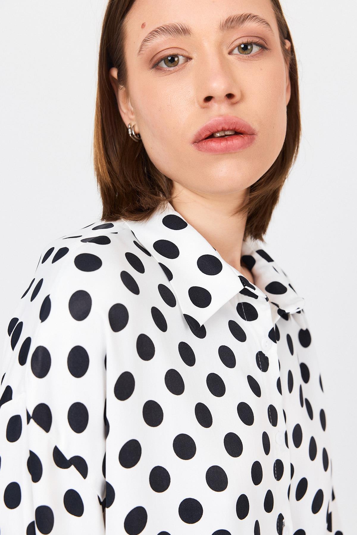 Beyaz Puantiye Desen Oversize Saten Gömlek 9411
