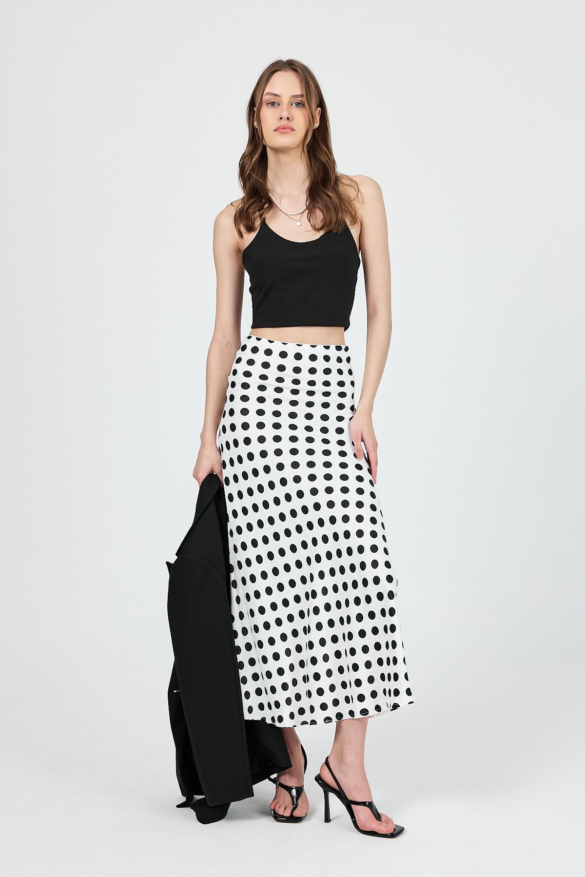 Beyaz Puantiye Desen Saten Midi Etek 9416