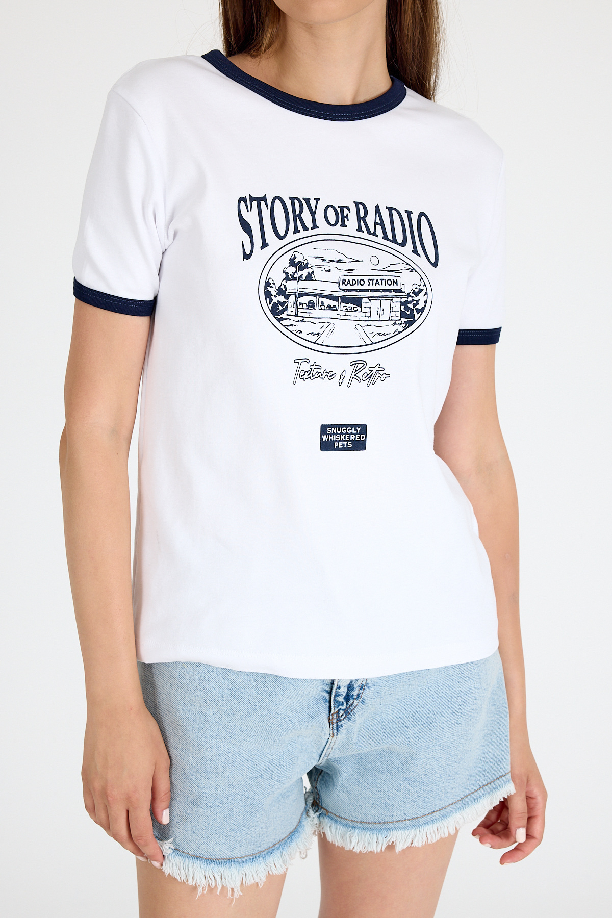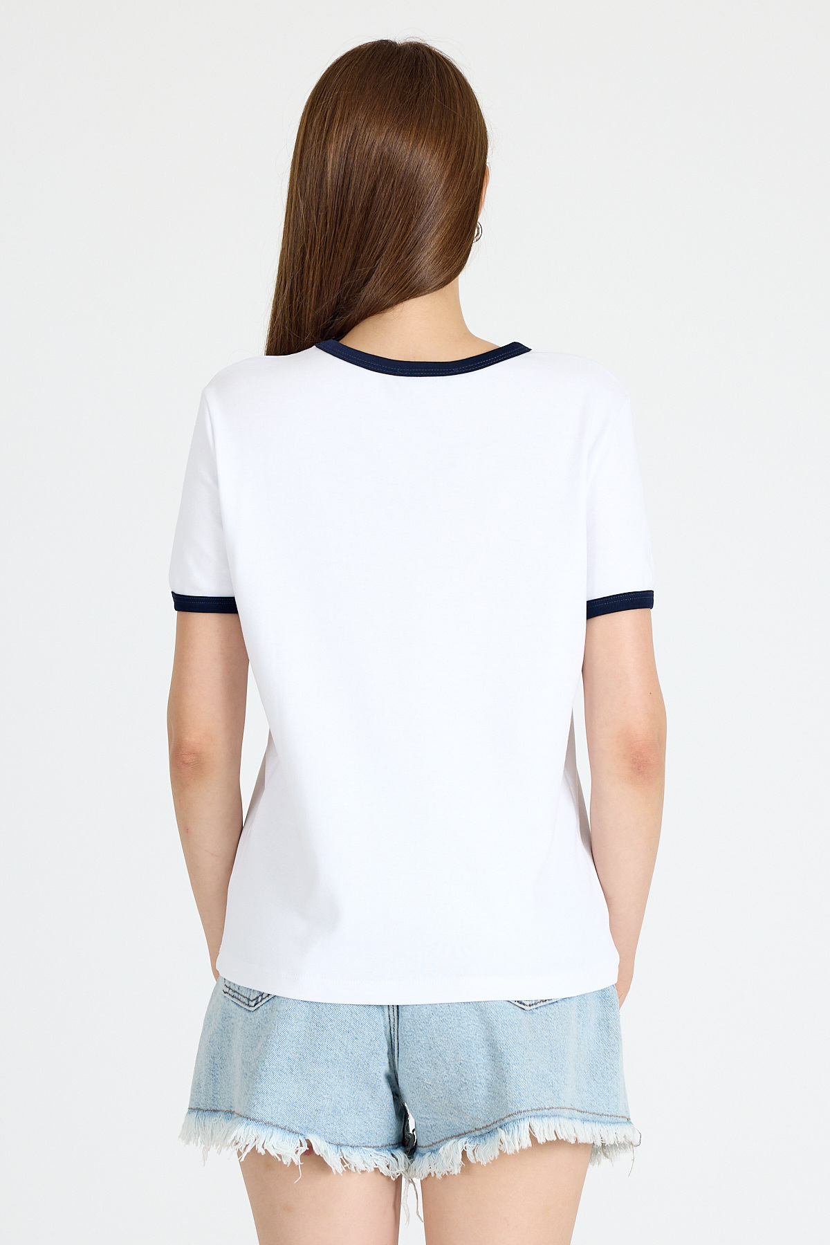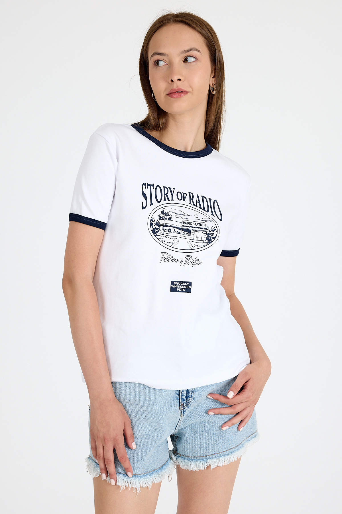 Beyaz Ribana Yaka ve Kol Detaylı Yazı Baskılı Tişört 5875