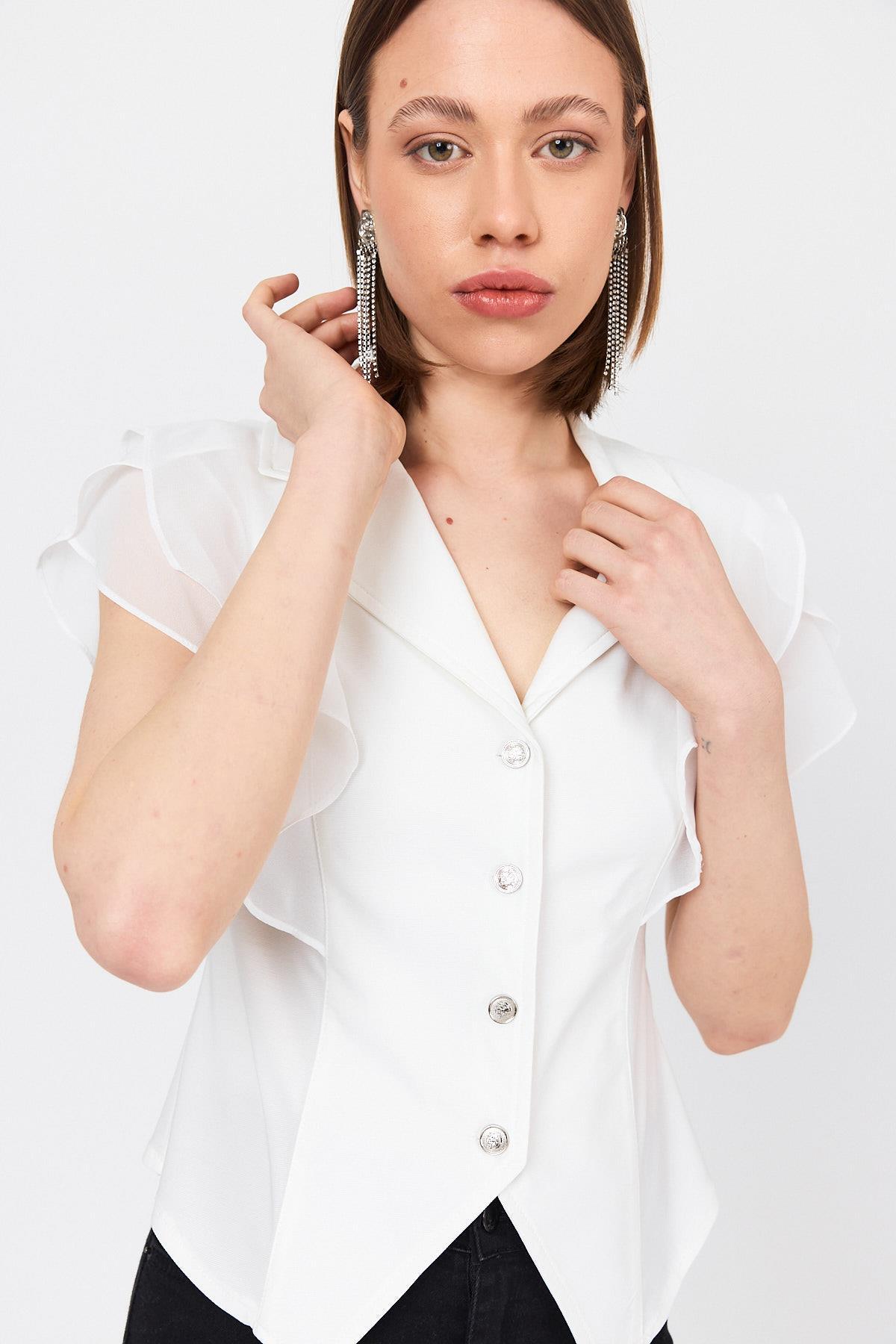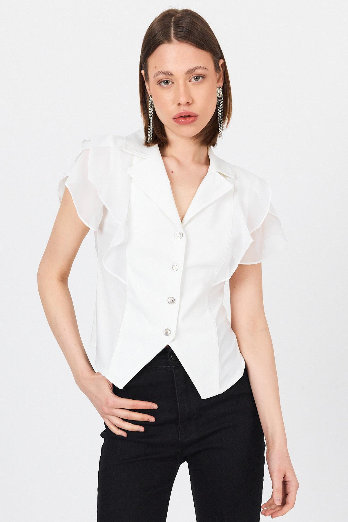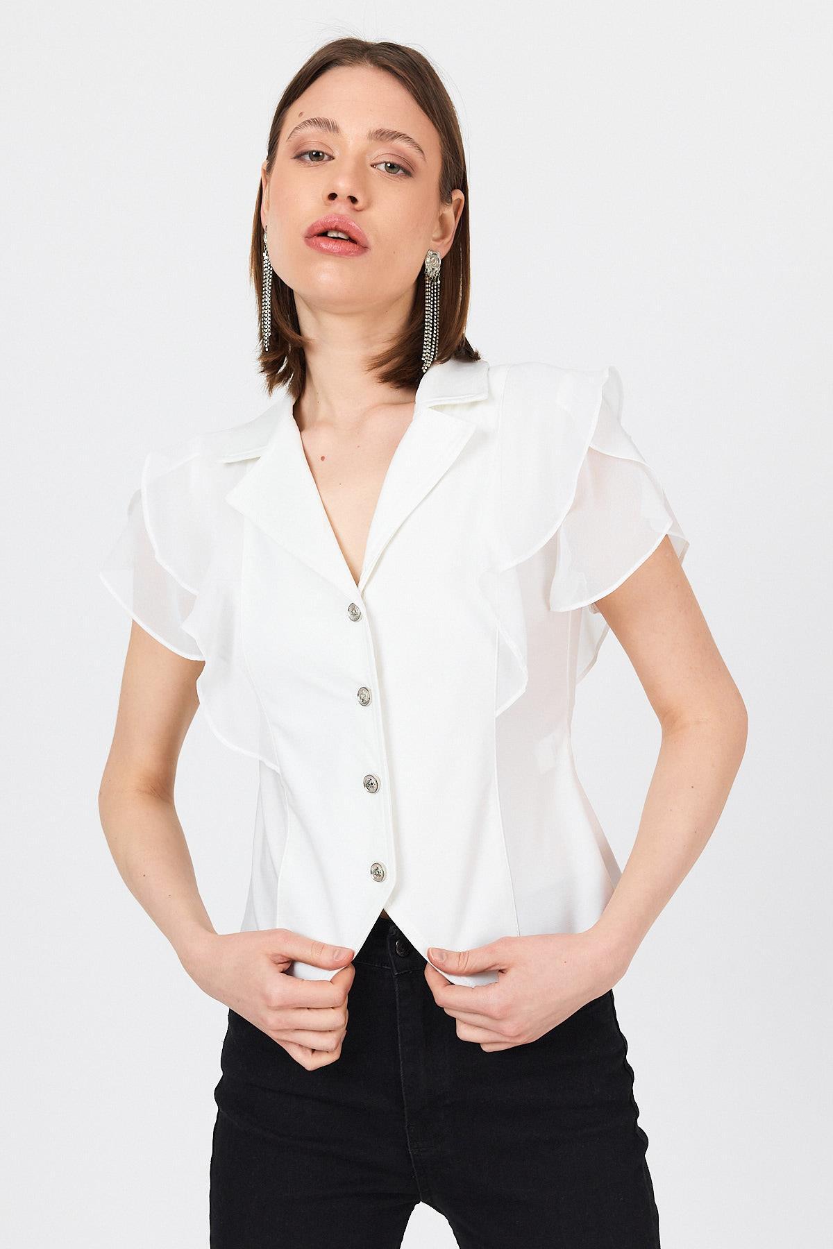 Beyaz Şifon Kol Detaylı Fırfırlı Düğmeli Bluz 9477