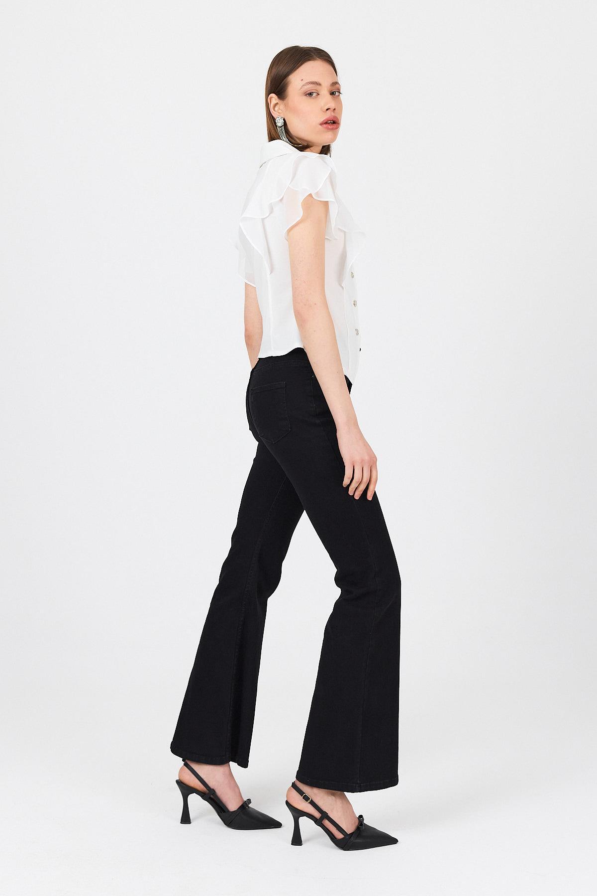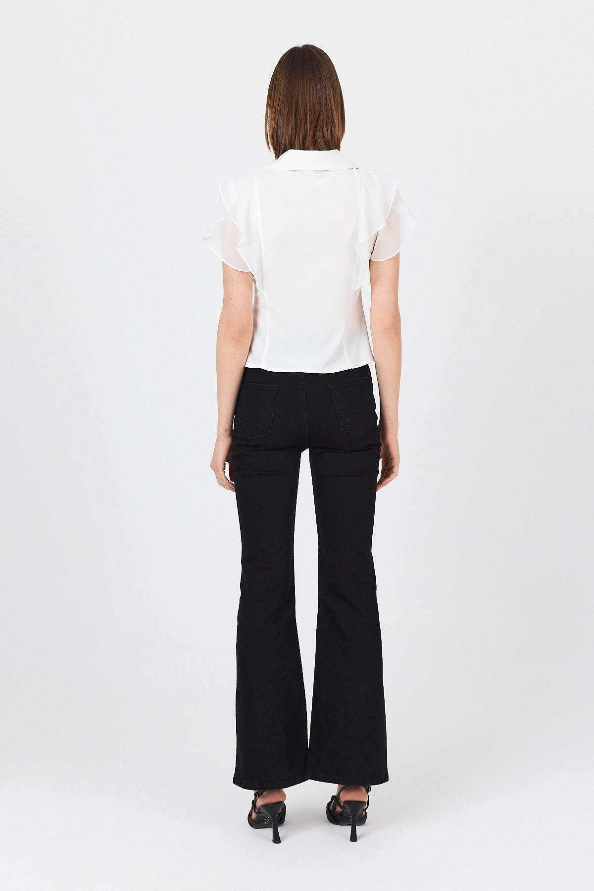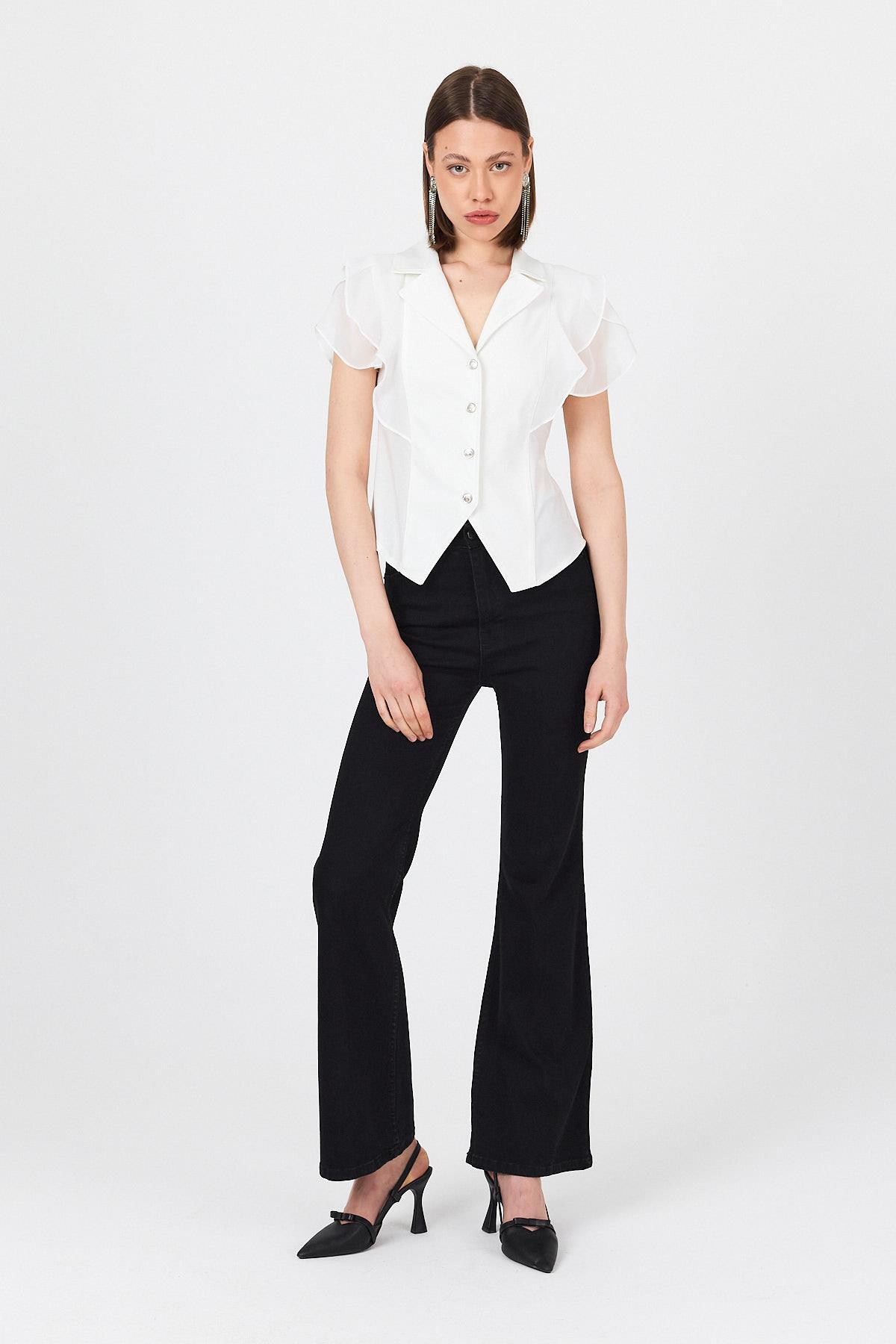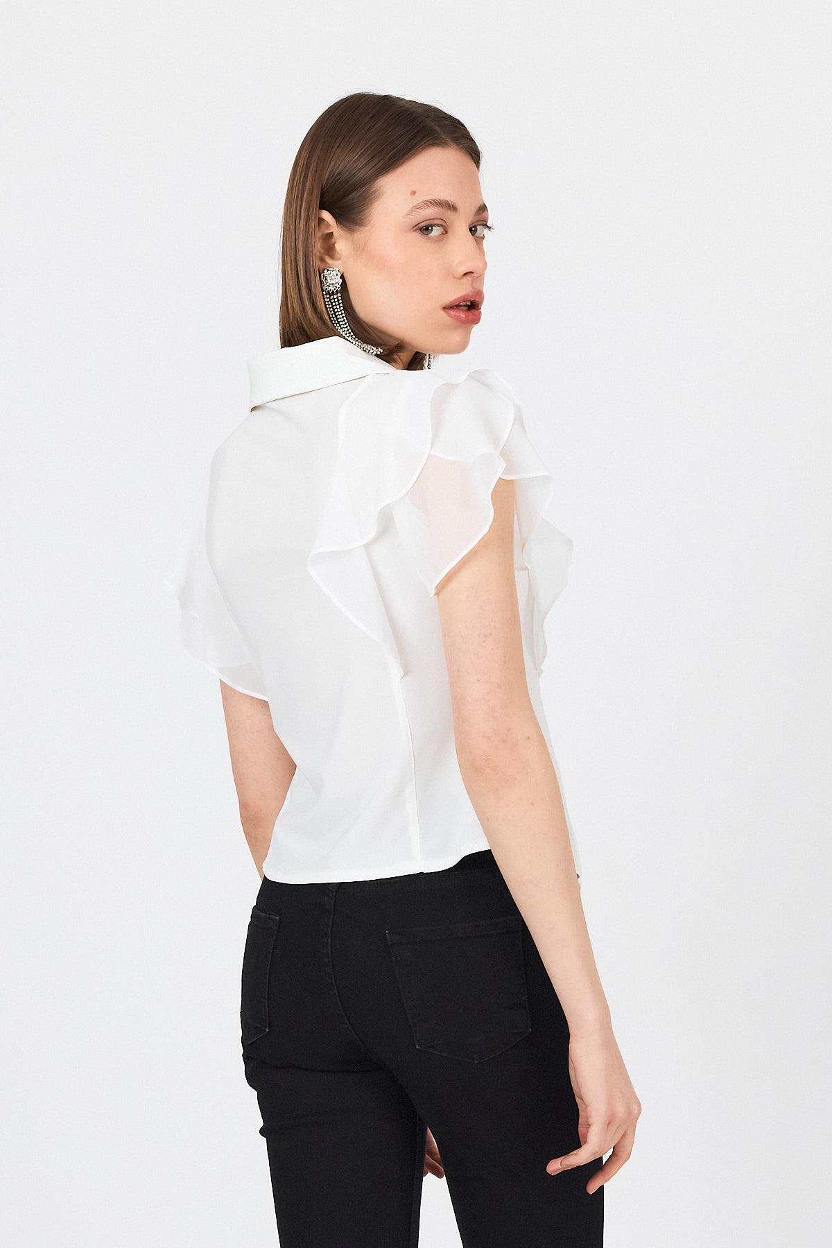 Beyaz Şifon Kol Detaylı Fırfırlı Düğmeli Bluz 9477