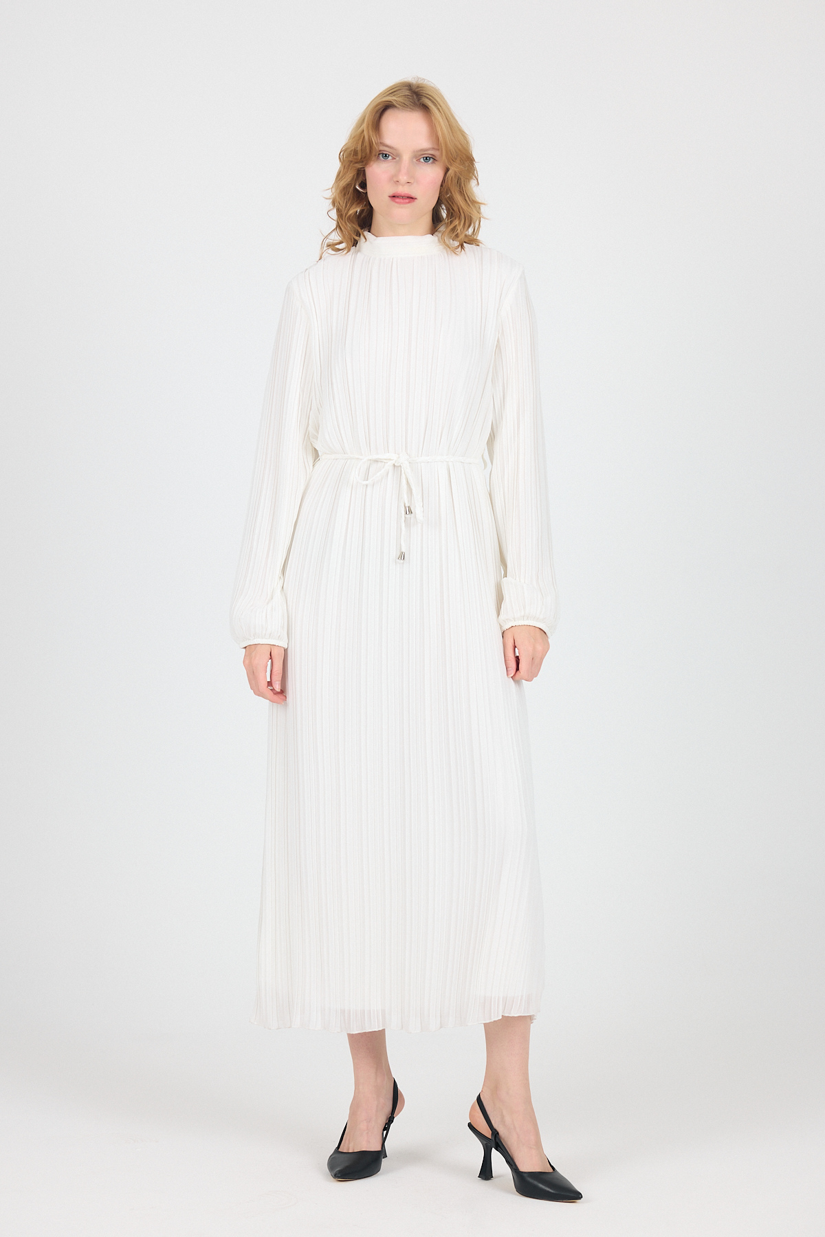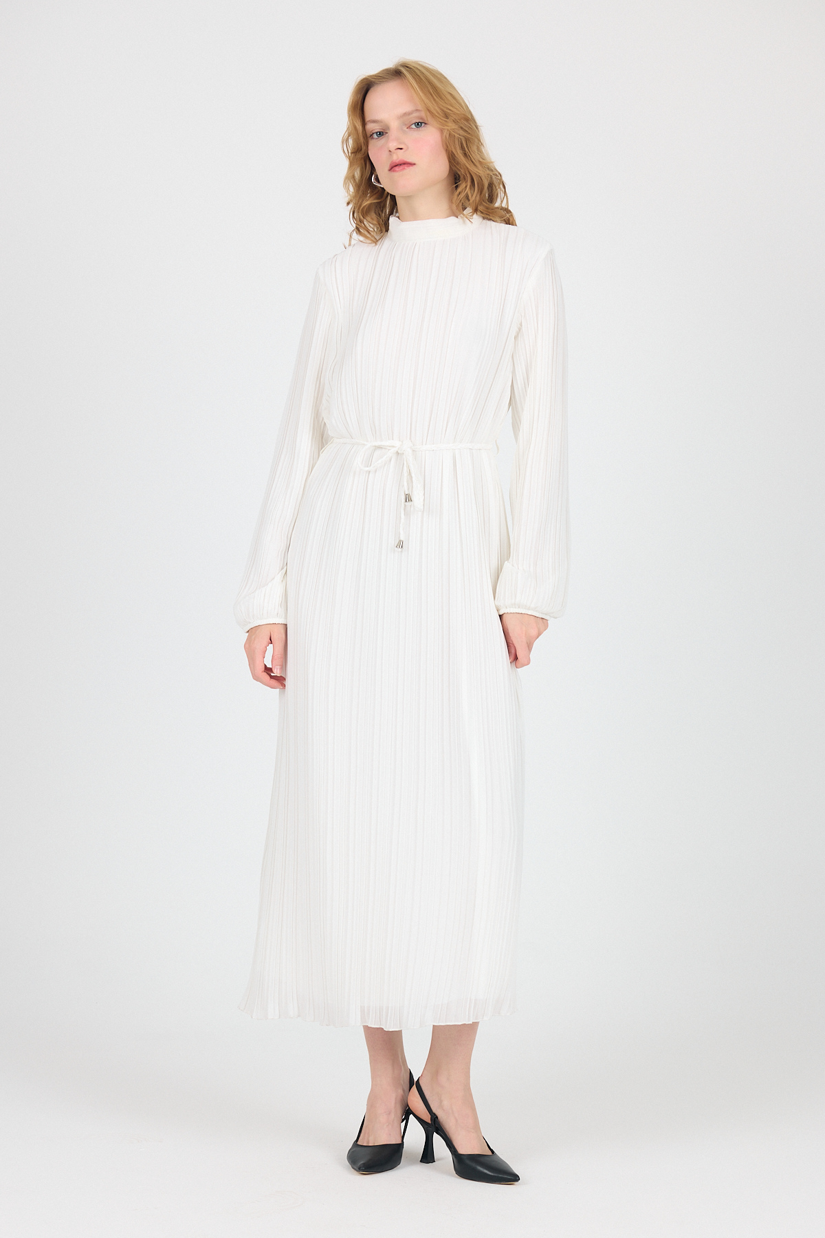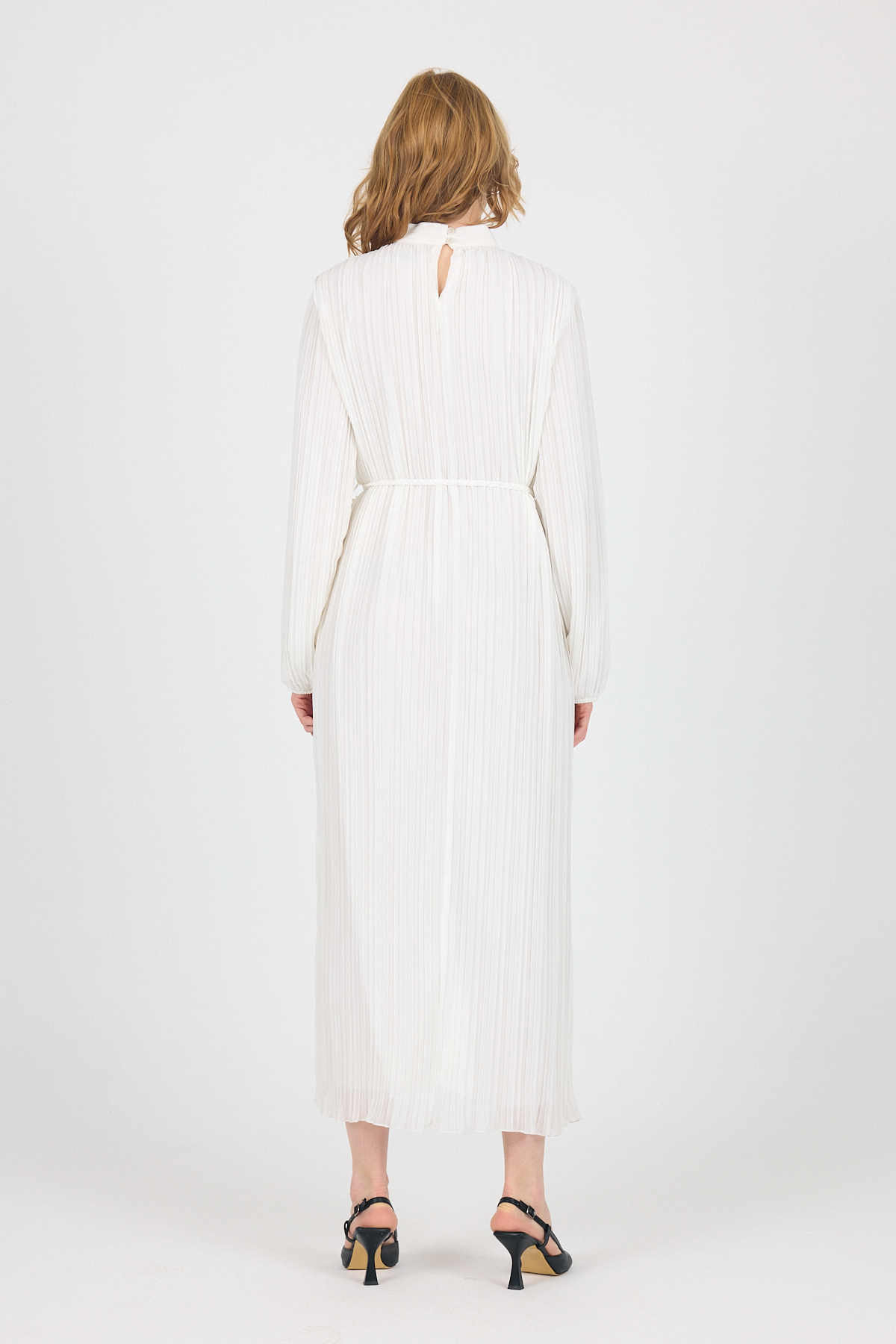 Beyaz Şifon Uzun Kollu Pileli Bel Bağlamalı Midi Elbise 020