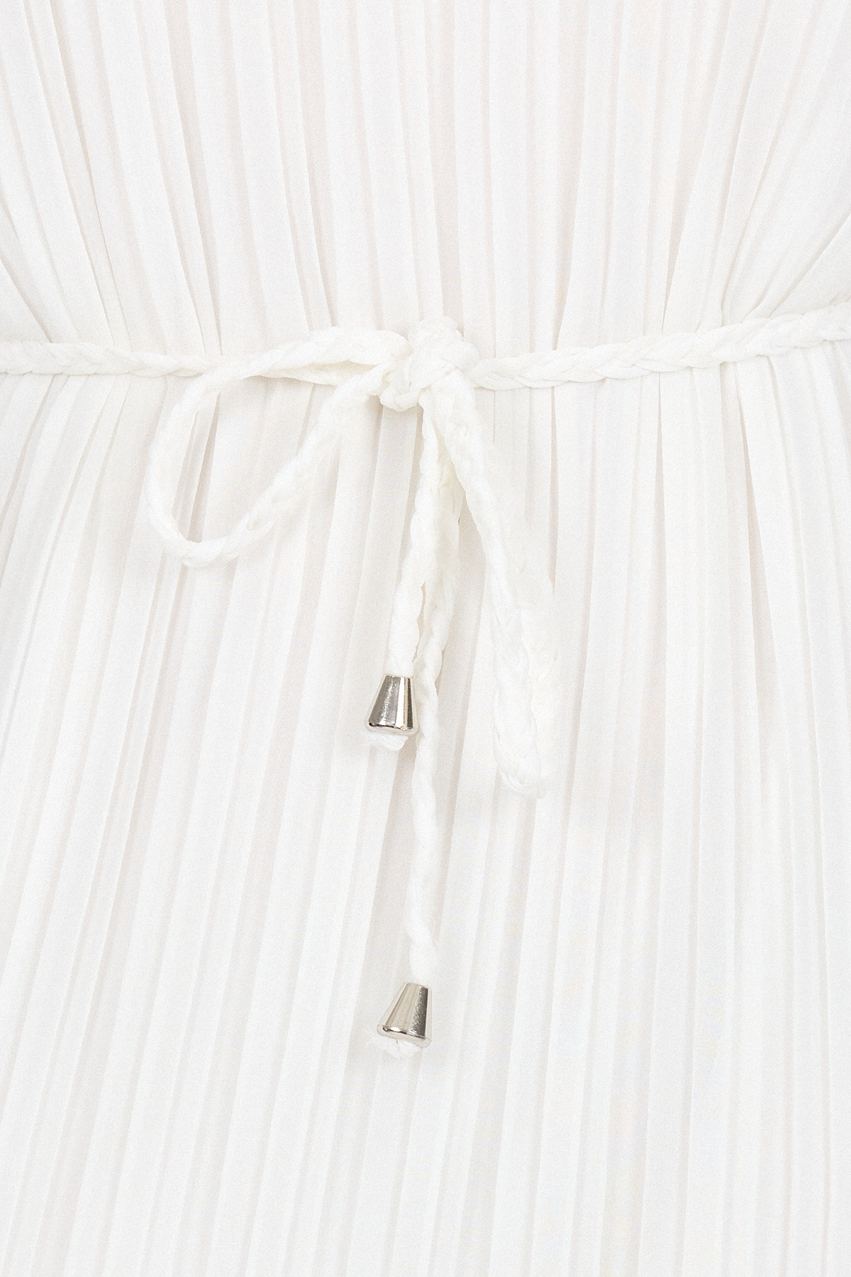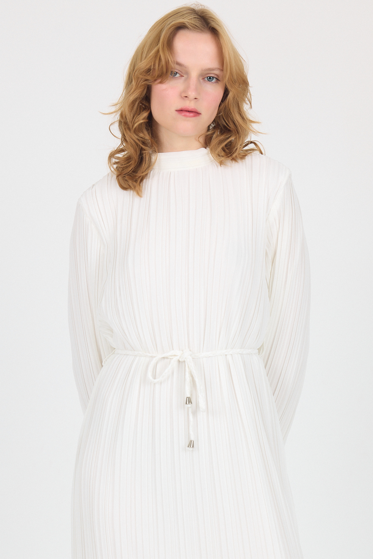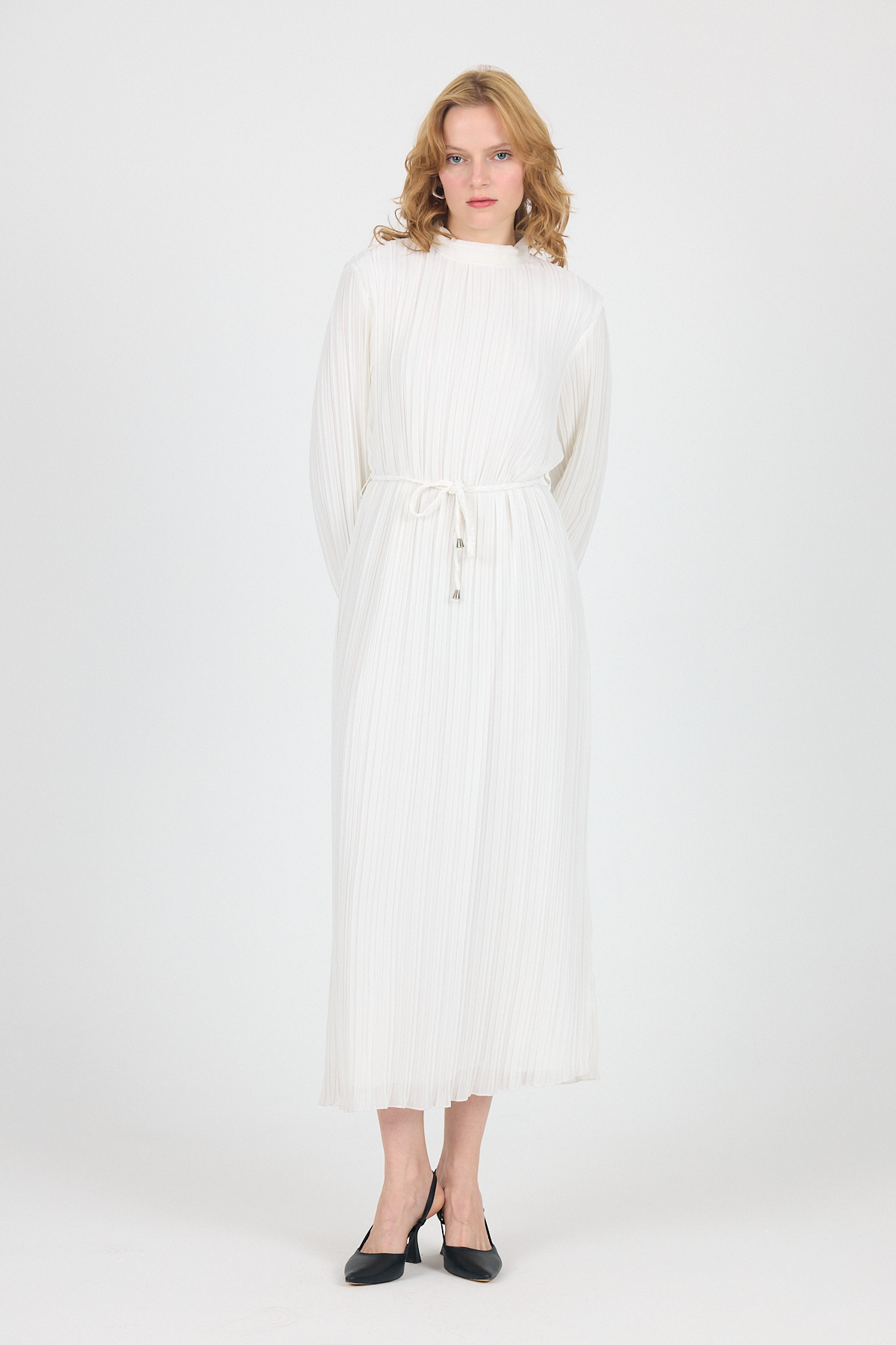 Beyaz Şifon Uzun Kollu Pileli Bel Bağlamalı Midi Elbise 020