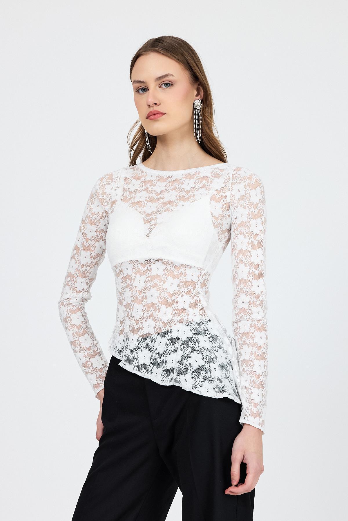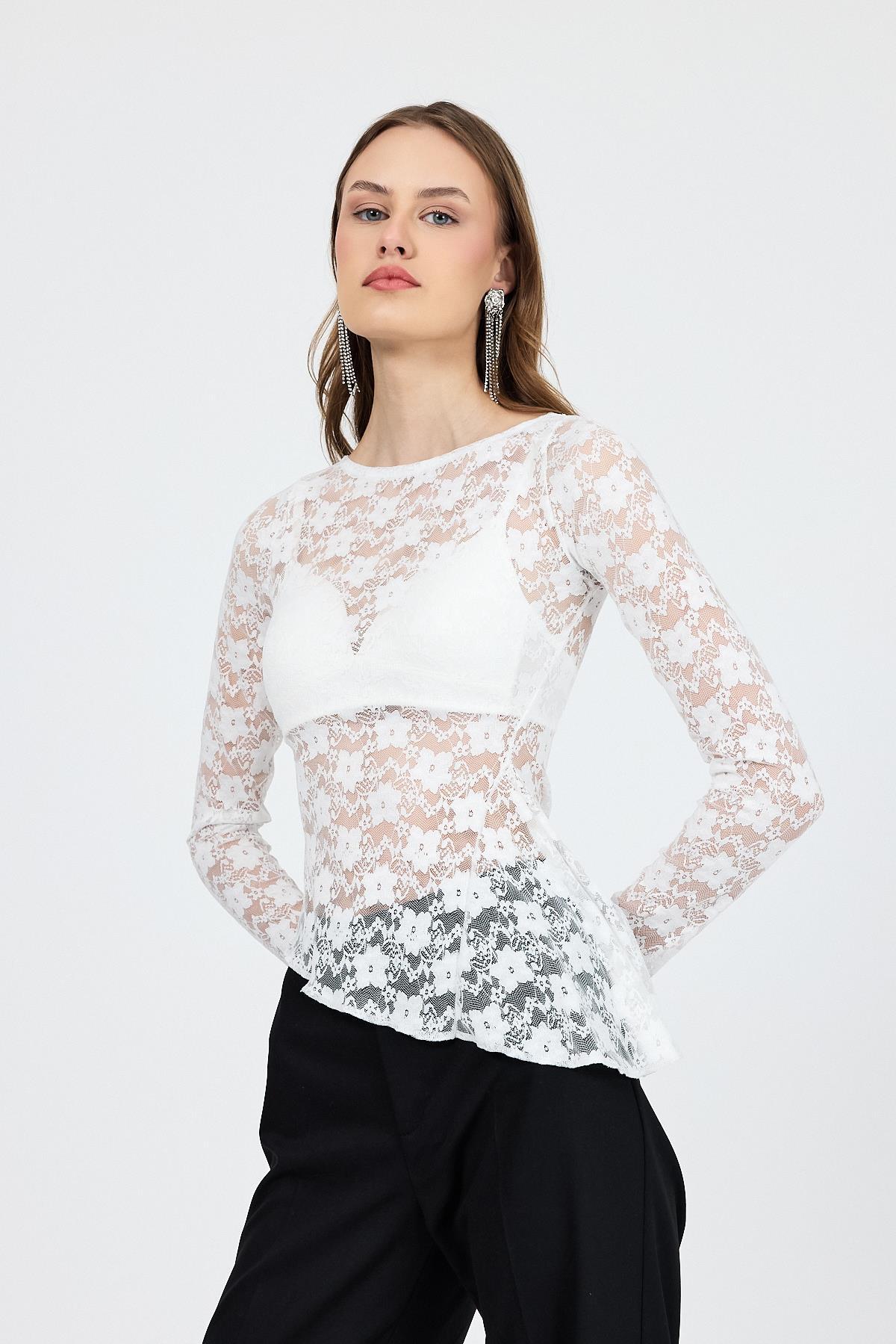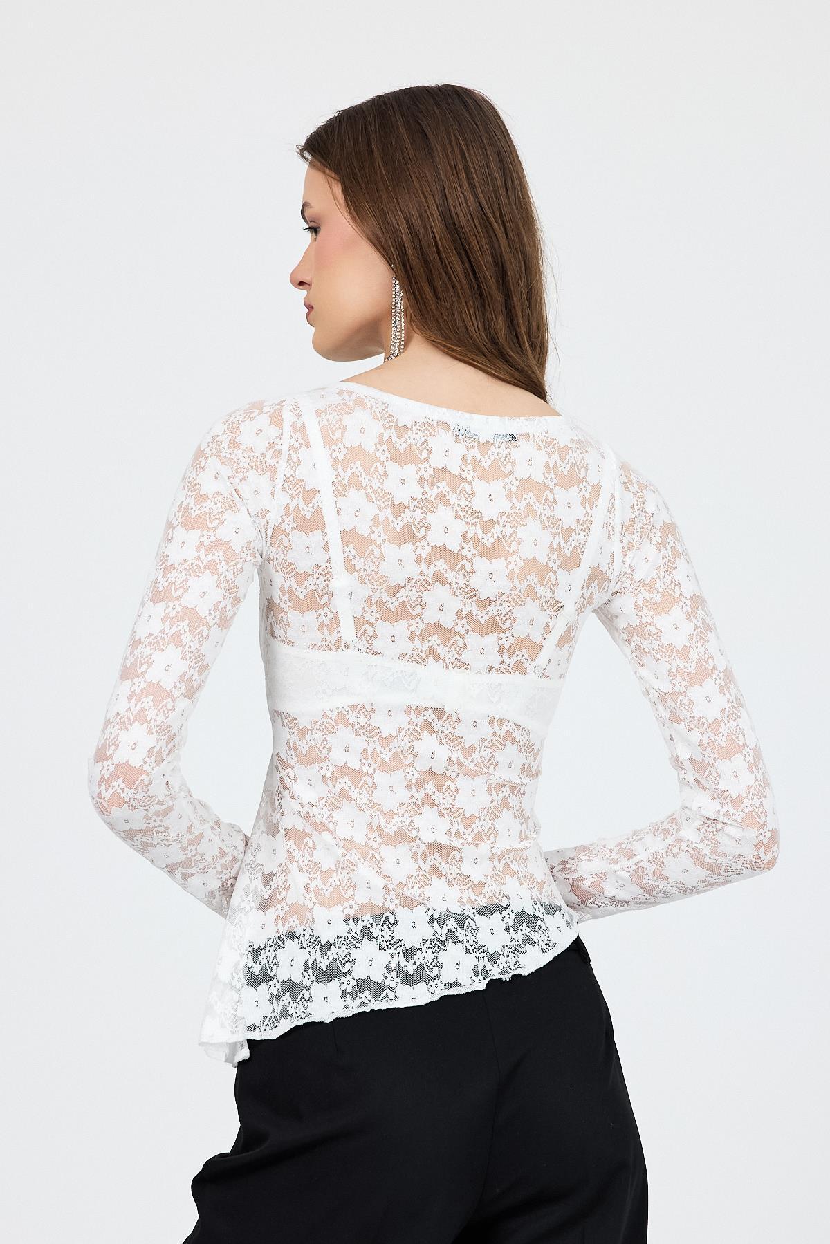 Beyaz Uzun Kollu Transparan Dantel Bluz 13288