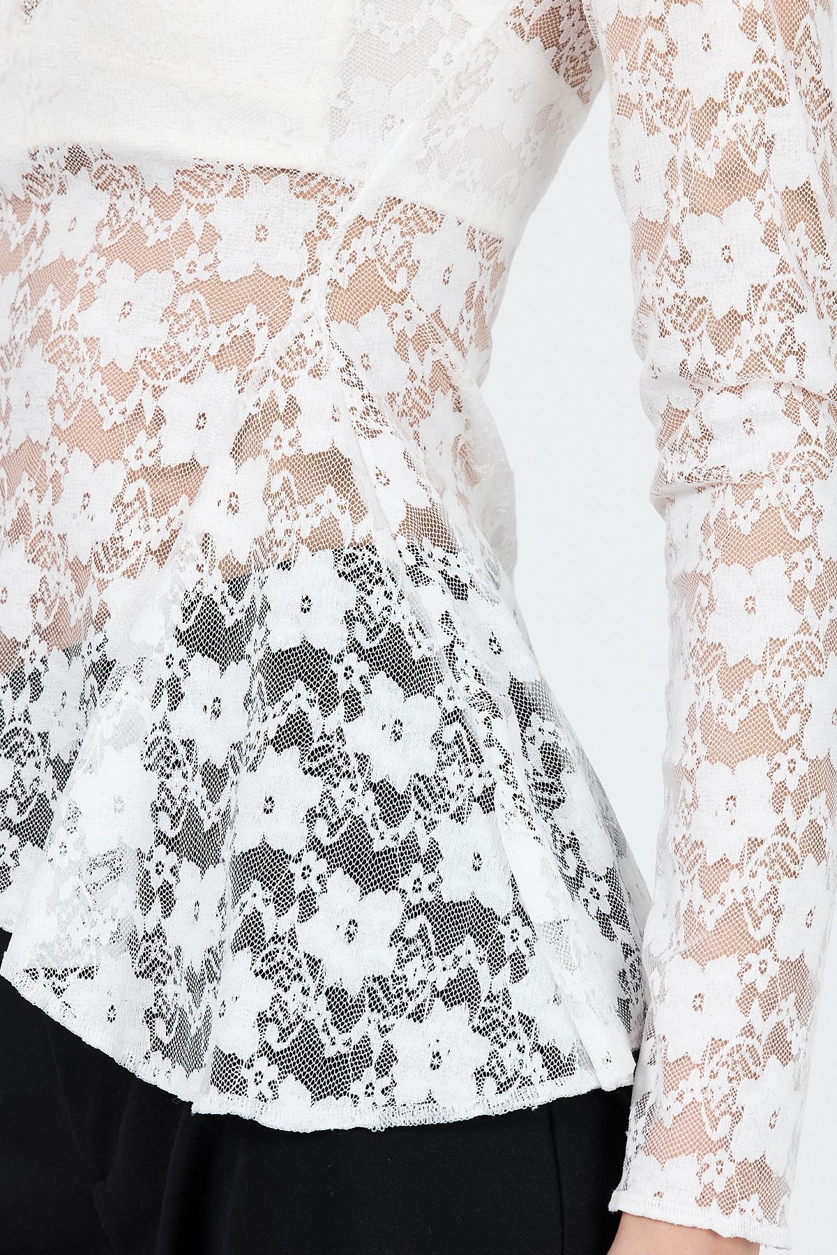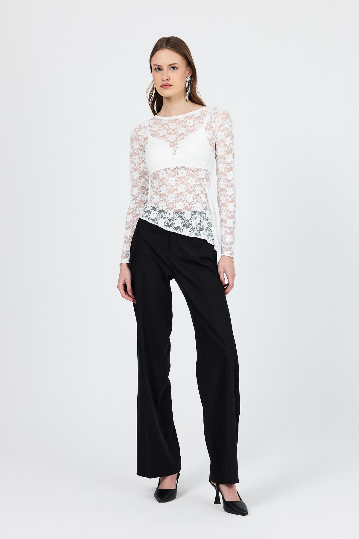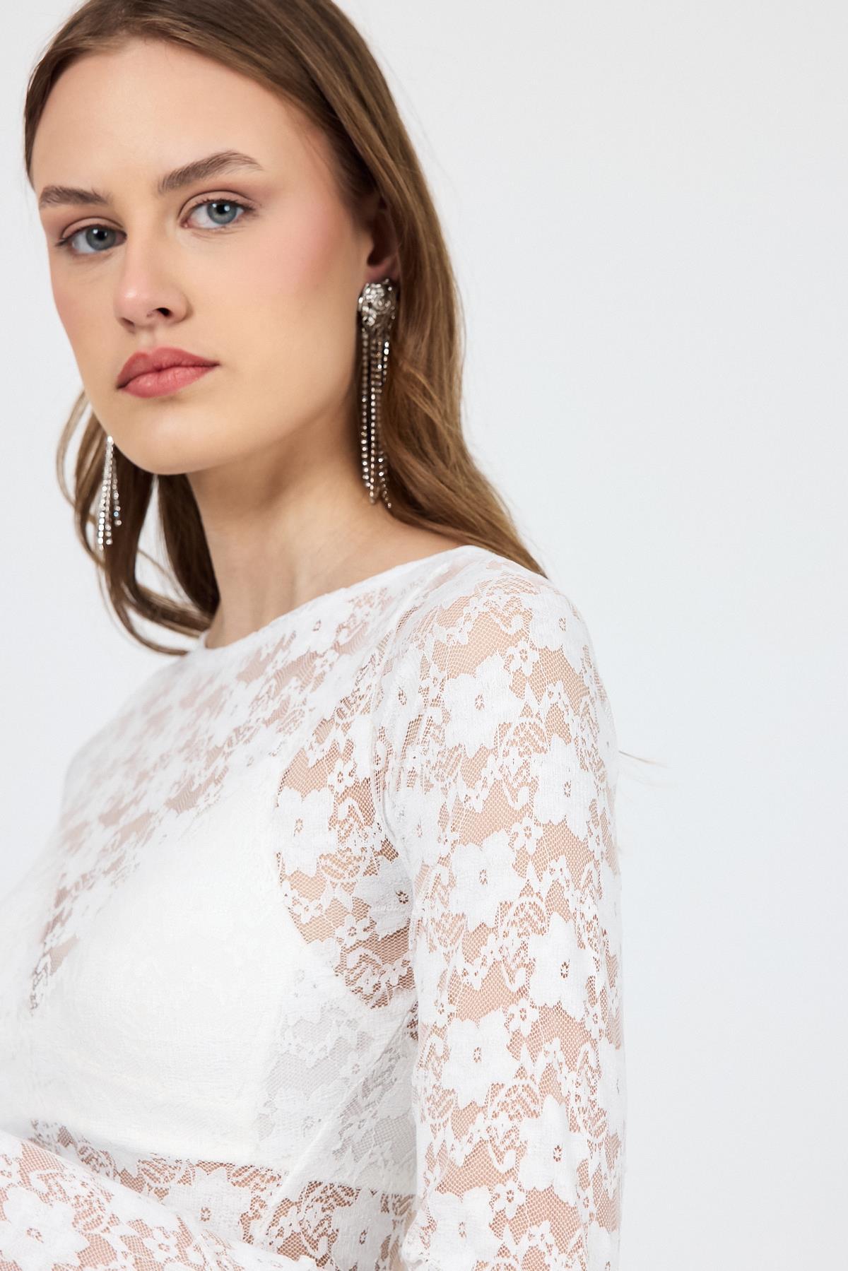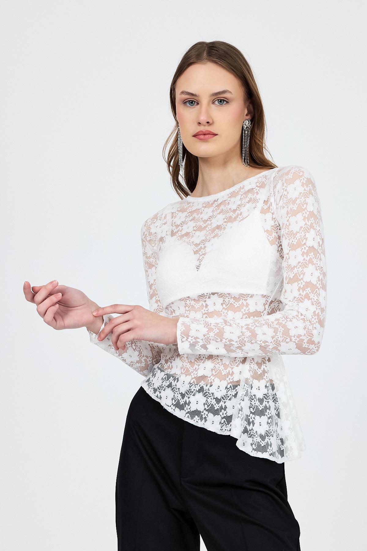 Beyaz Uzun Kollu Transparan Dantel Bluz 13288