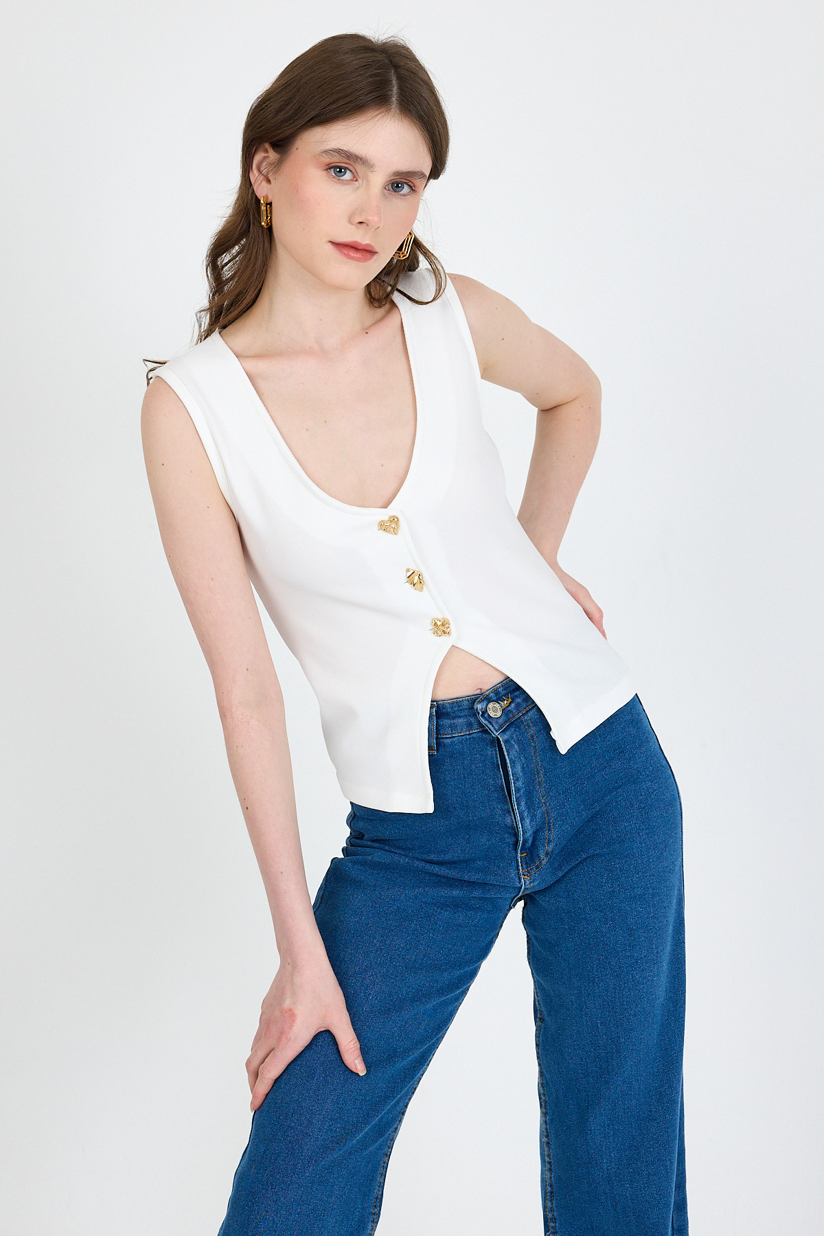 Beyaz V Yaka Düğme Detaylı Kolsuz Bluz 018