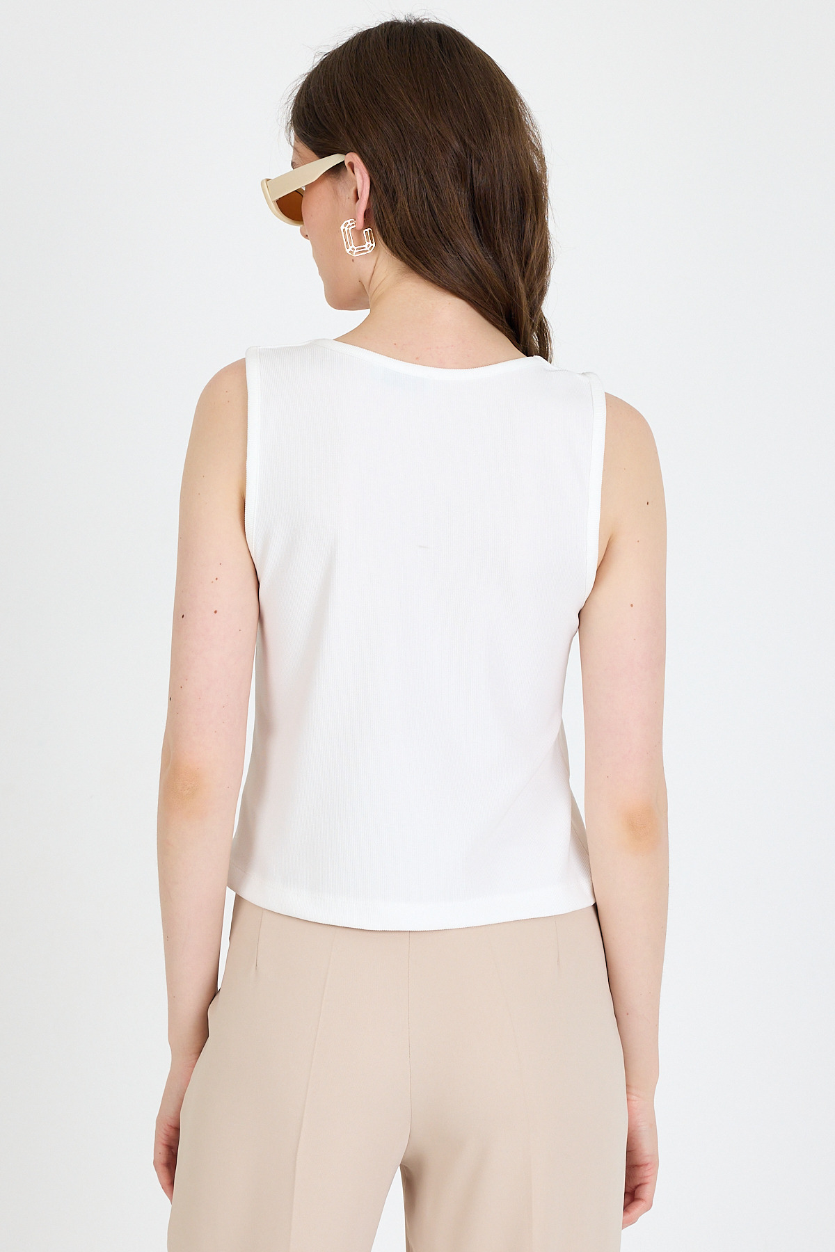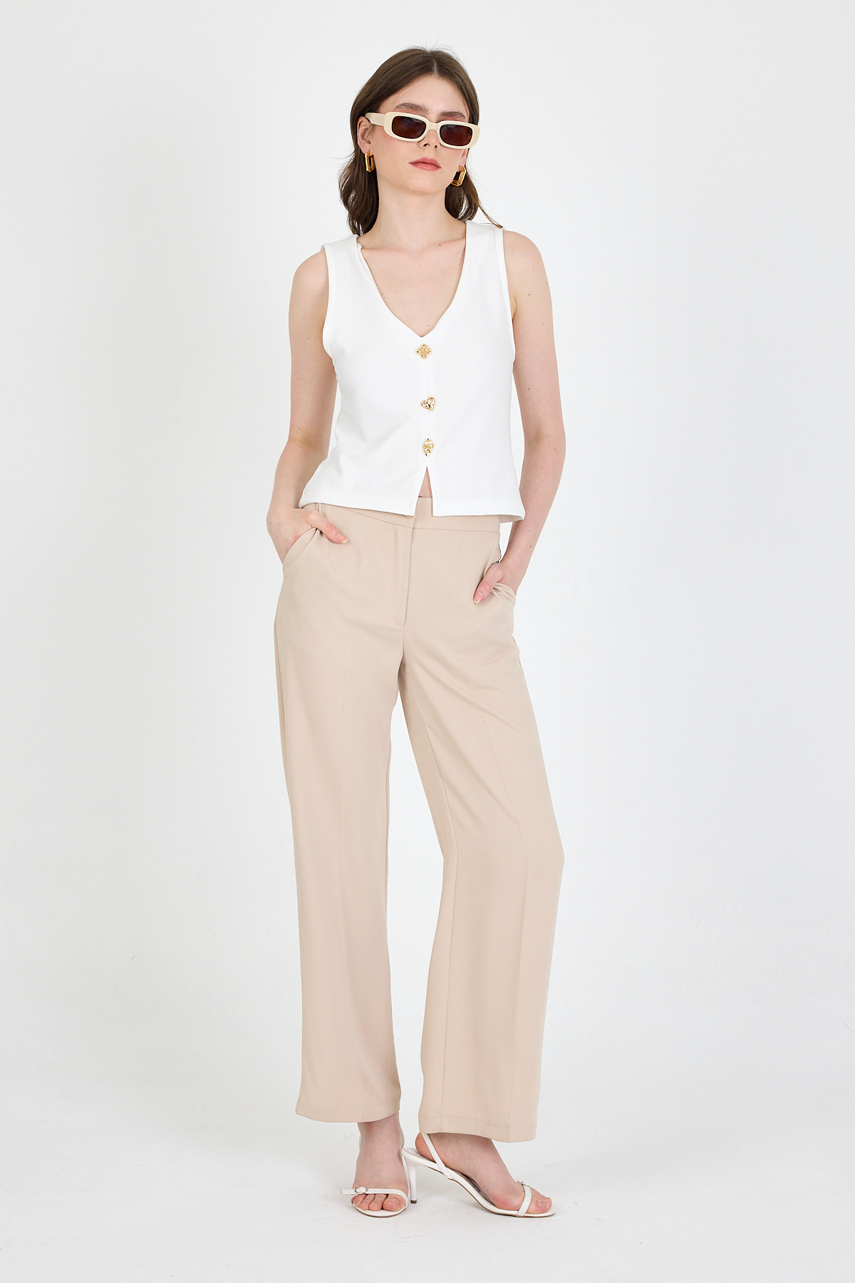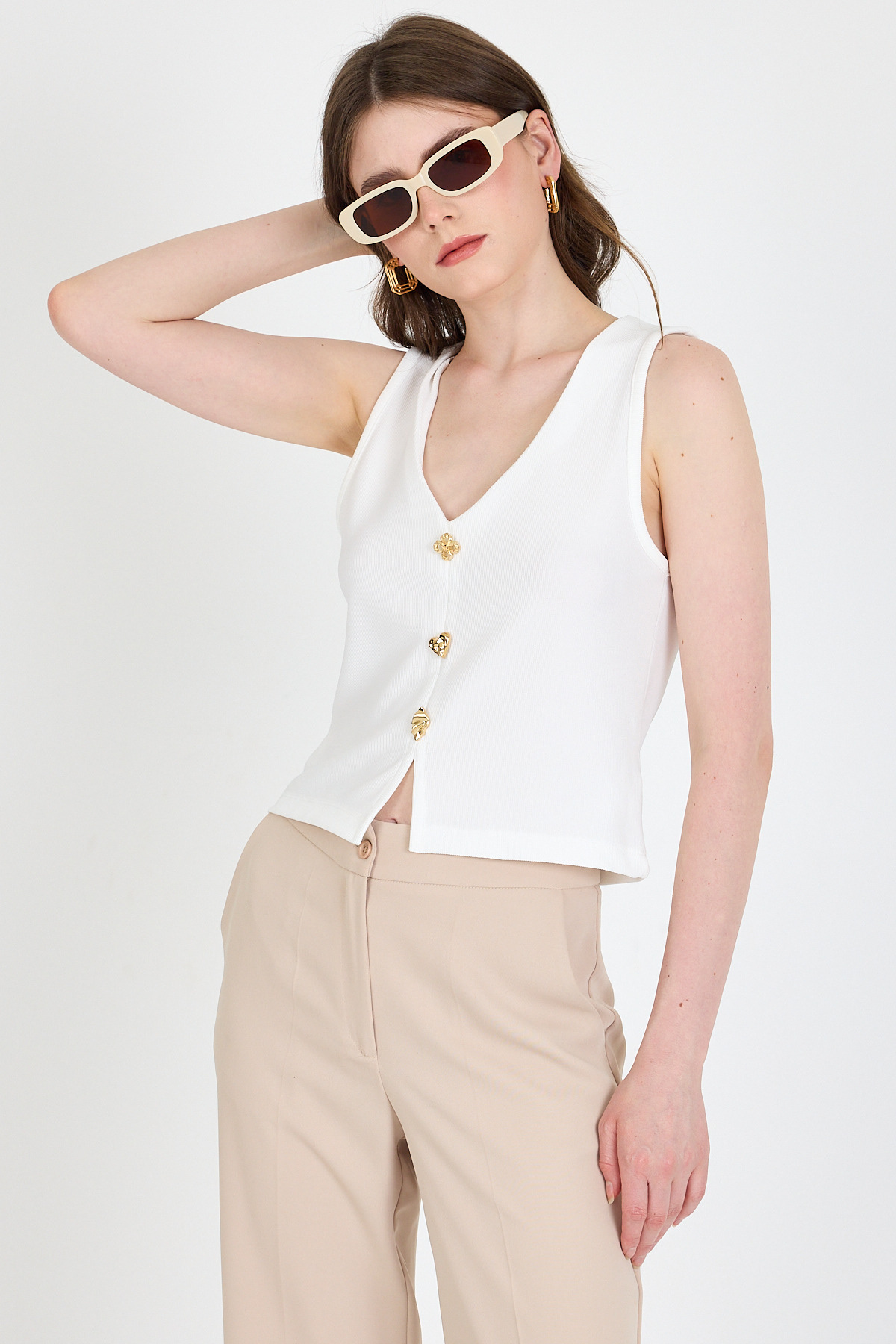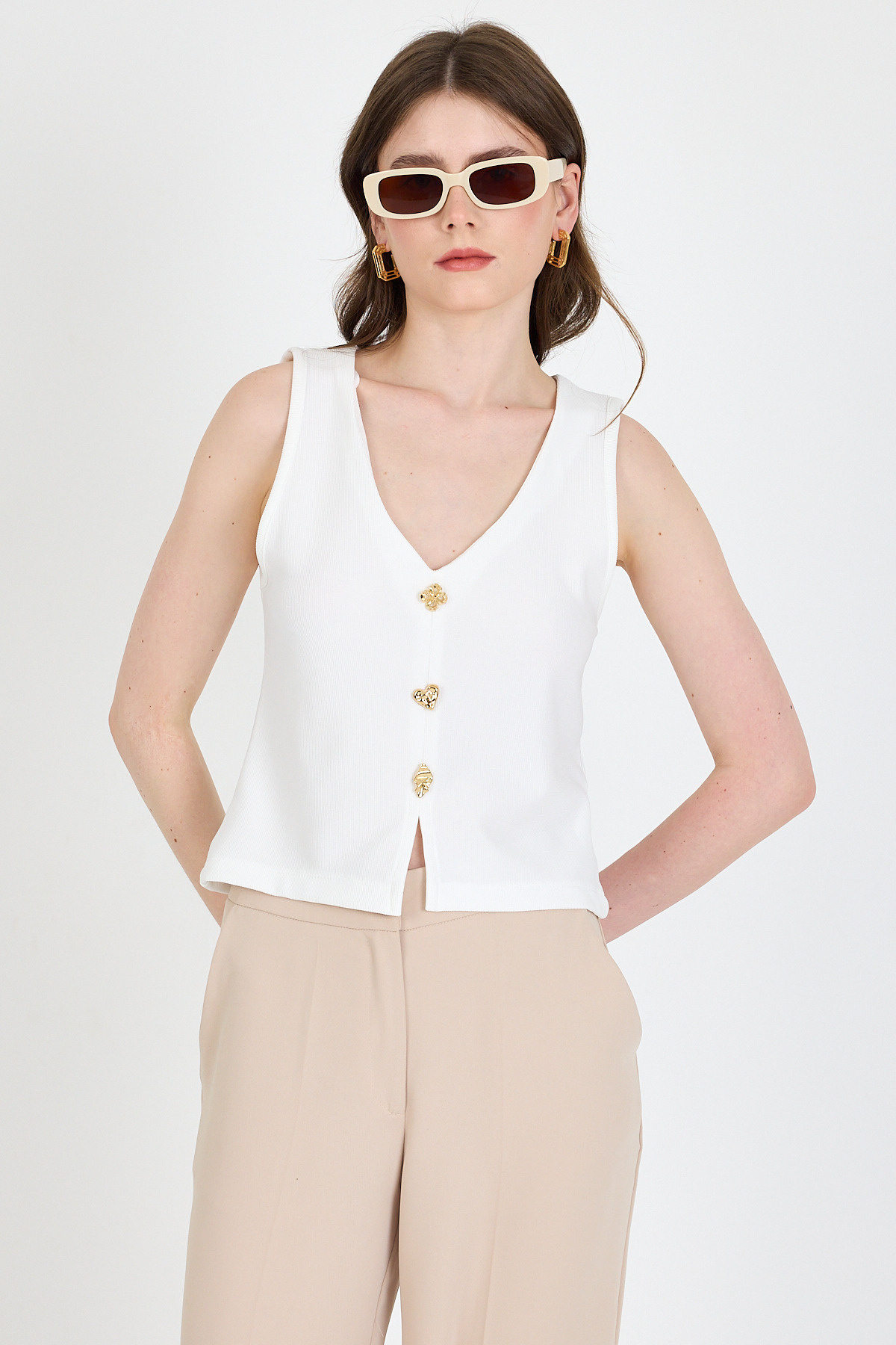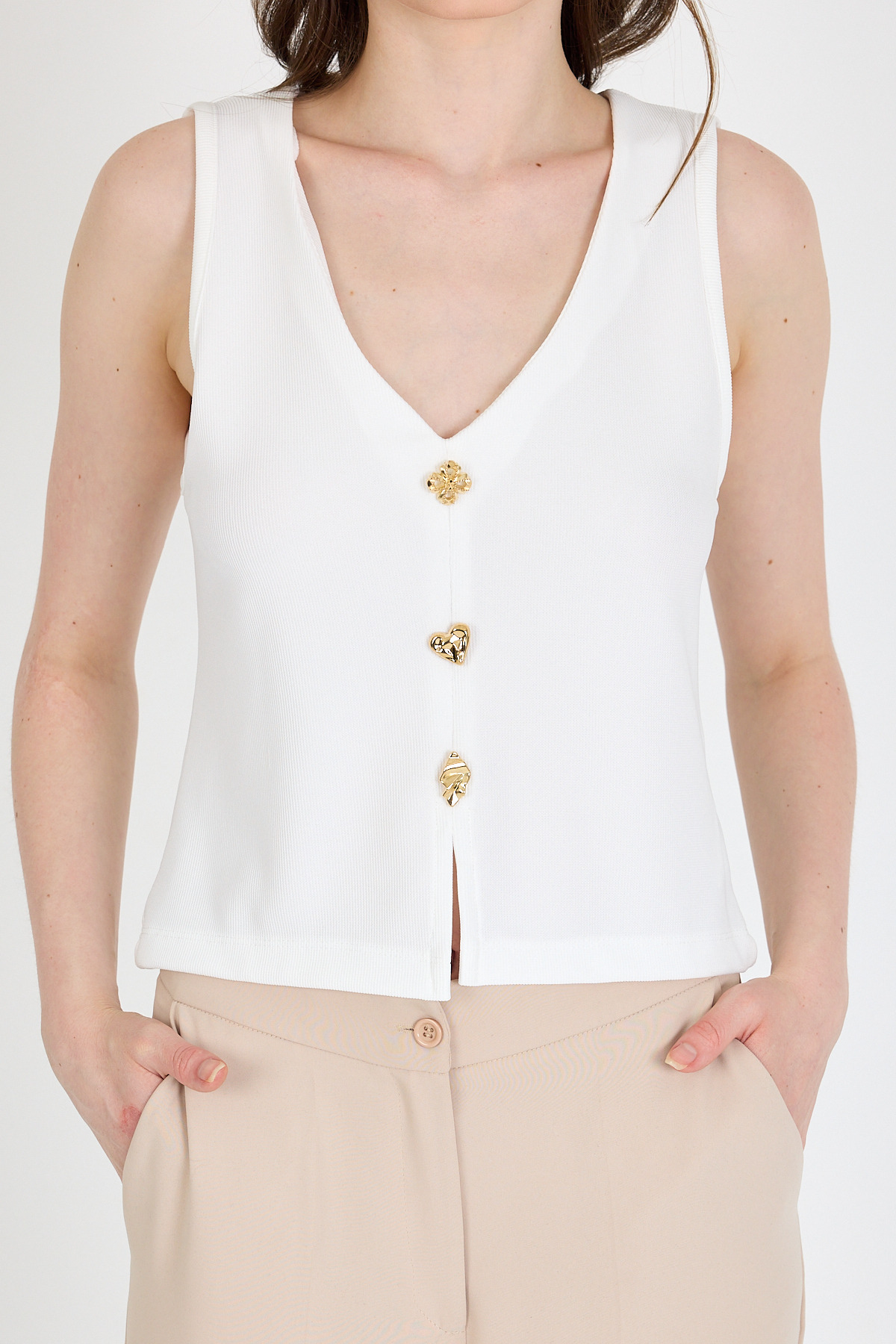 Beyaz V Yaka Düğmeli Kolsuz Bluz 019