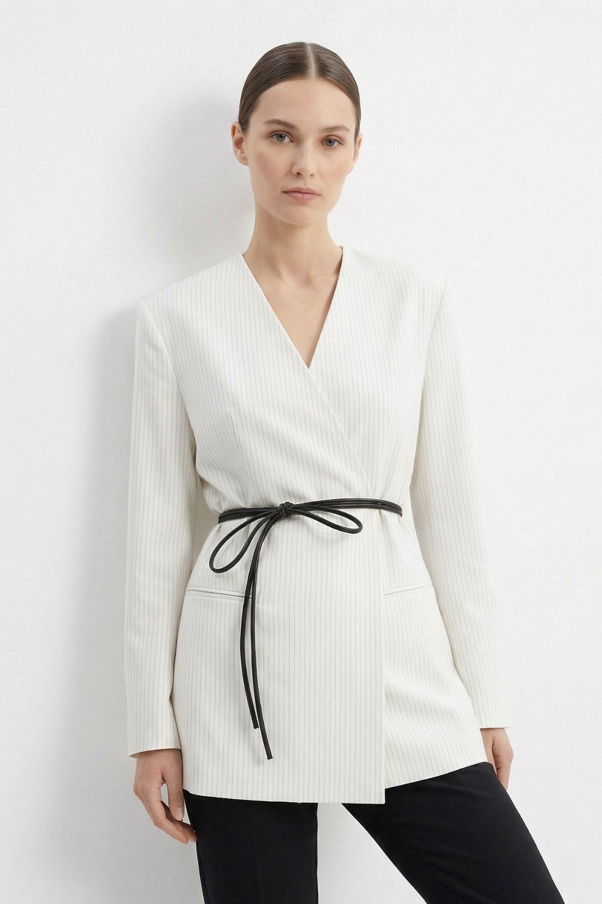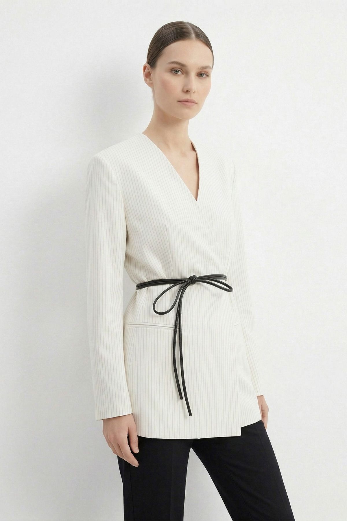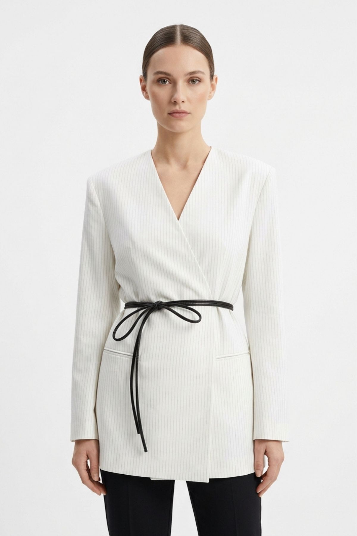 Beyaz V Yaka Kemerli Çizgili Ceket 7486
