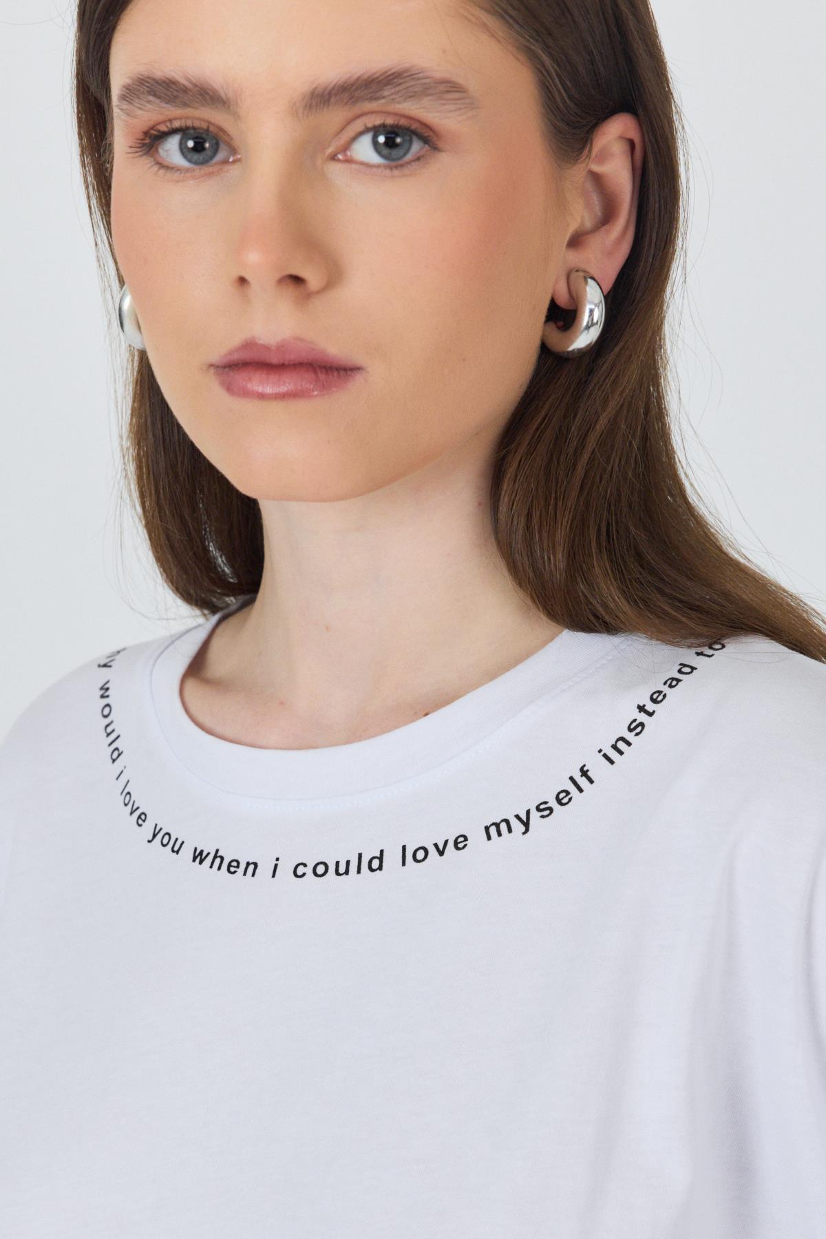 Beyaz Yaka Yazı Baskılı Oversize Pamuklu Tişört 2150-34M