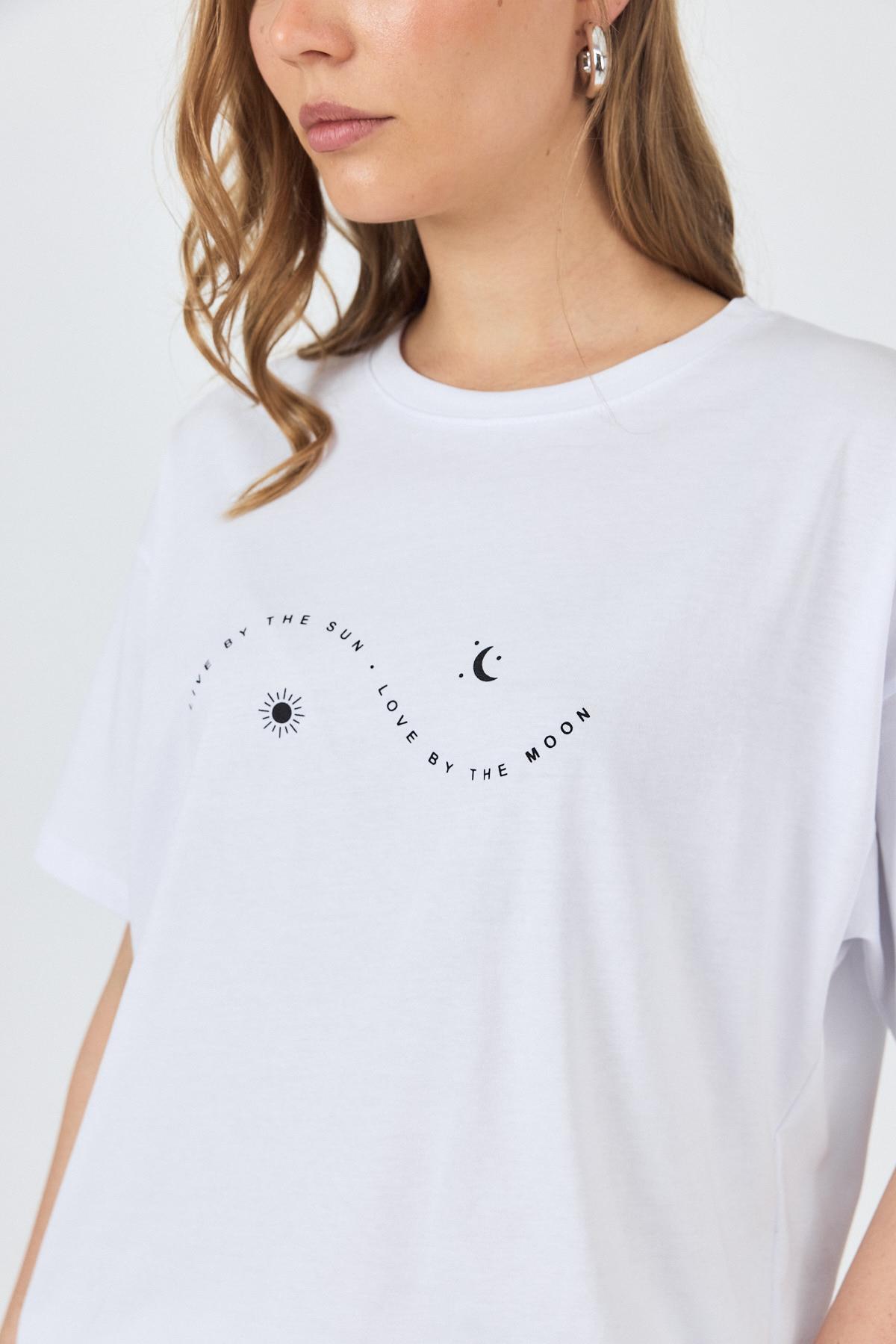 Beyaz Yazı Baskılı Oversize Pamuklu Tişört 2150-32M