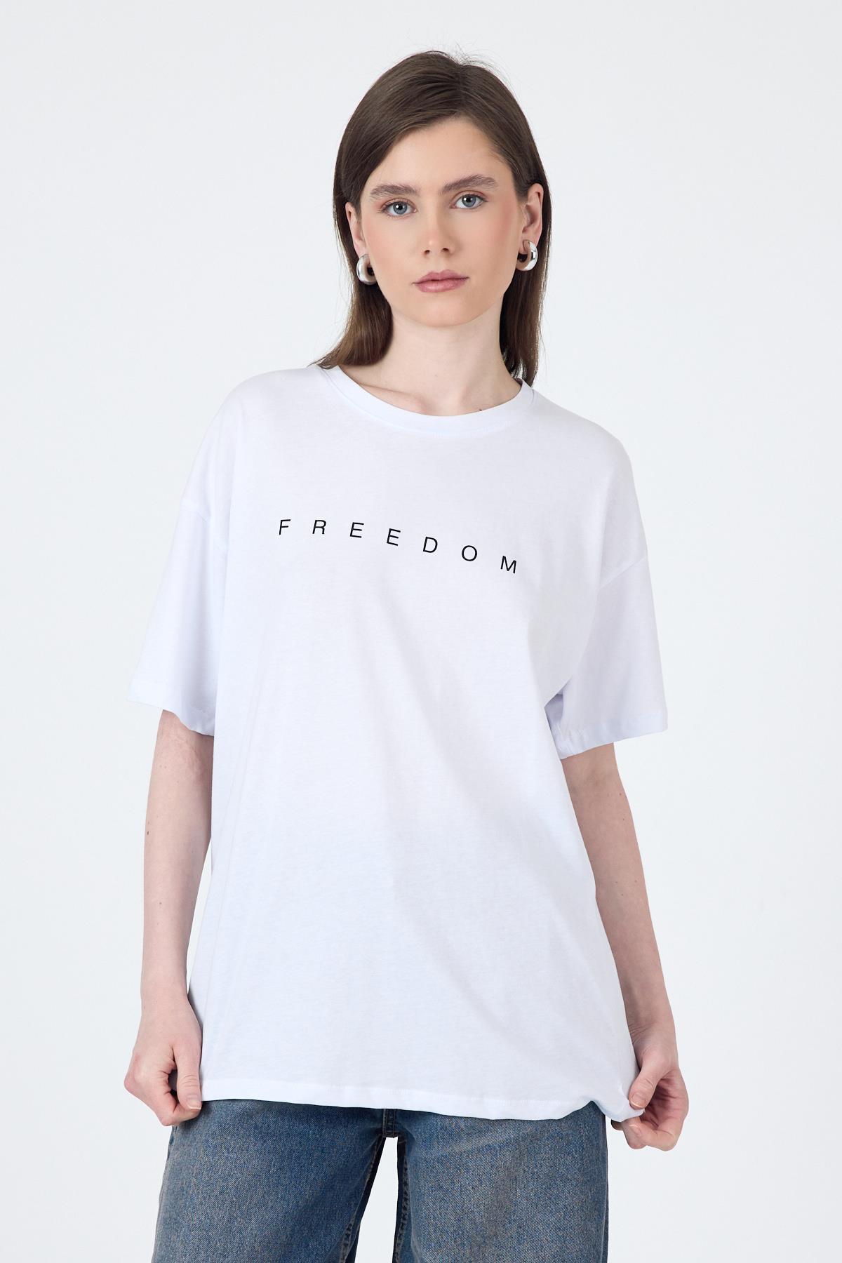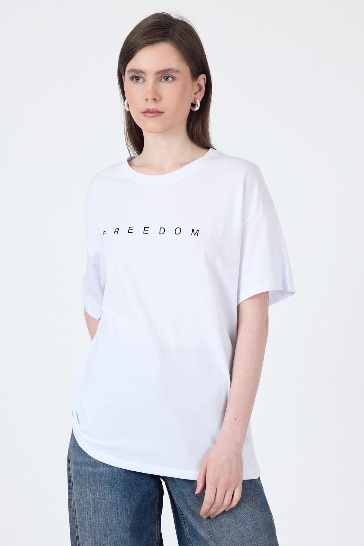 Beyaz Yazı Baskılı Pamuklu Oversize Tişört 2150-3M