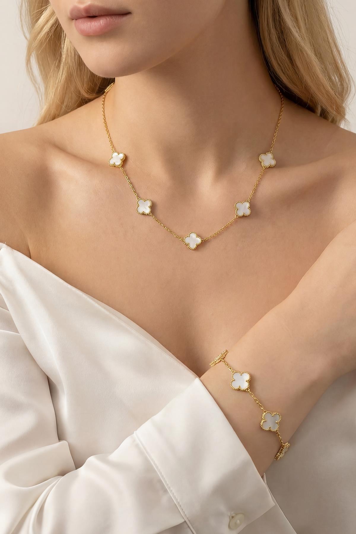 Beyaz Yonca Figürlü Kolye Bileklik Seti Gold 0132