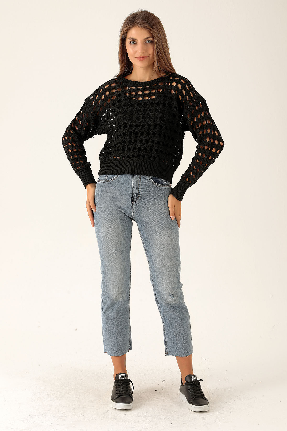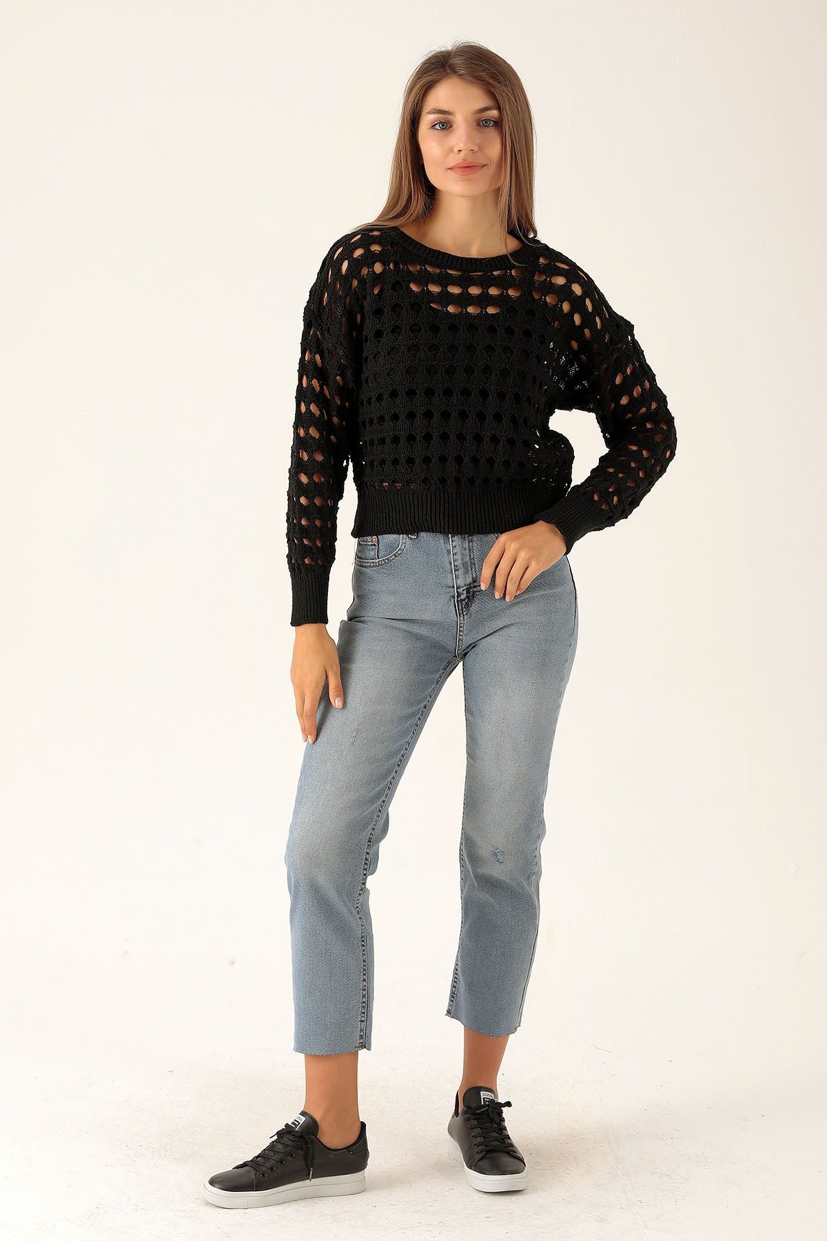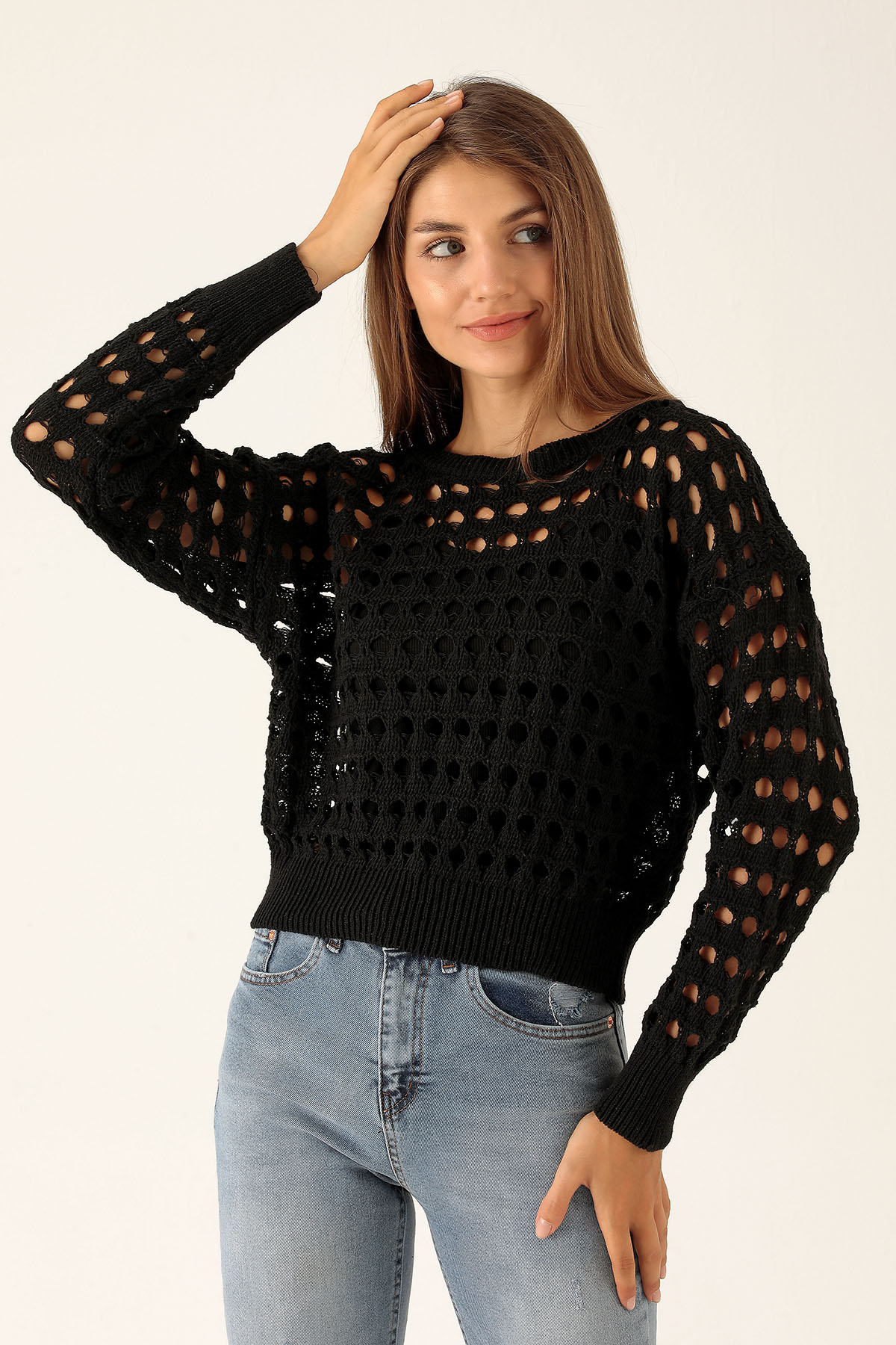 Bisiklet Yaka Delikli Kazak - 1533 Siyah