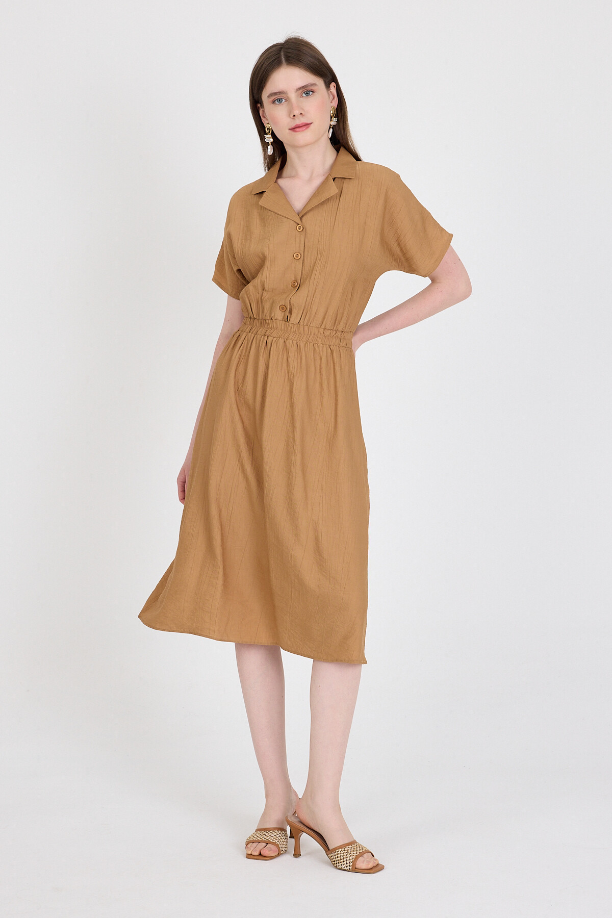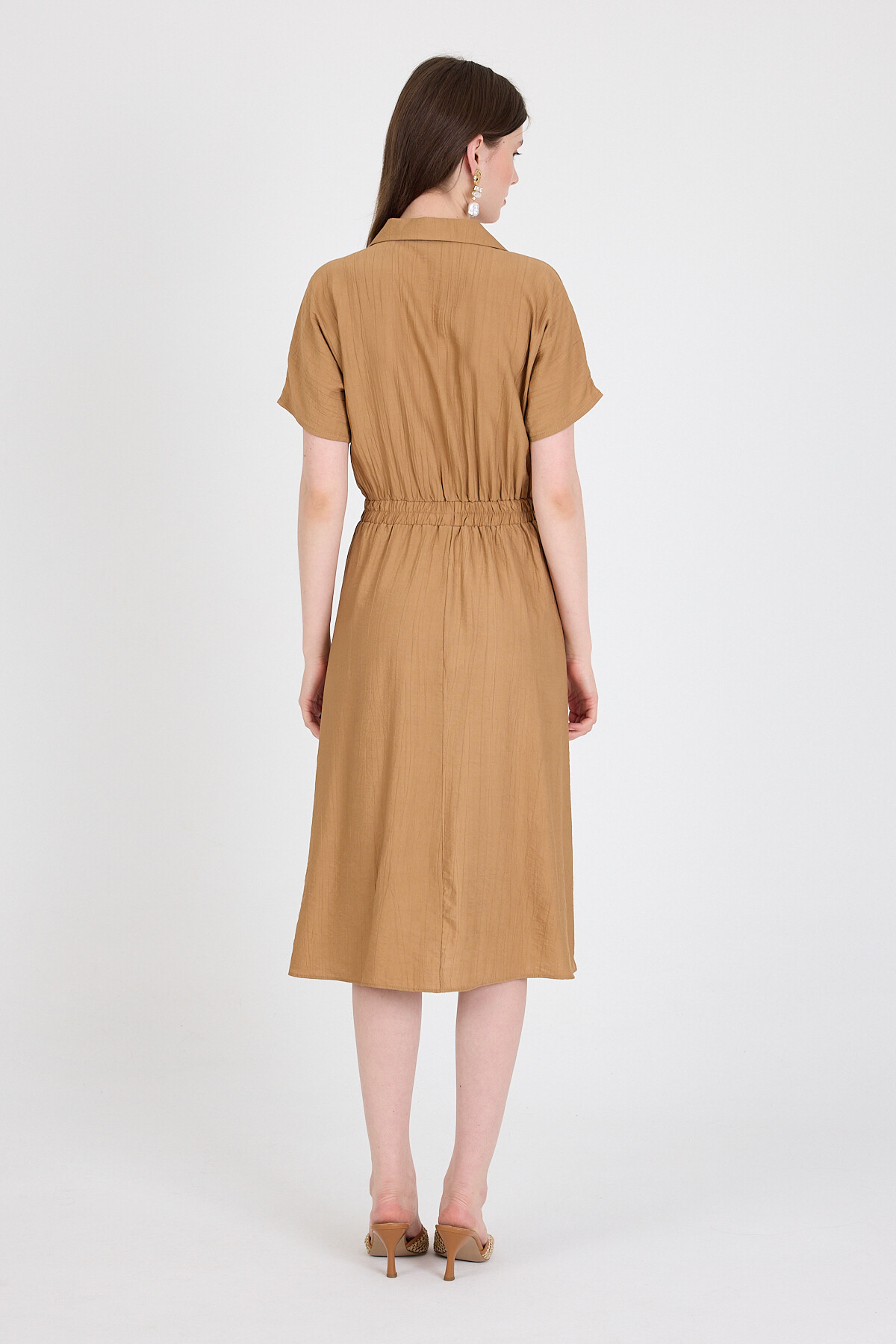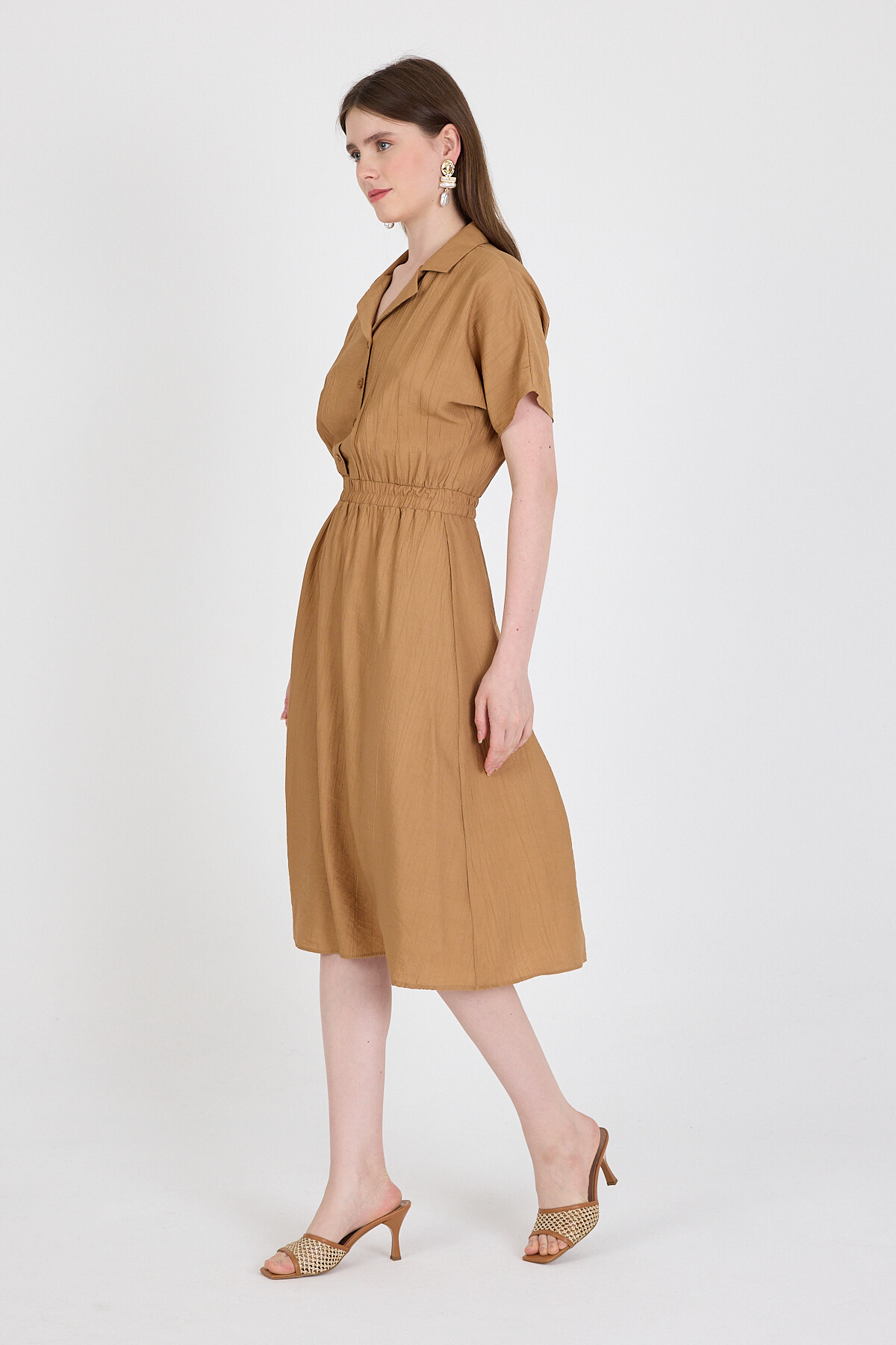 Bisküvi Beli Lastikli Gömlek Yaka Kısa Kol Midi Elbise 4475A