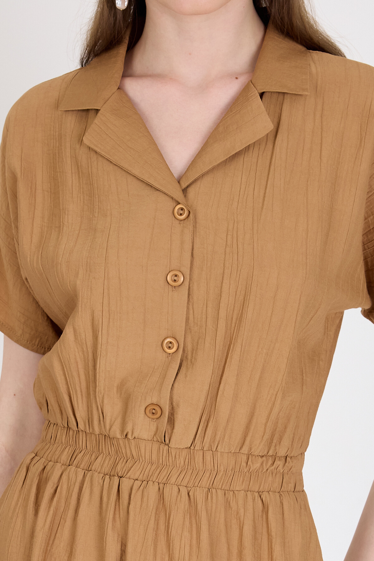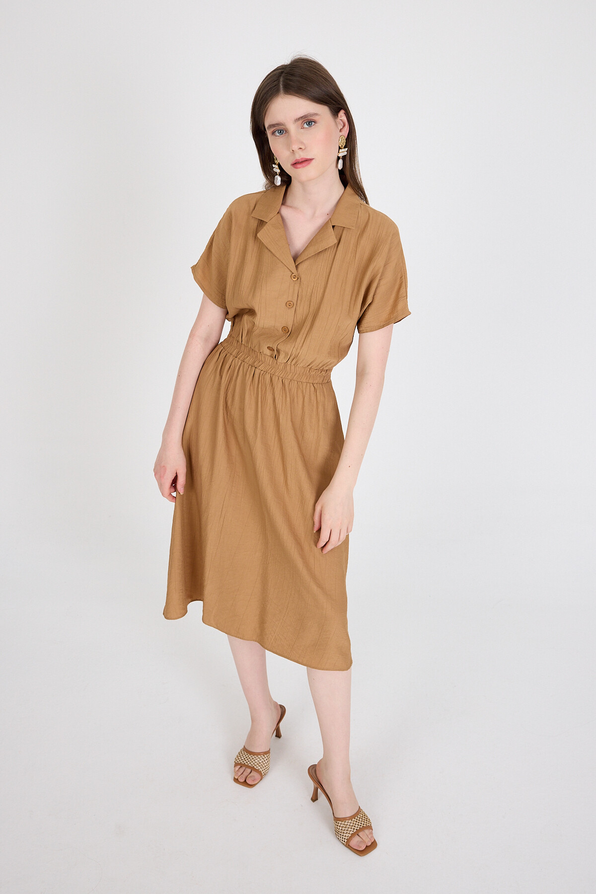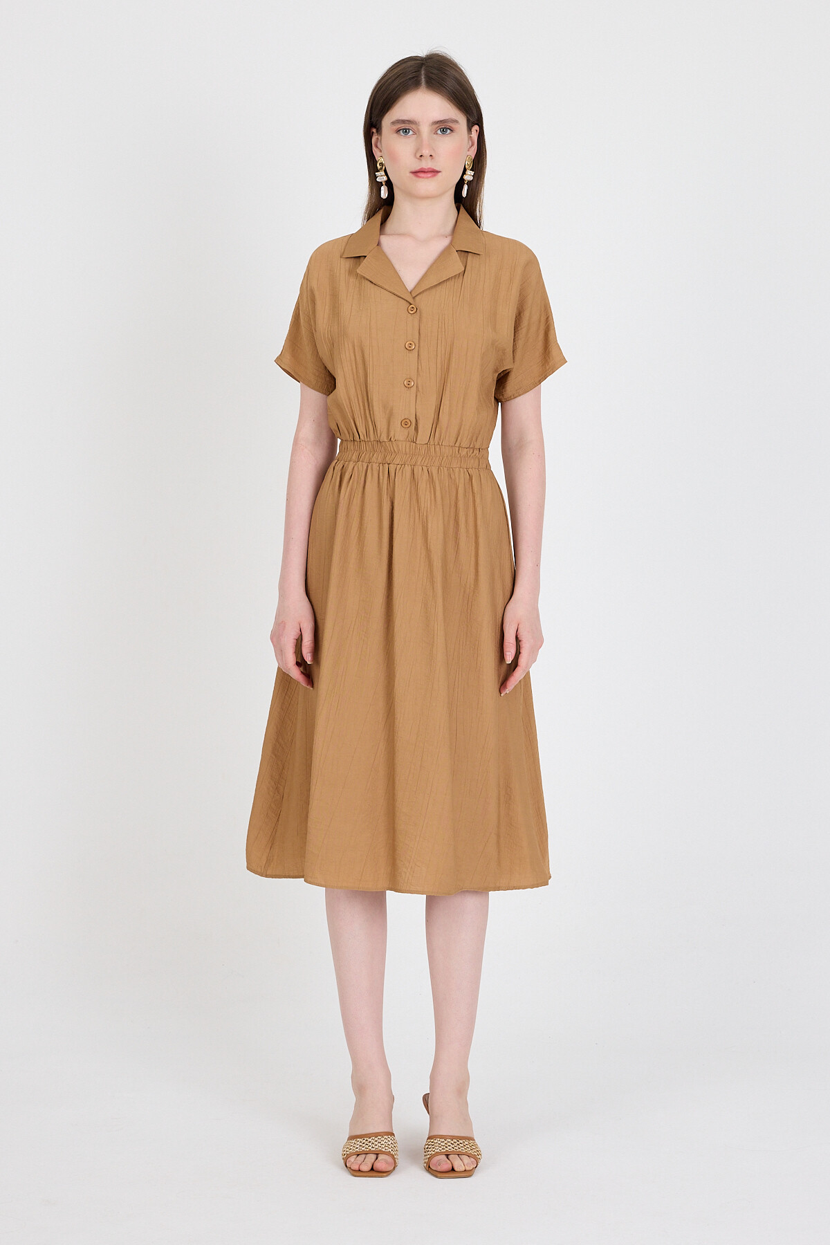 Bisküvi Beli Lastikli Gömlek Yaka Kısa Kol Midi Elbise 4475A