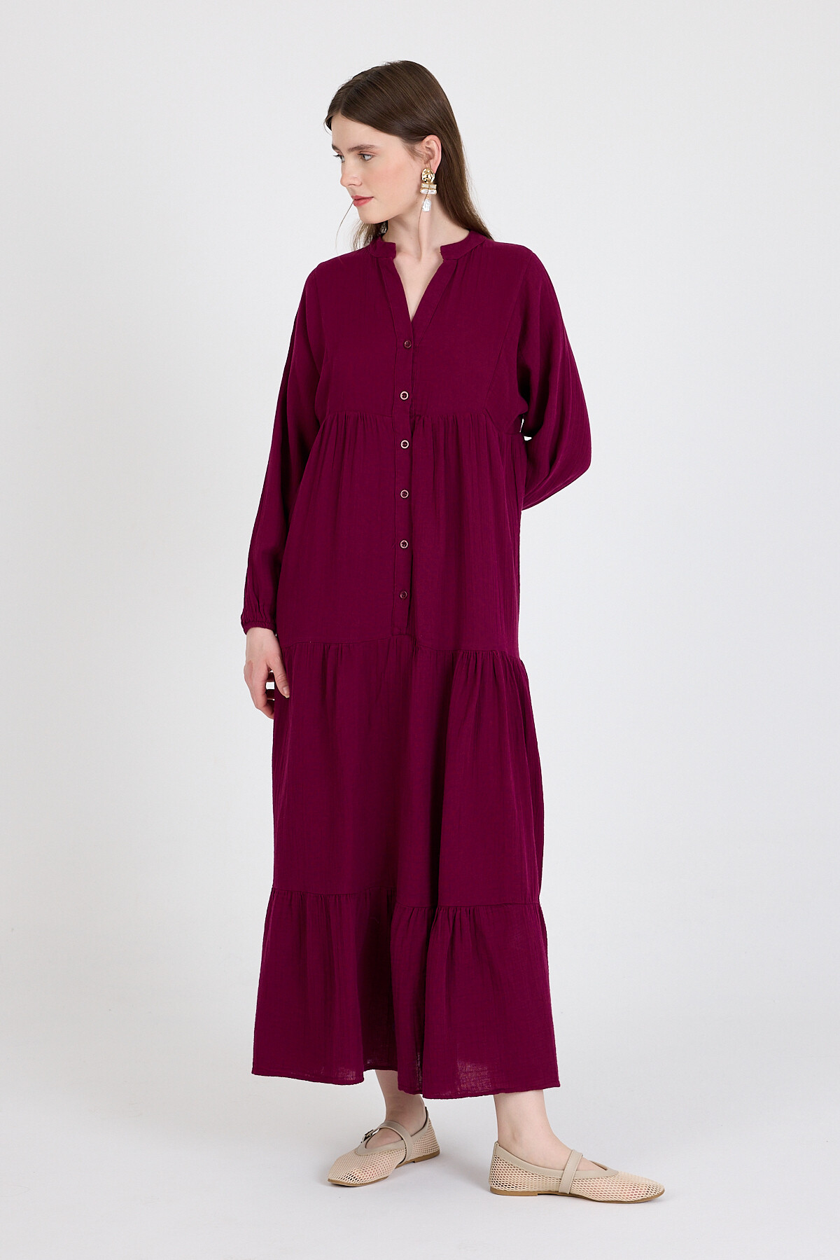Bordo %100 Pamuk Düğmeli Kat Etekli Uzun Kollu Elbise 4782A
