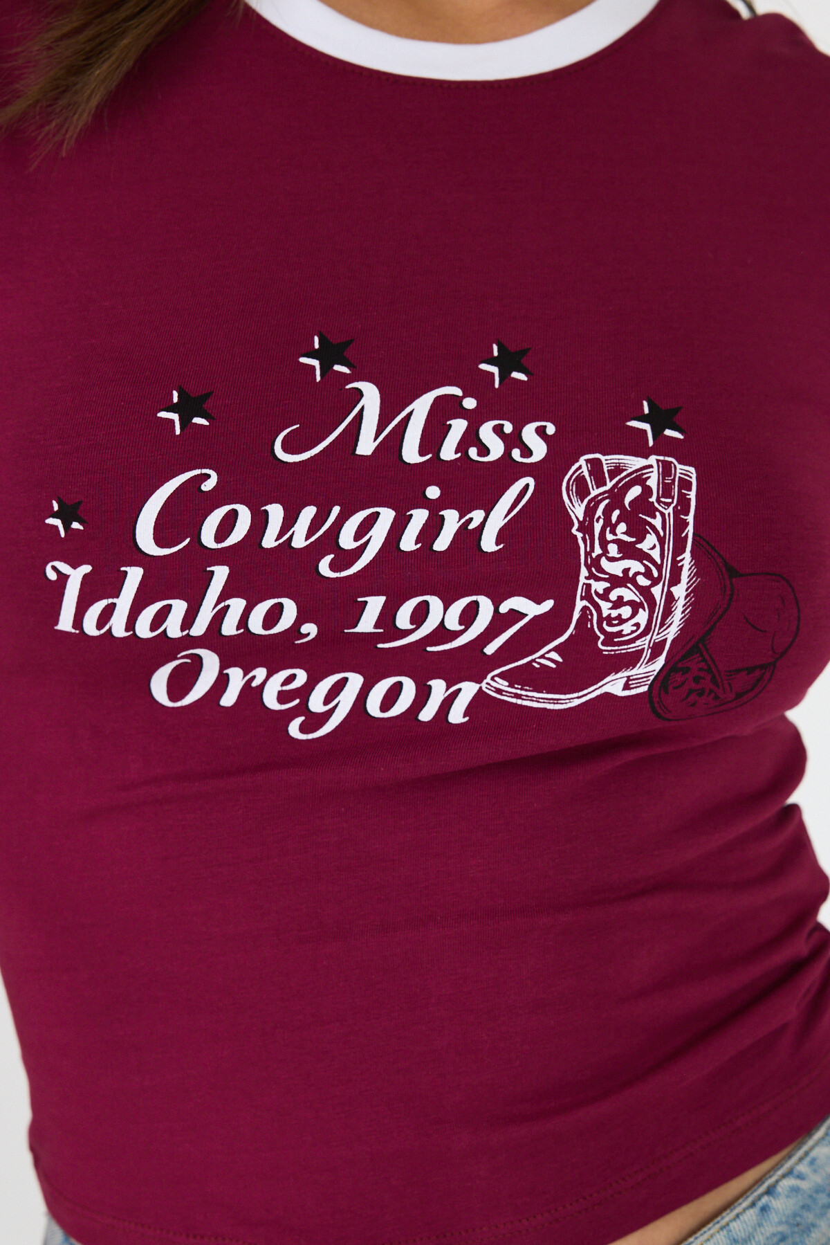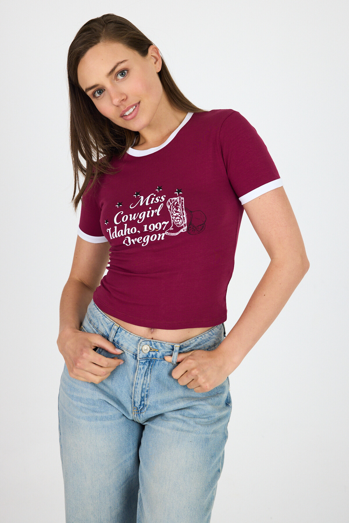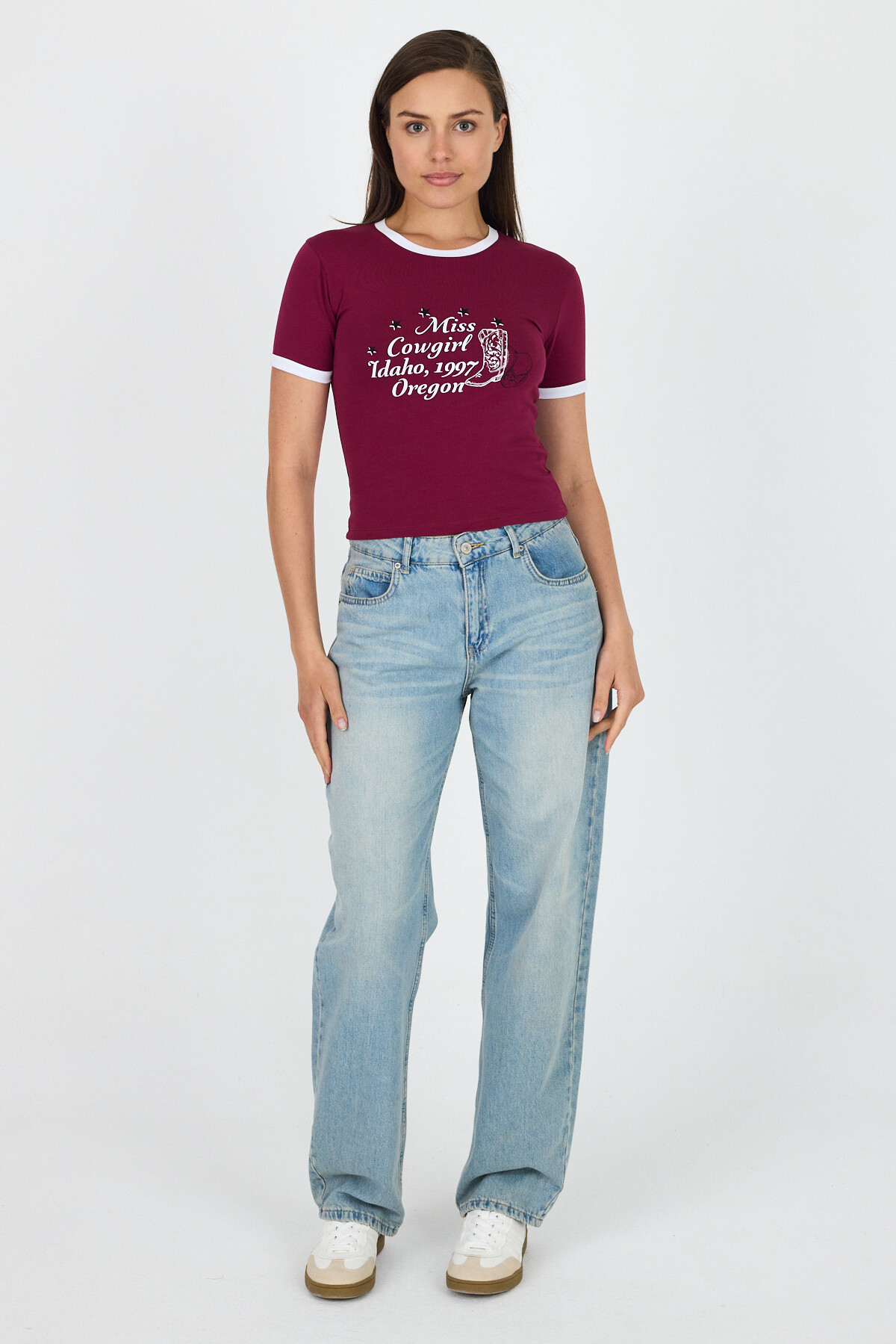 Bordo Baskılı Ribana Detaylı Pamuklu Crop Tişört 9191M