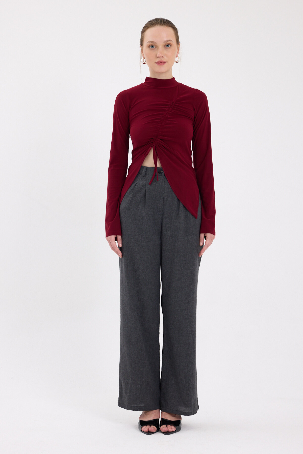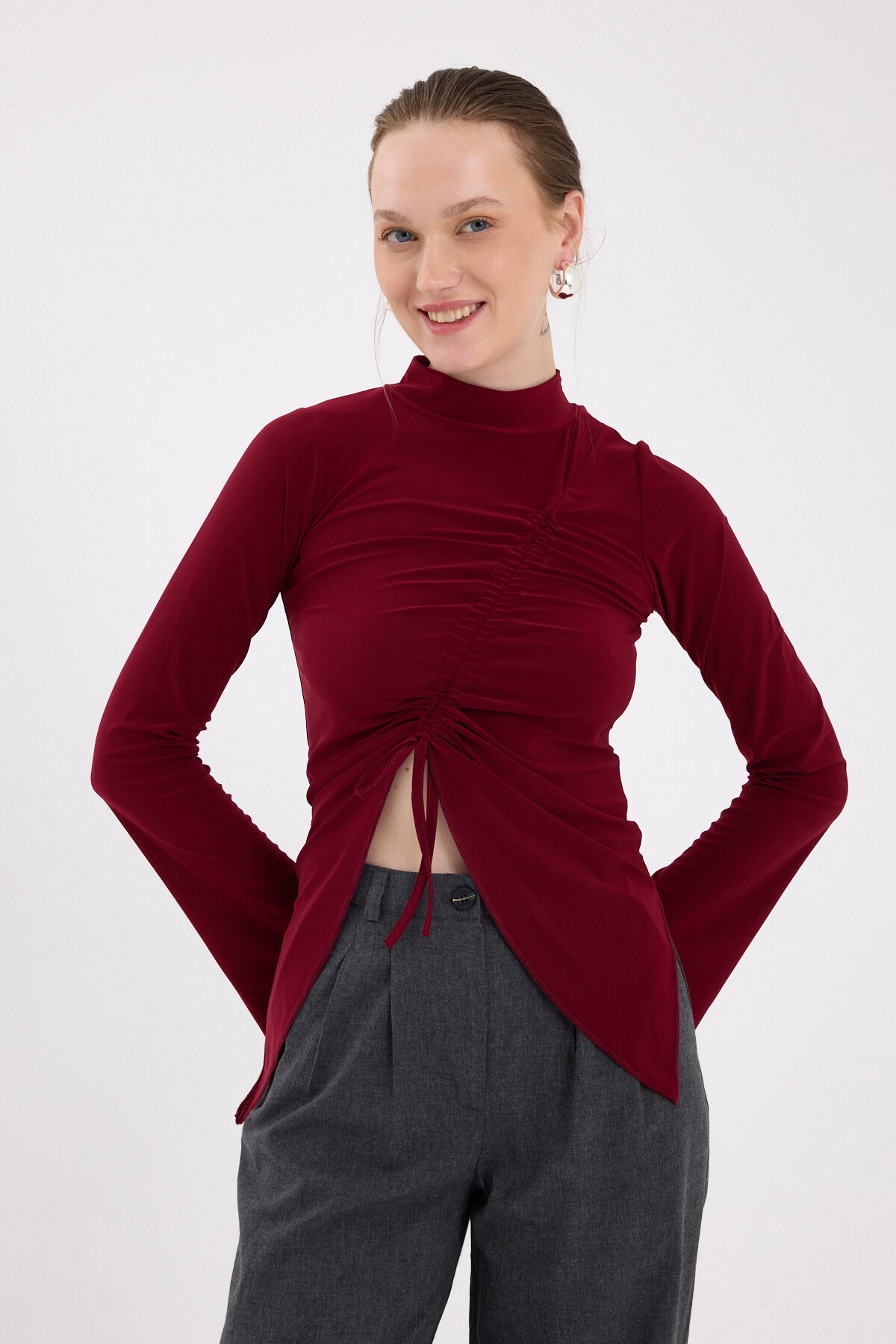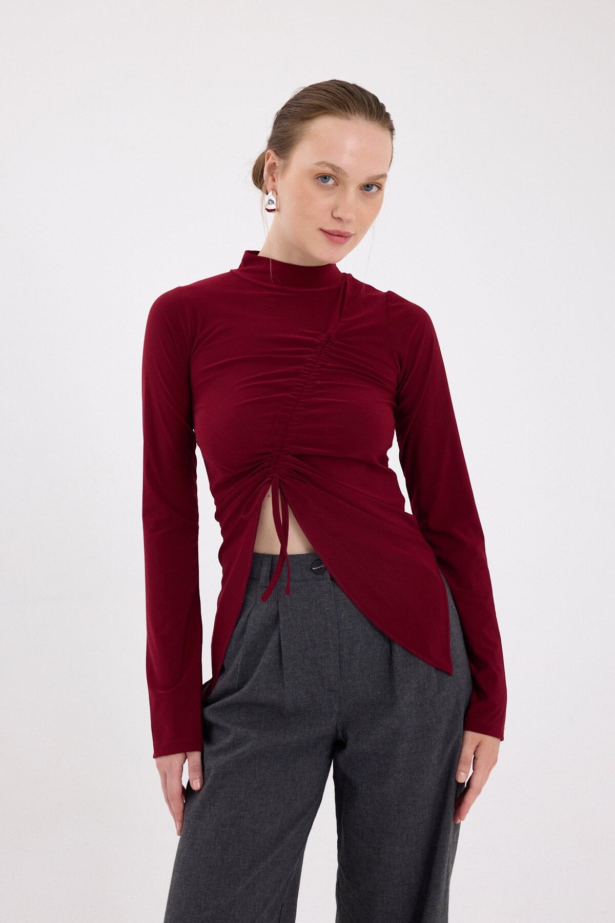 Bordo Büzgü Detaylı Balıkçı Yaka Bluz 2458
