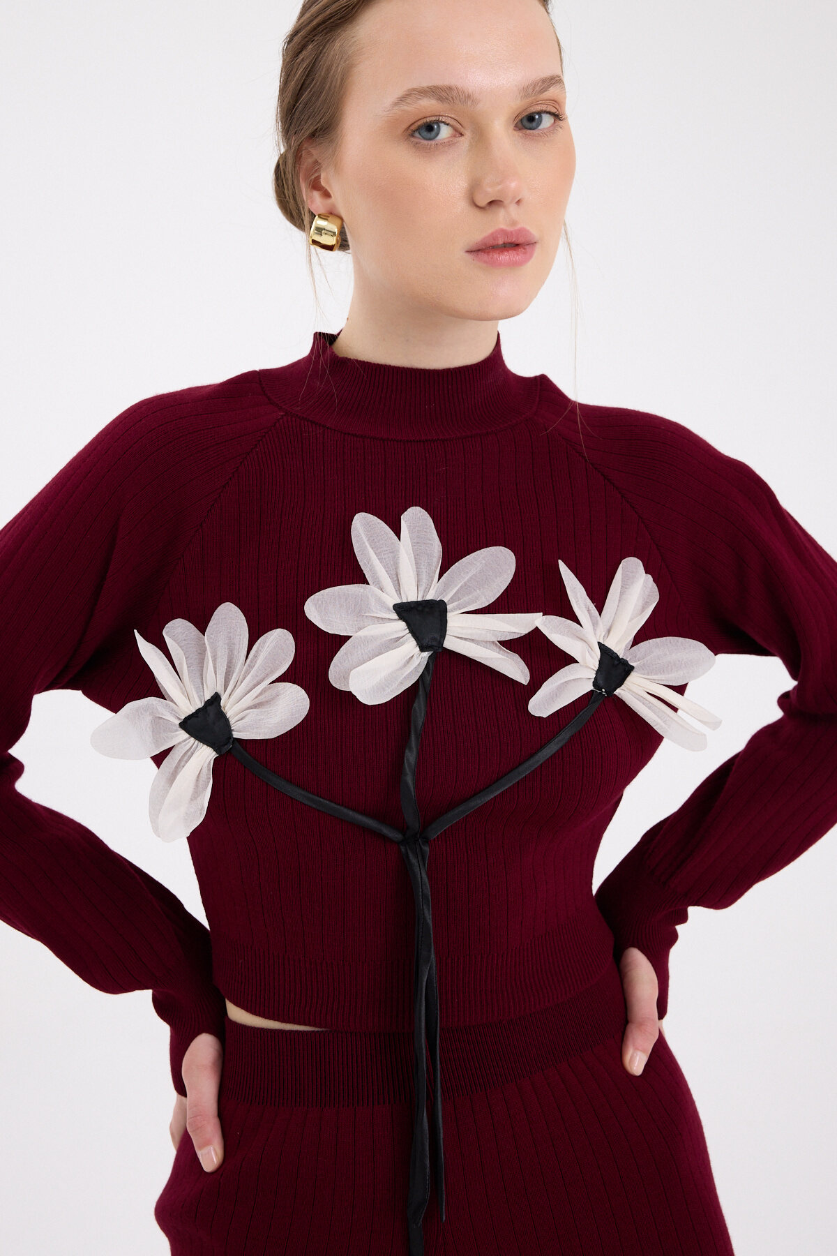 Bordo Çiçek Detaylı Triko Alt Üst Kadın Takım 7075
