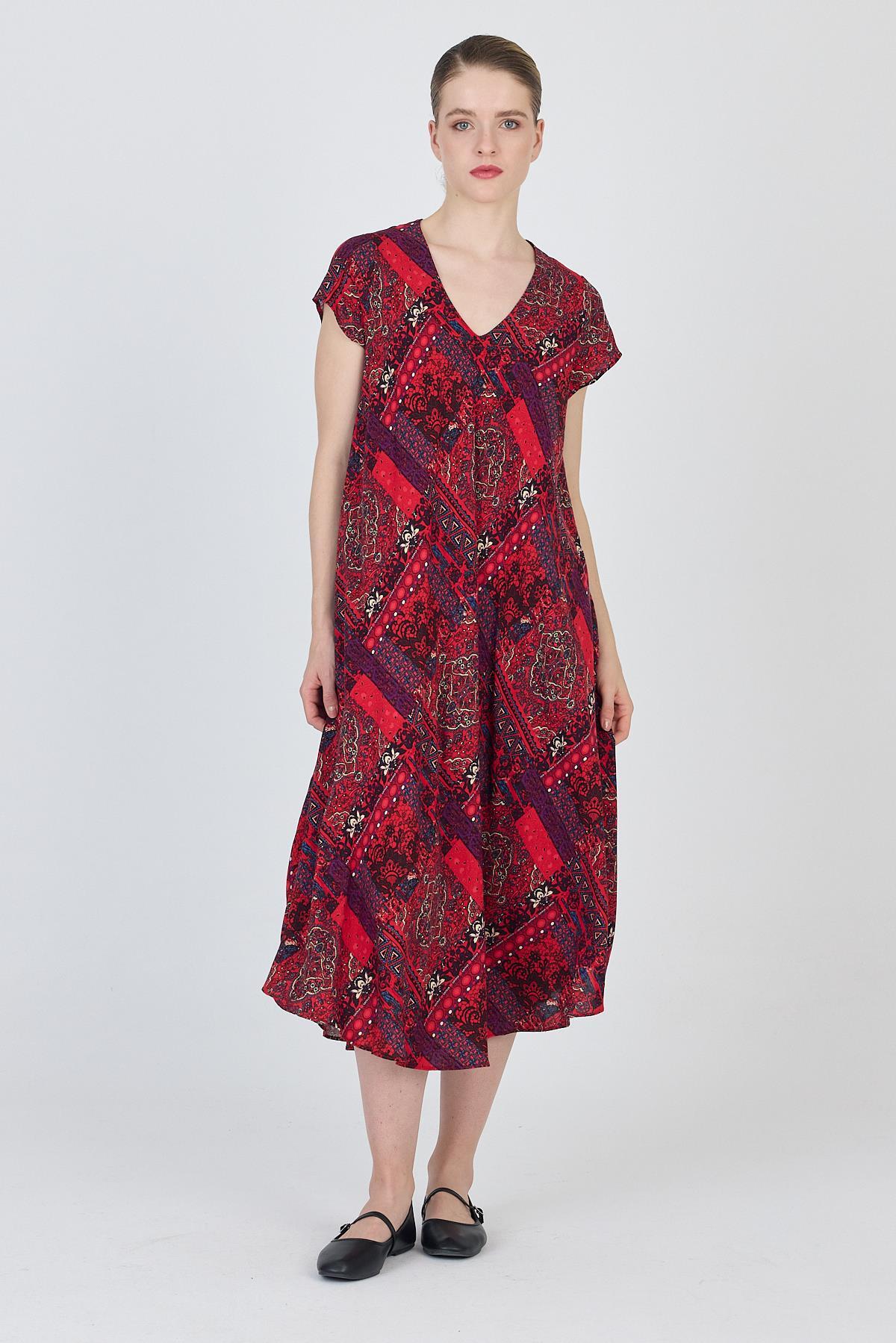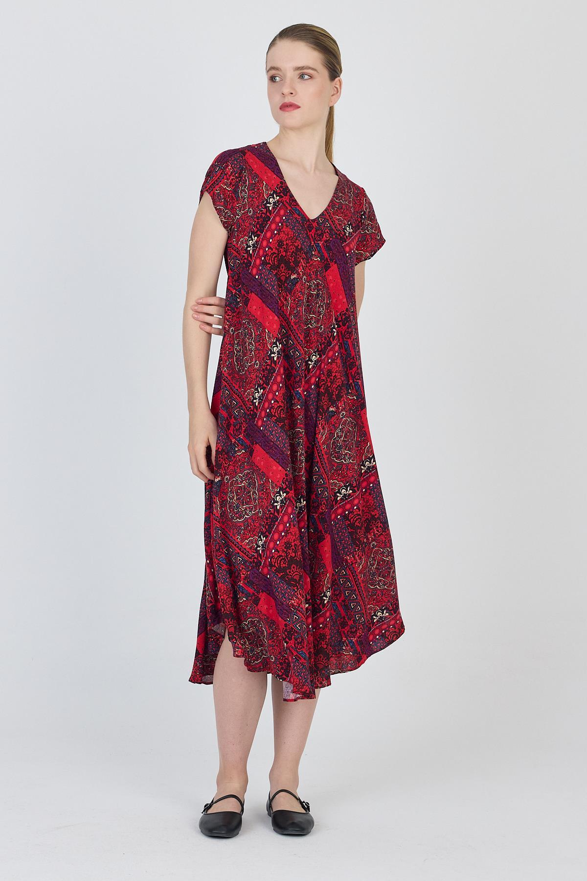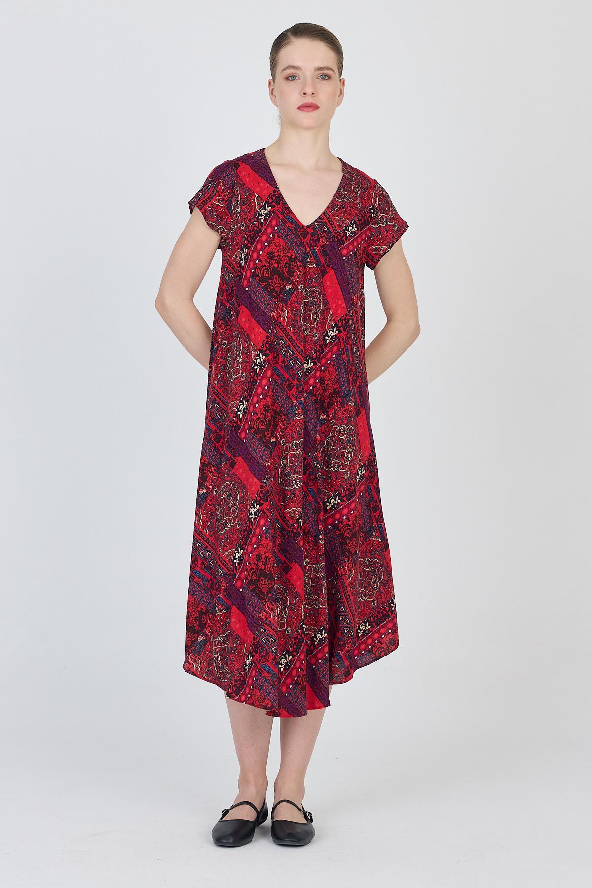 Bordo Etnik Desenli V Yaka Kısa Kollu Midi Elbise 200