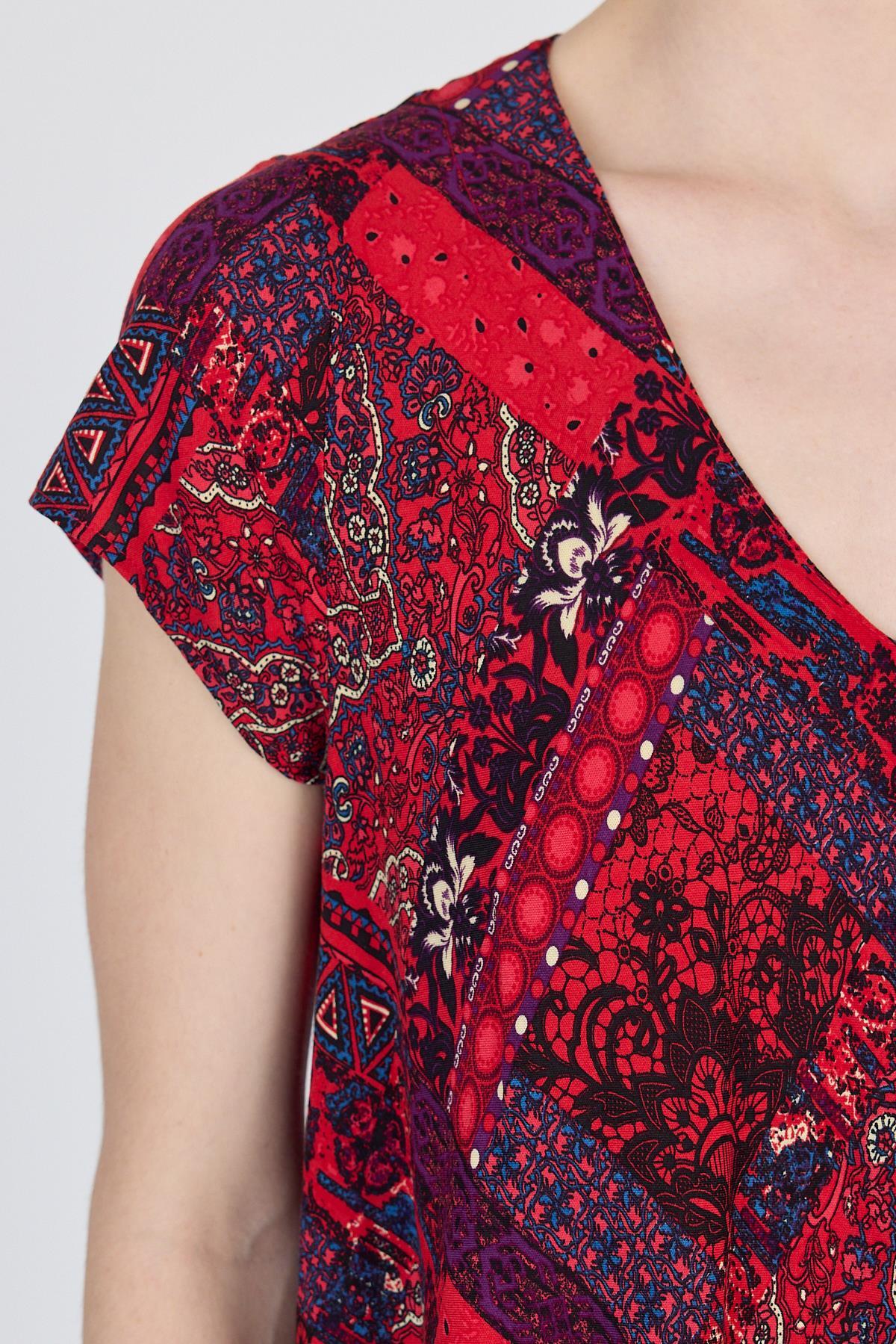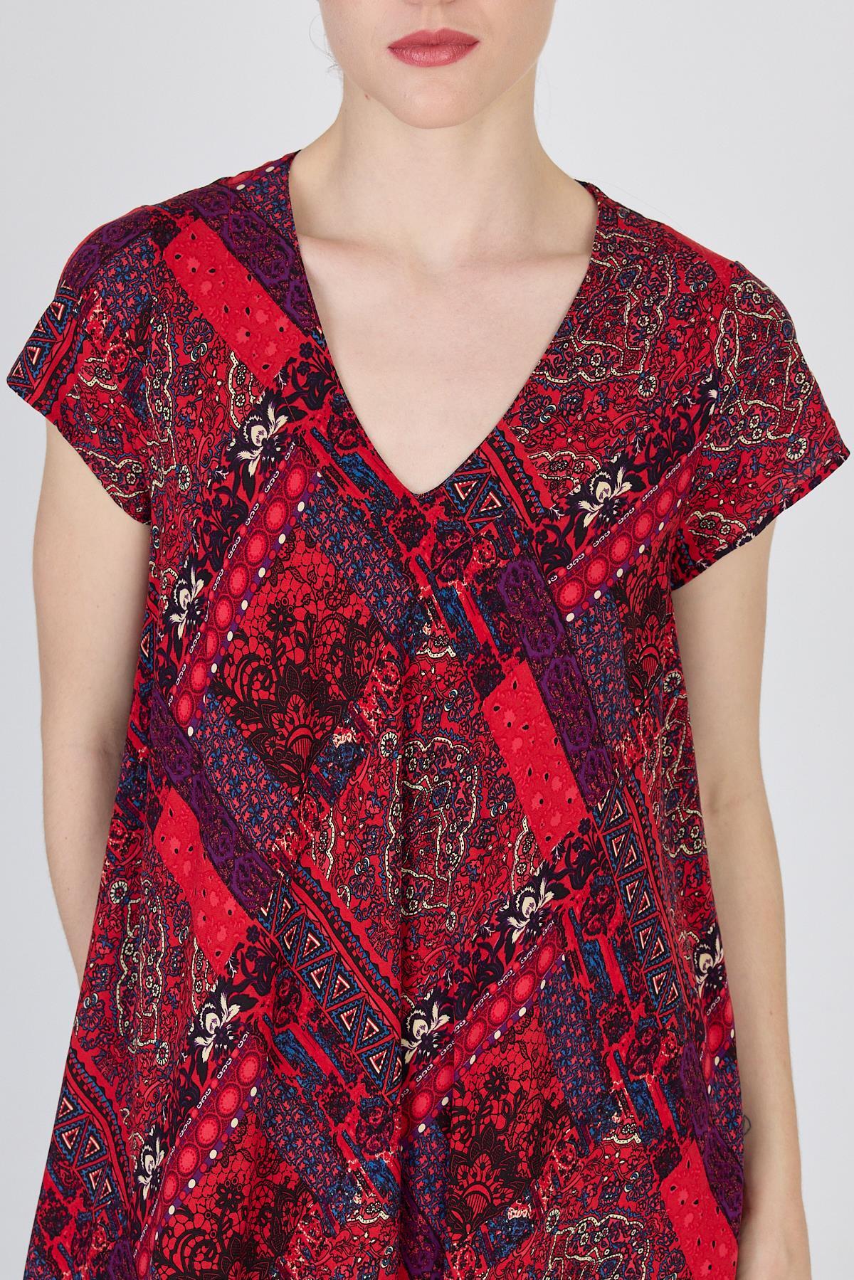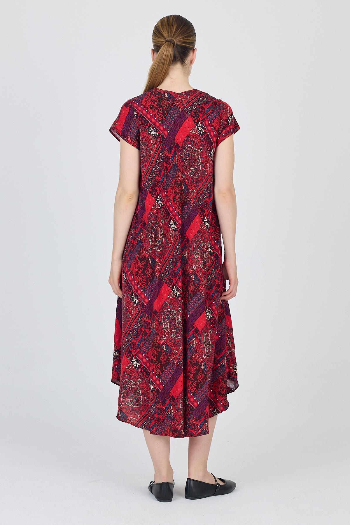 Bordo Etnik Desenli V Yaka Kısa Kollu Midi Elbise 200