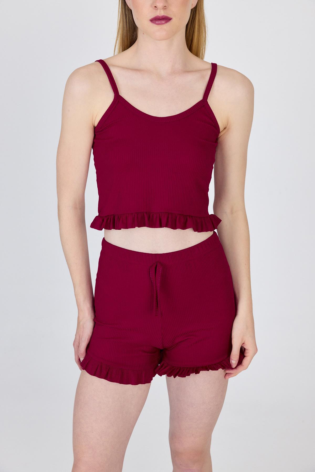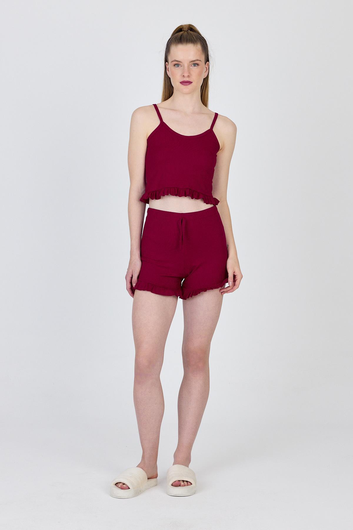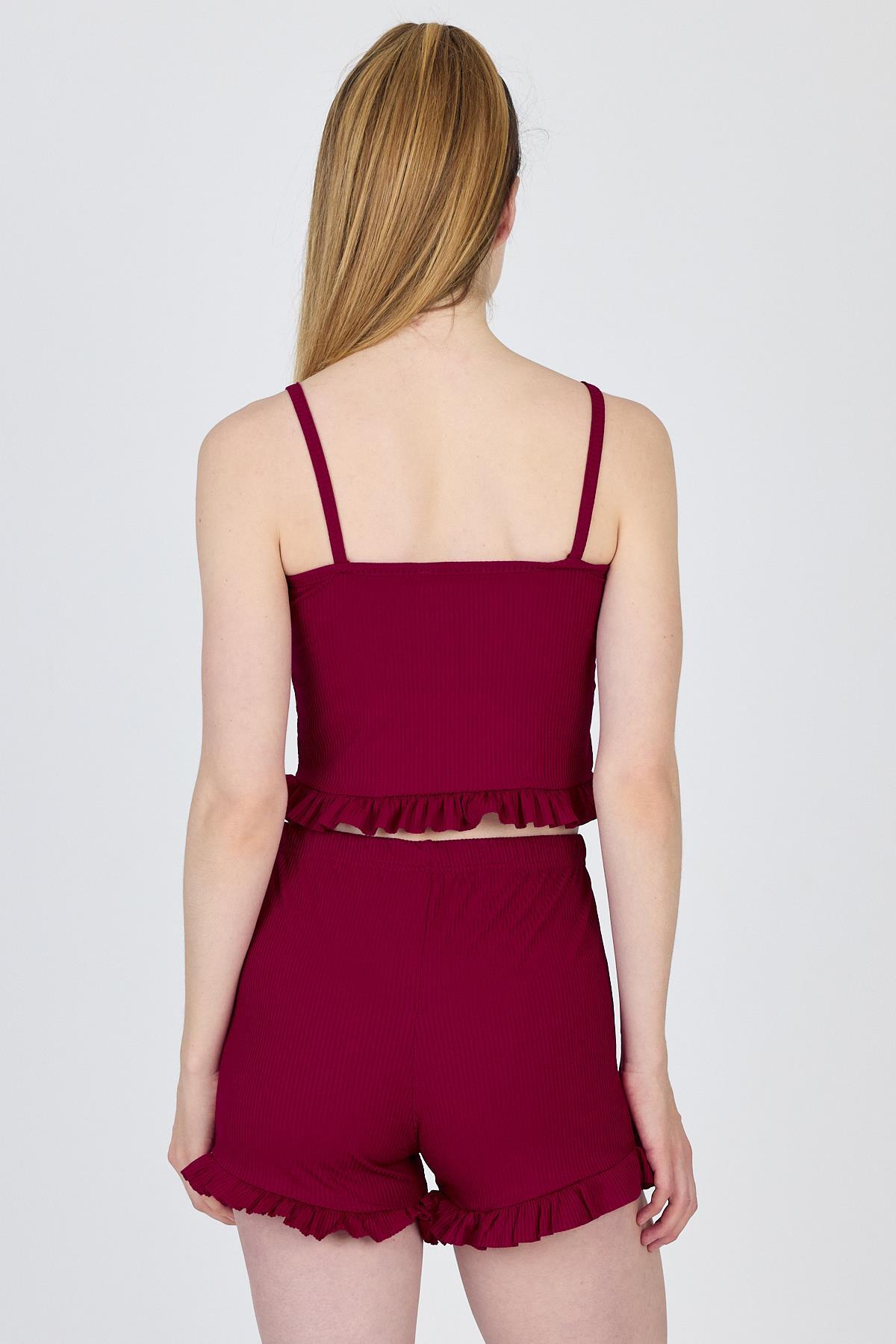 Bordo İp Askılı Fırfırlı Şortlu Takım 0703