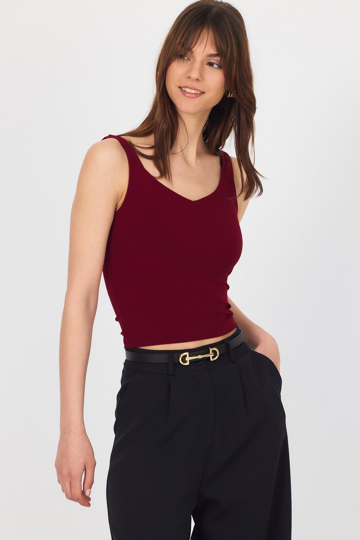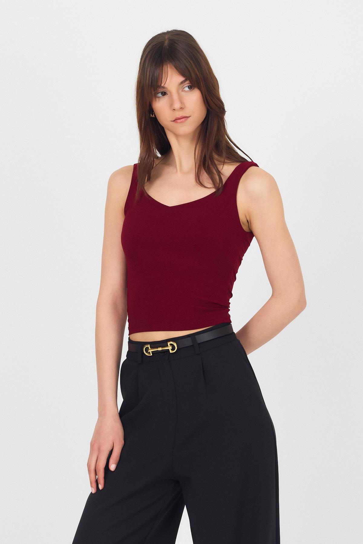 Bordo Kalın Askılı V Yaka Bluz 13293