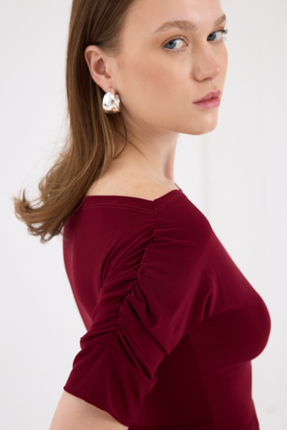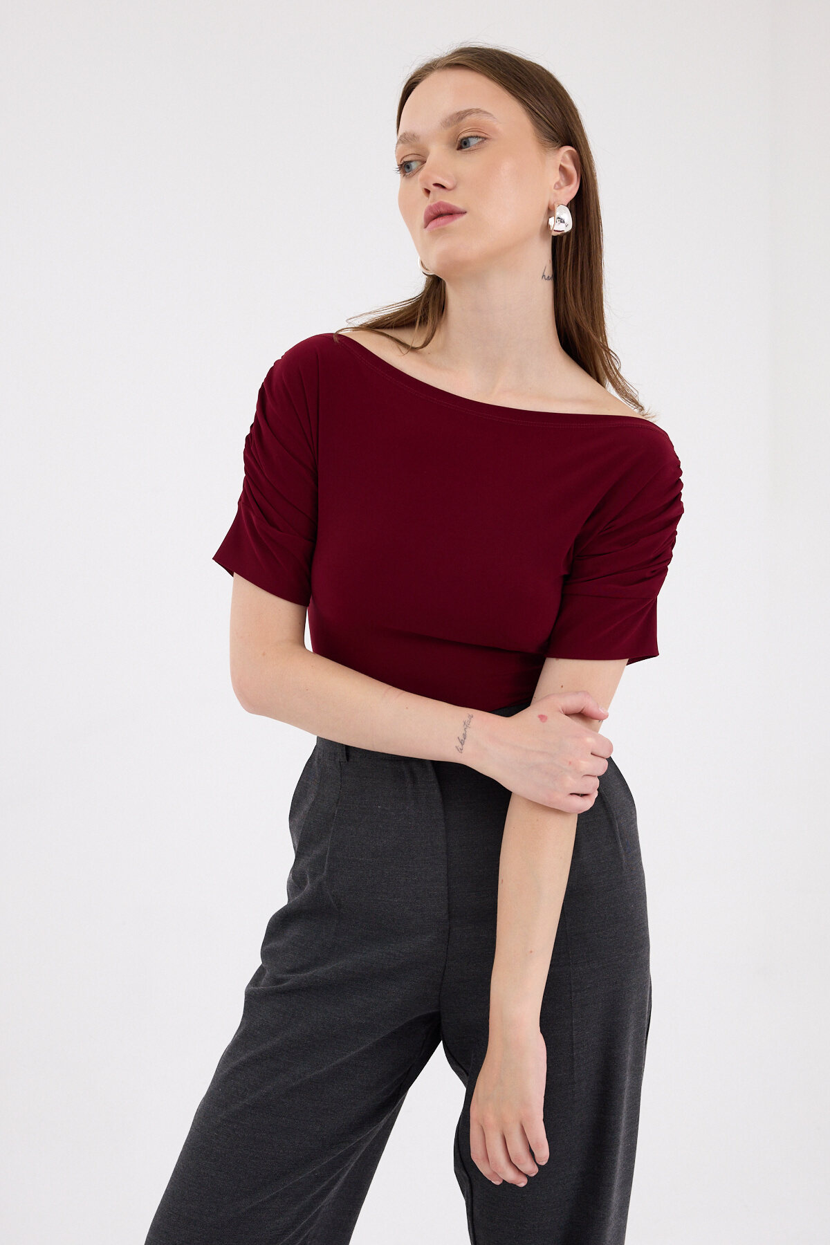 Bordo Kayık Yaka Kol Büzgülü Bluz 2515
