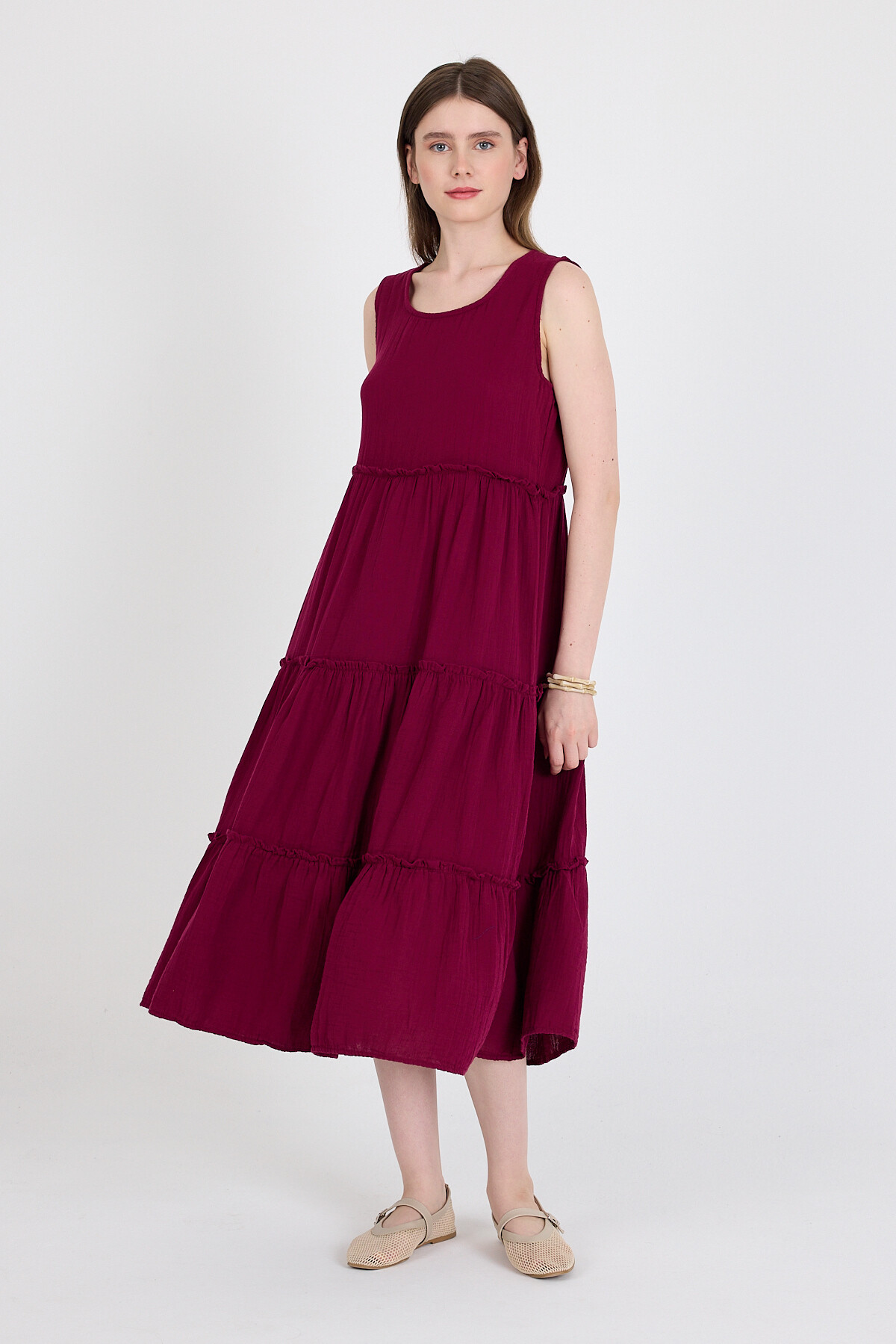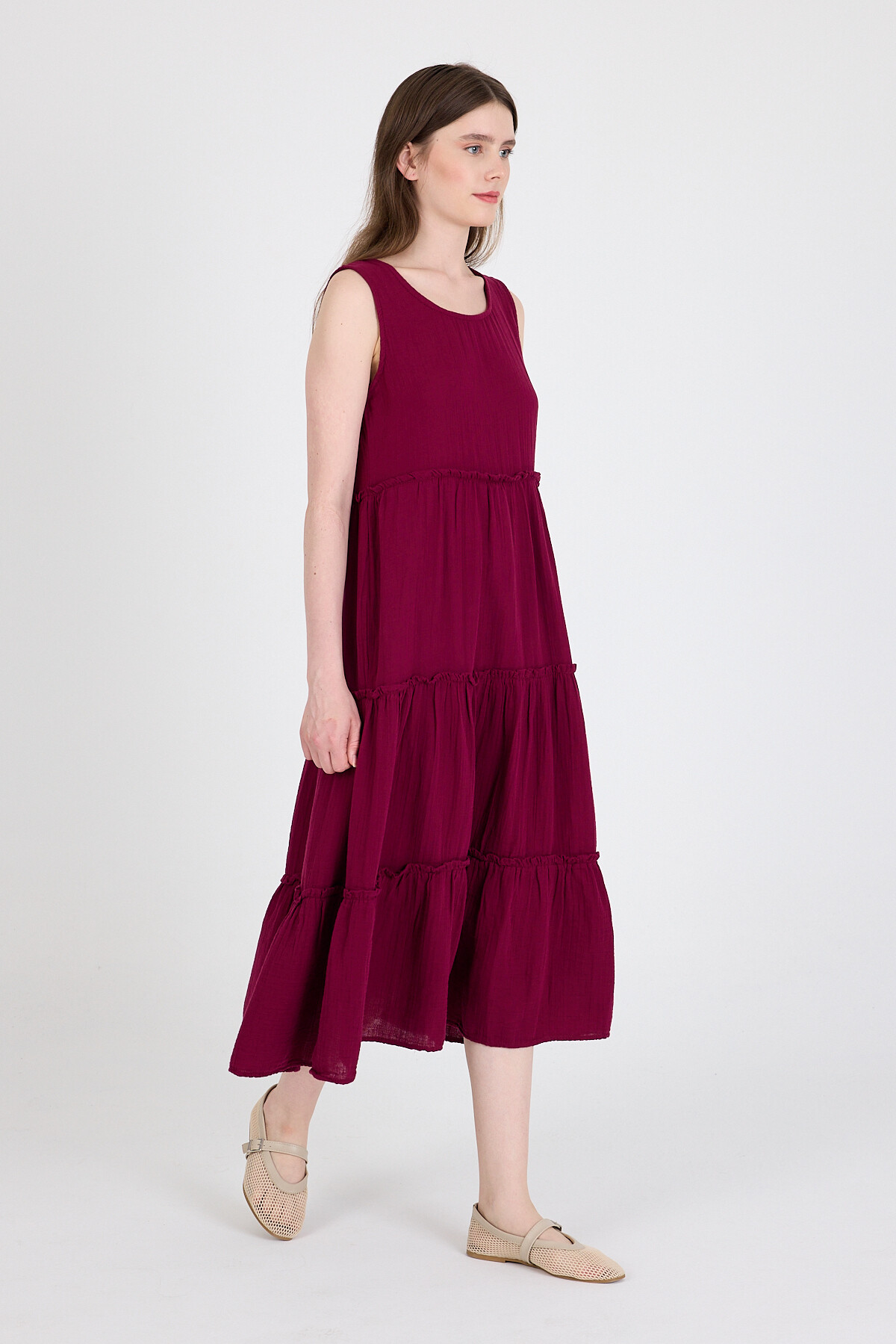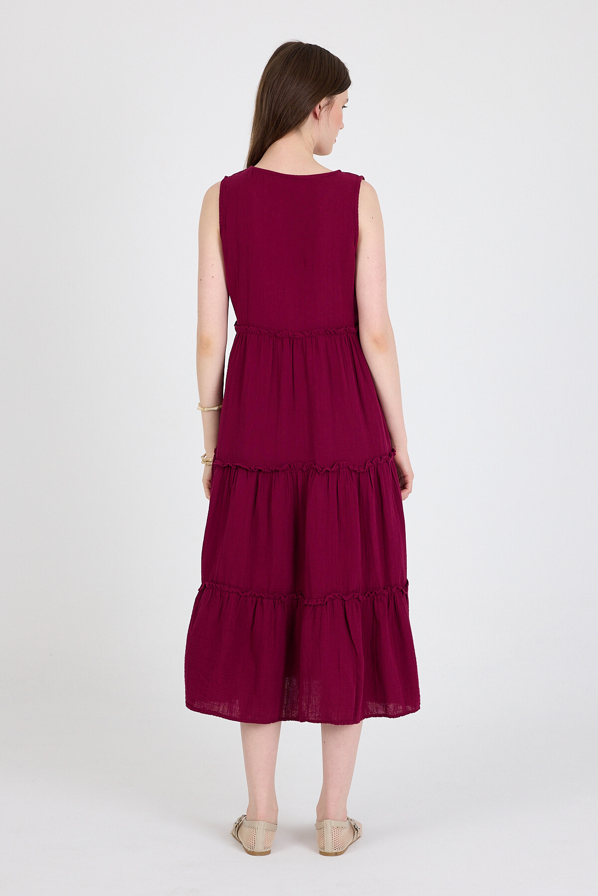 Bordo Keten Görünümlü %100 Pamuk Fırfır Detaylı Kolsuz Midi Elbise 4738A
