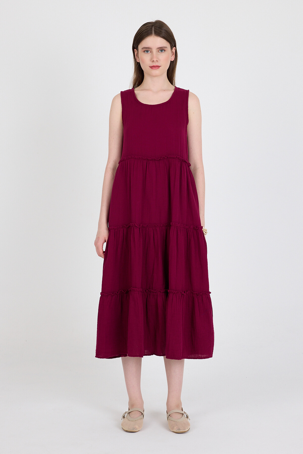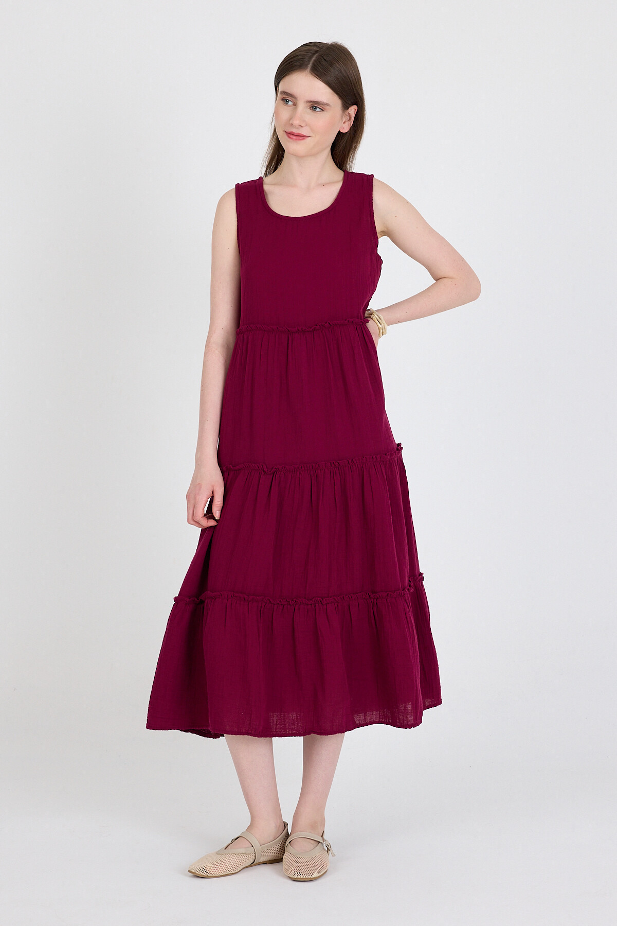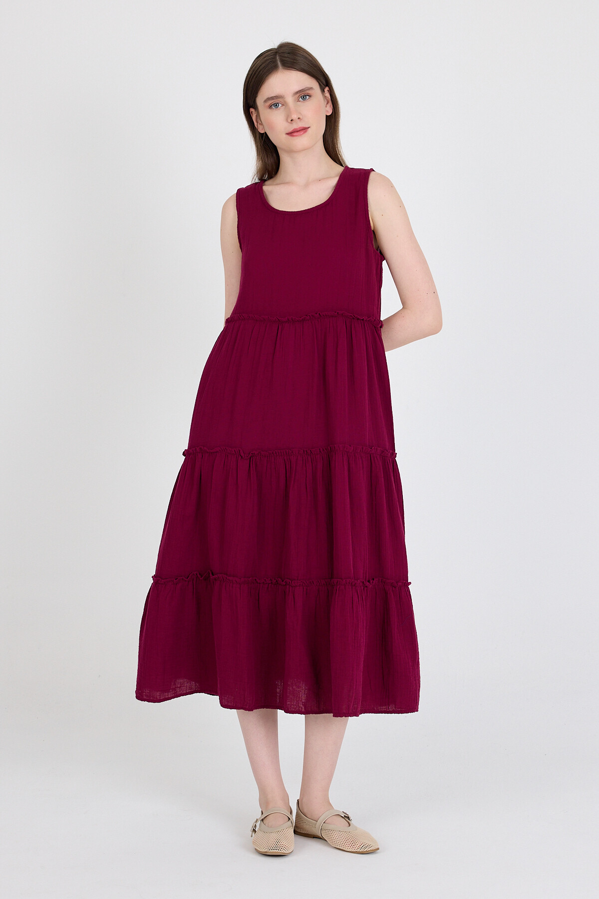Bordo Keten Görünümlü %100 Pamuk Fırfır Detaylı Kolsuz Midi Elbise 4738A
