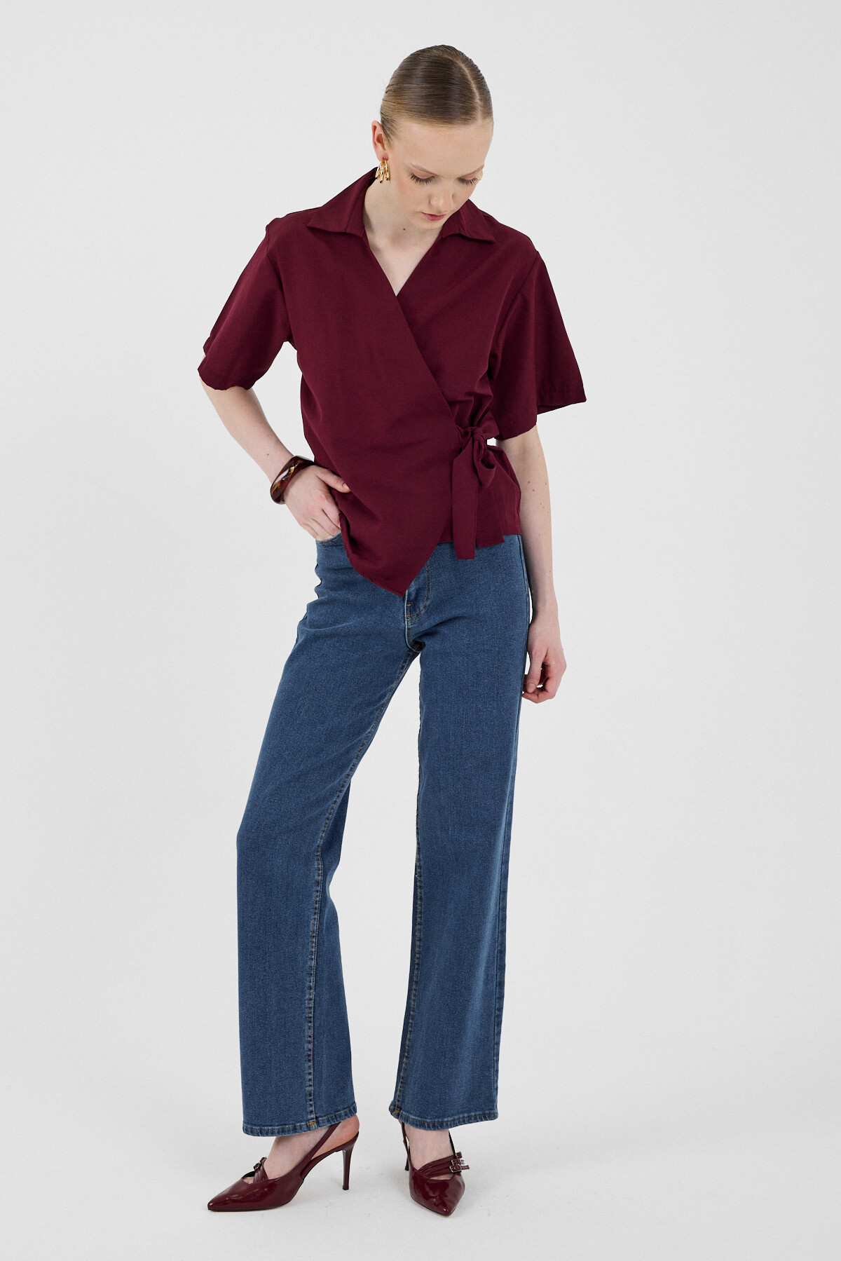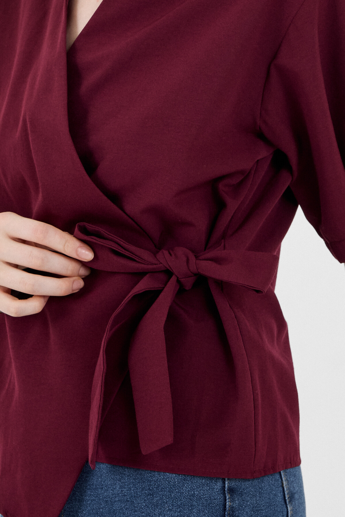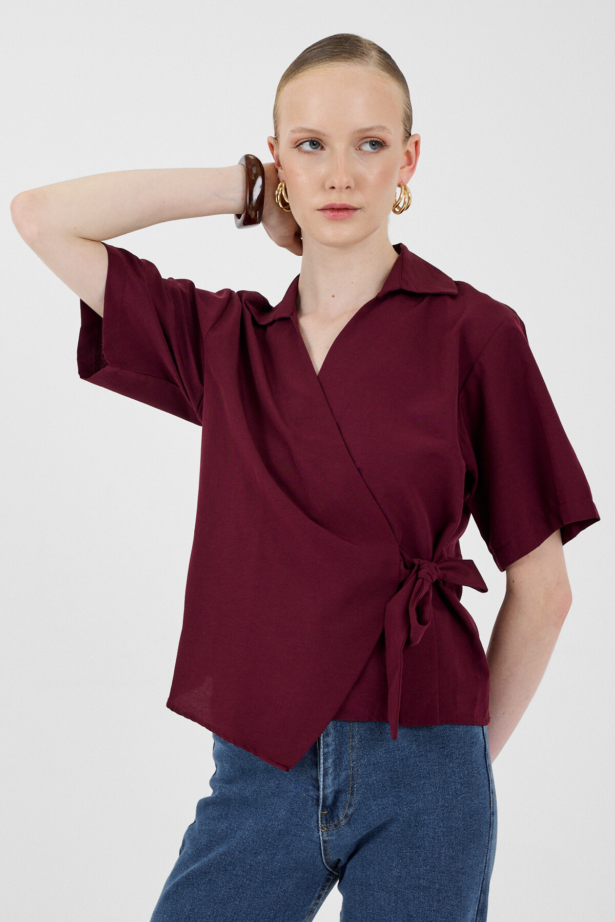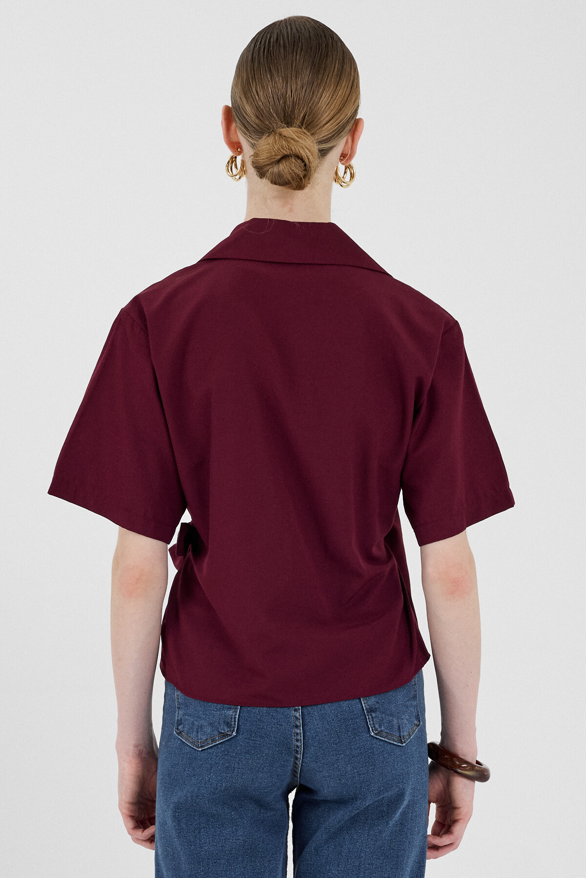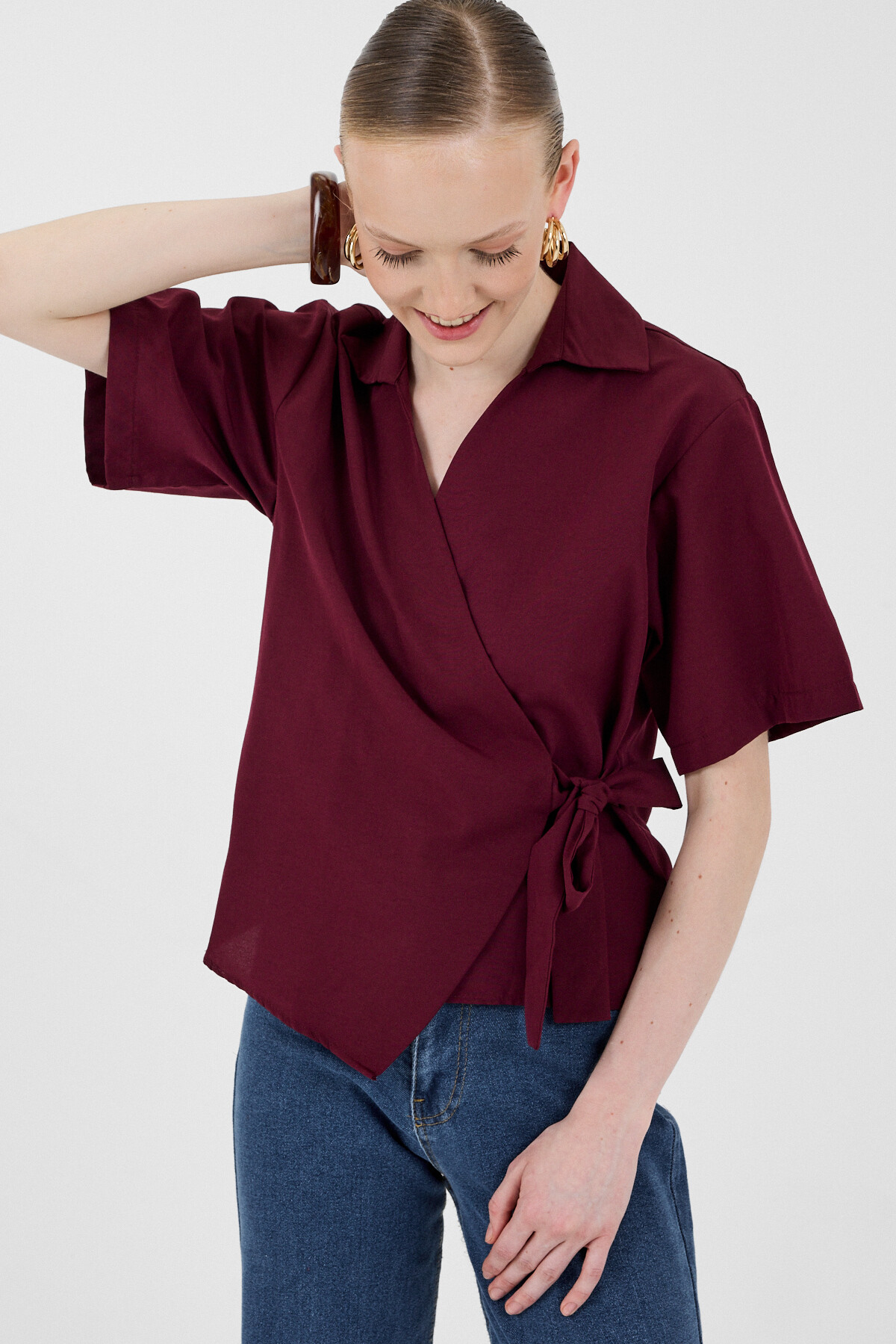 Bordo Kısa Kol Yan Bağlama Detaylı Bluz 8095A