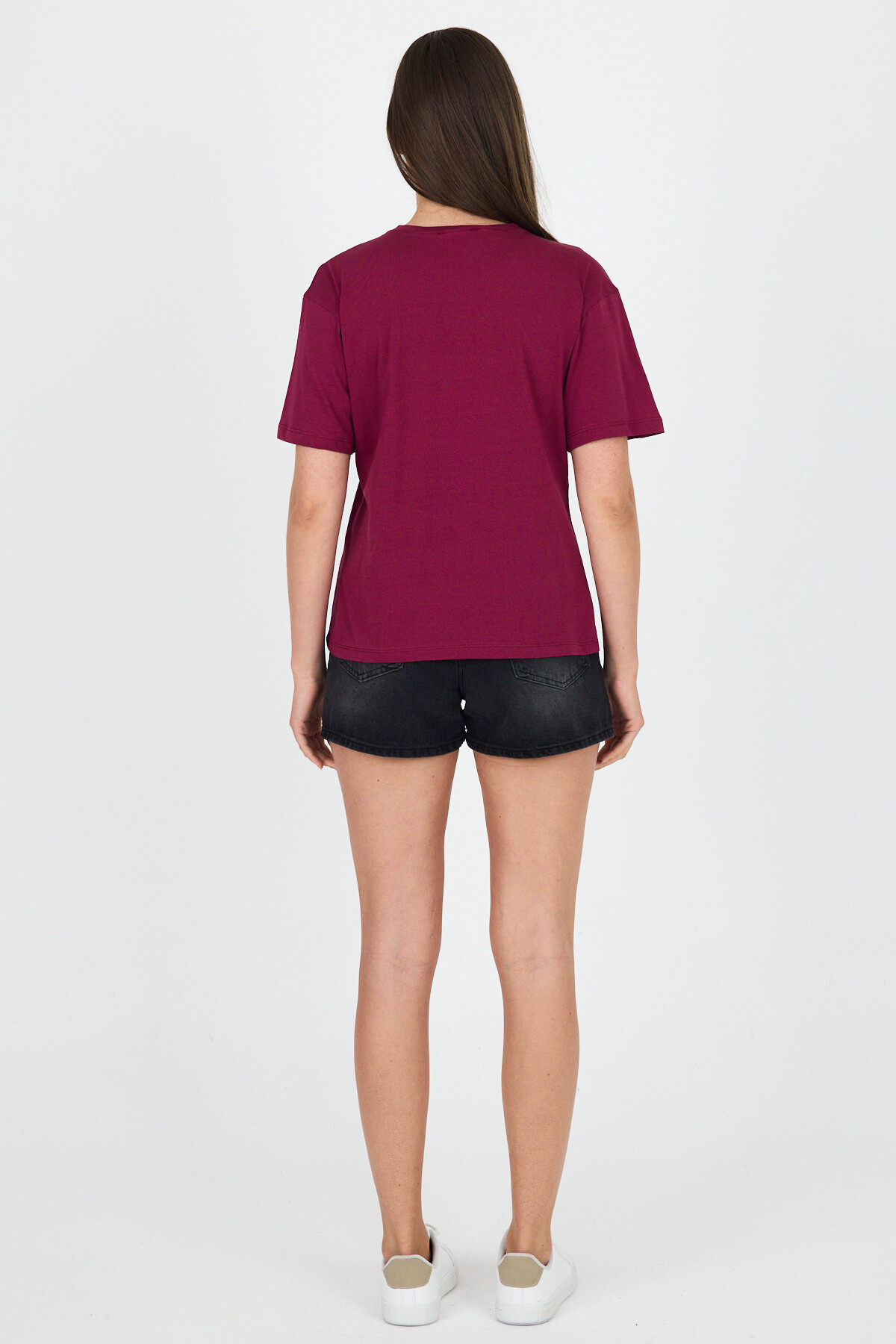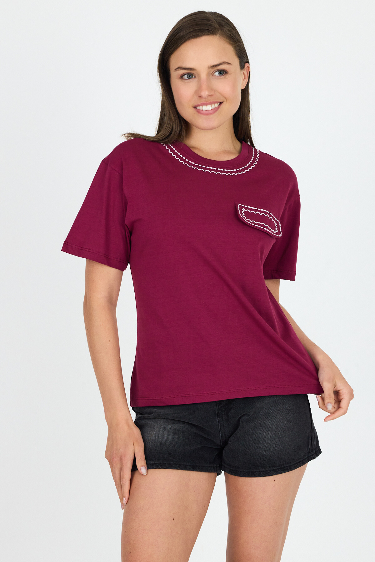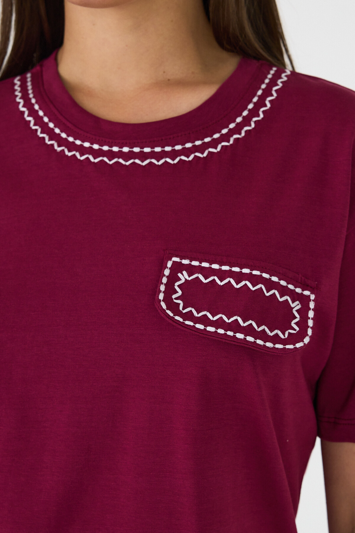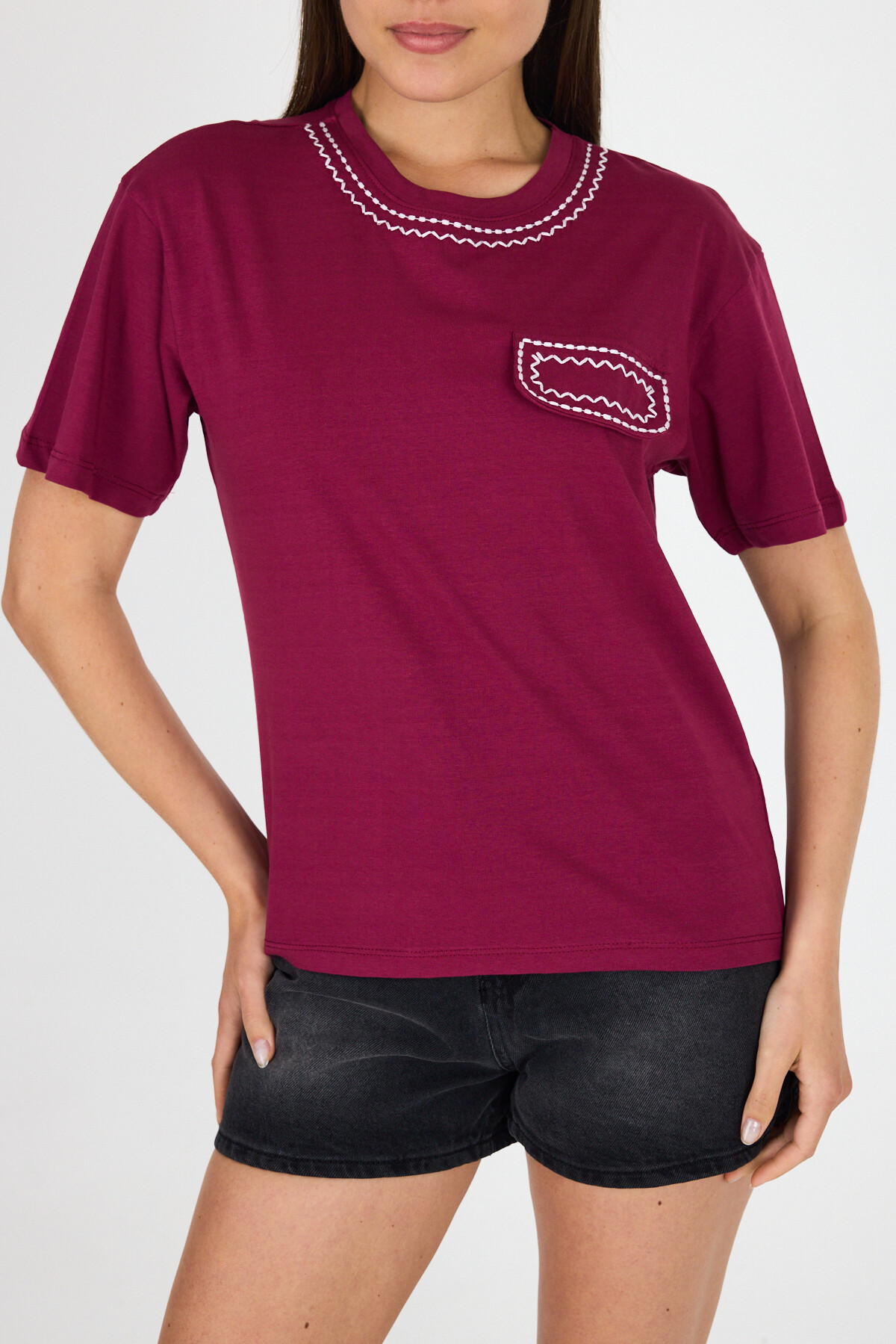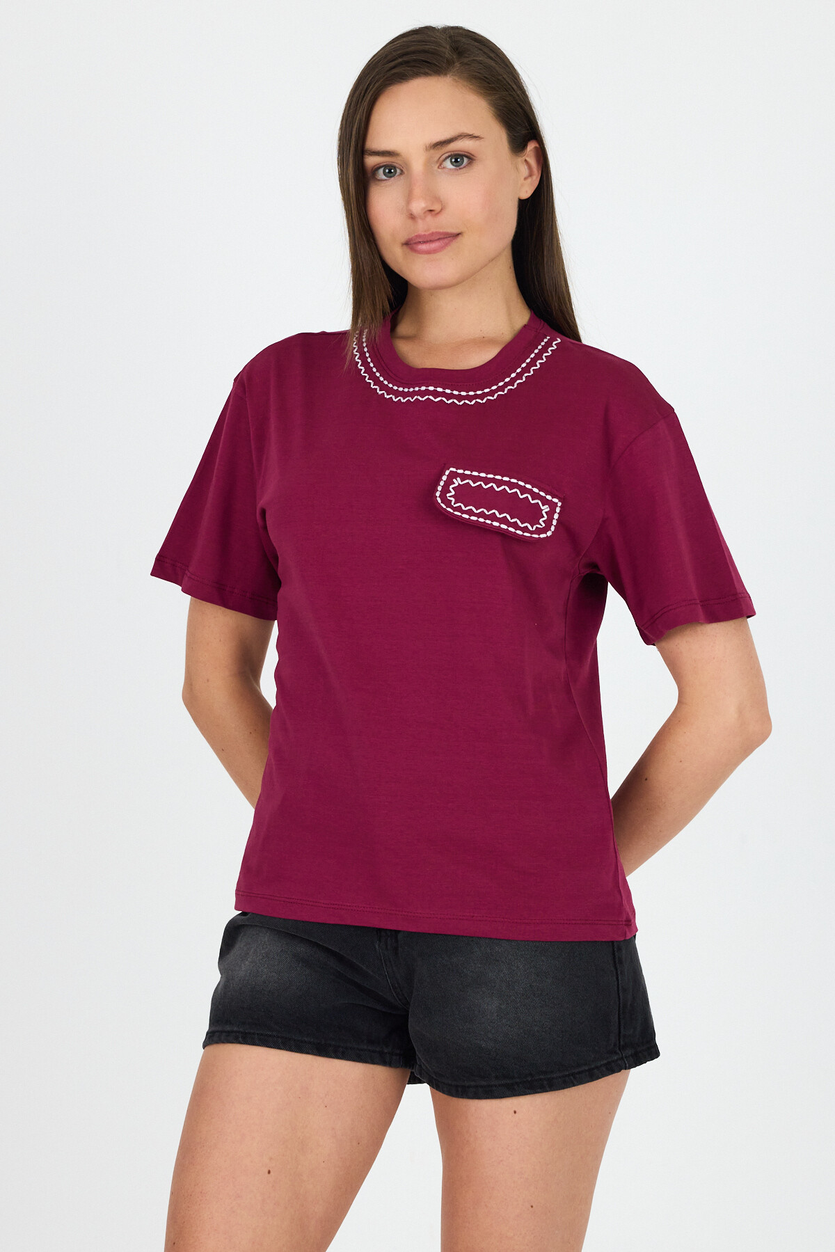Bordo Nakış İşlemeli Cep Görünüm Detaylı Tişört 2255M