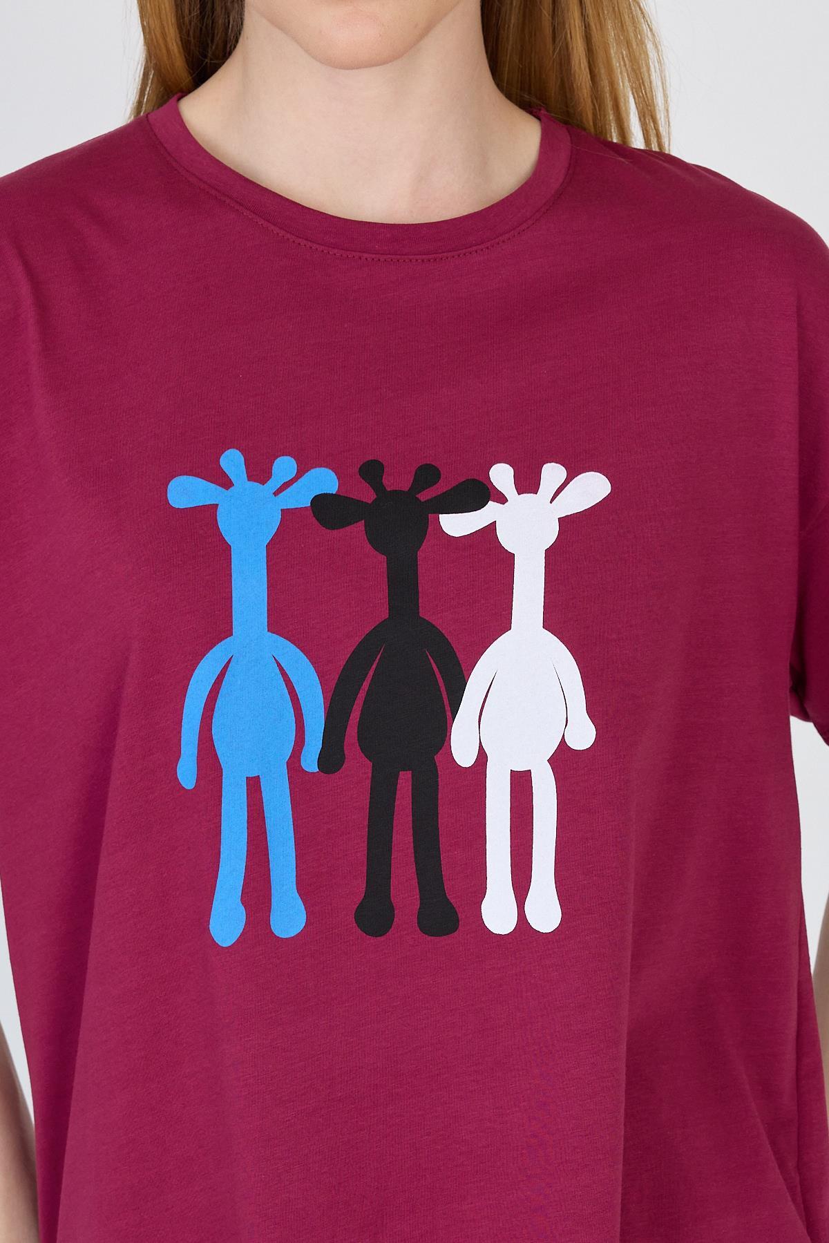 Bordo Oversize Zürafa Baskılı Tişört 2150-12M