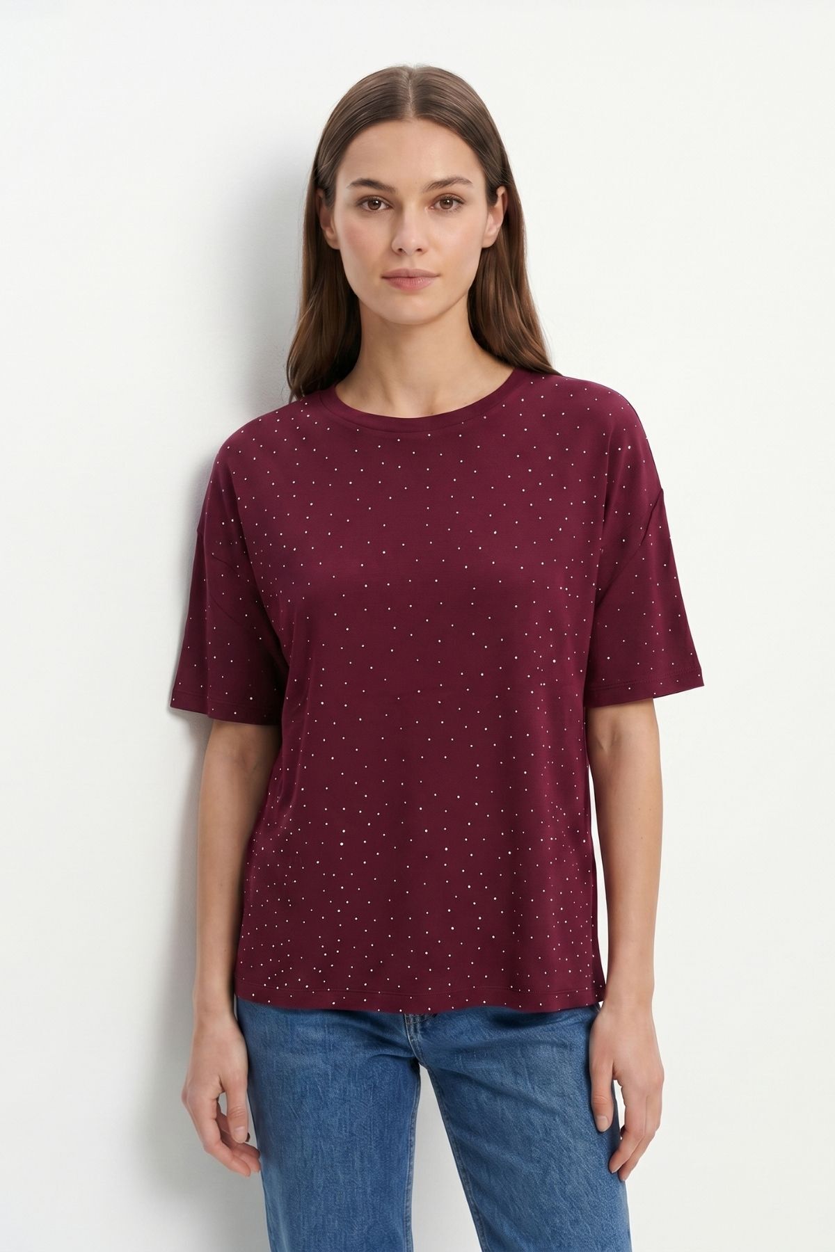 Bordo Taşlı Bisiklet Yaka Tişört 1762