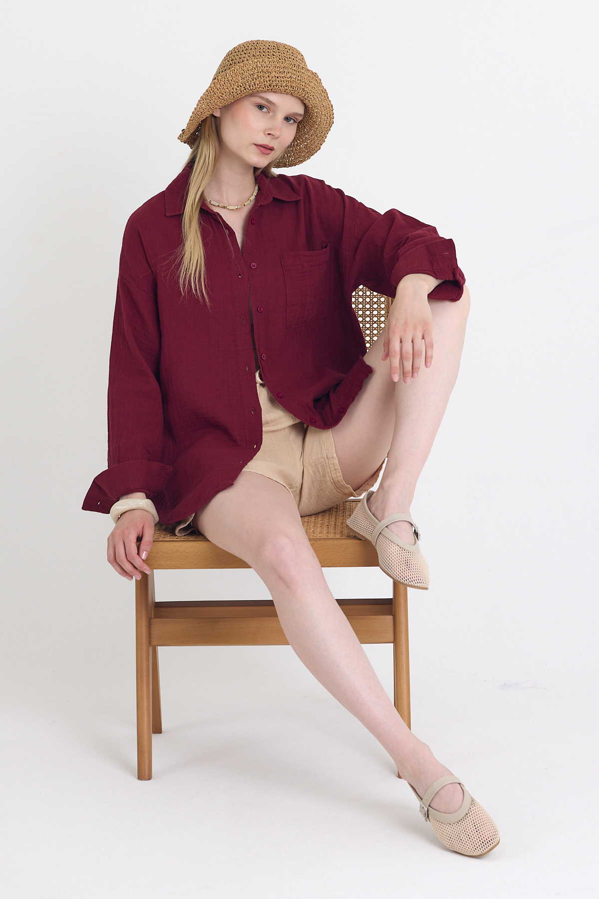 Bordo Tek Cepli %100 Pamuk Oversize Müslin Gömlek 4697A