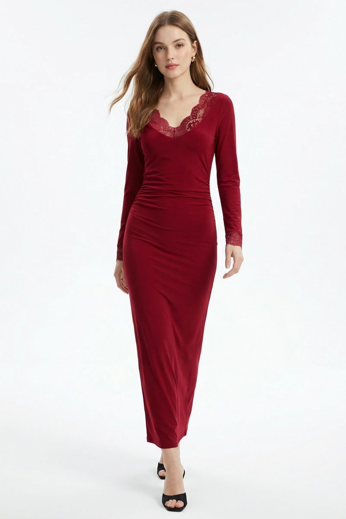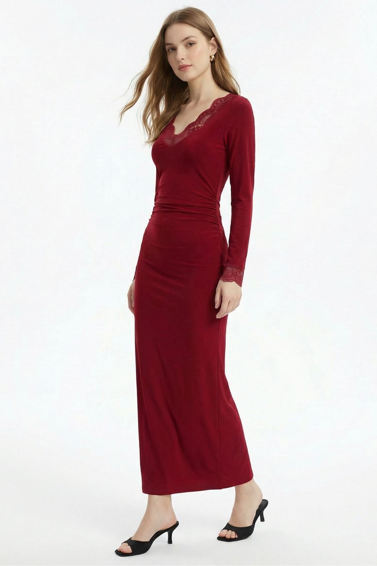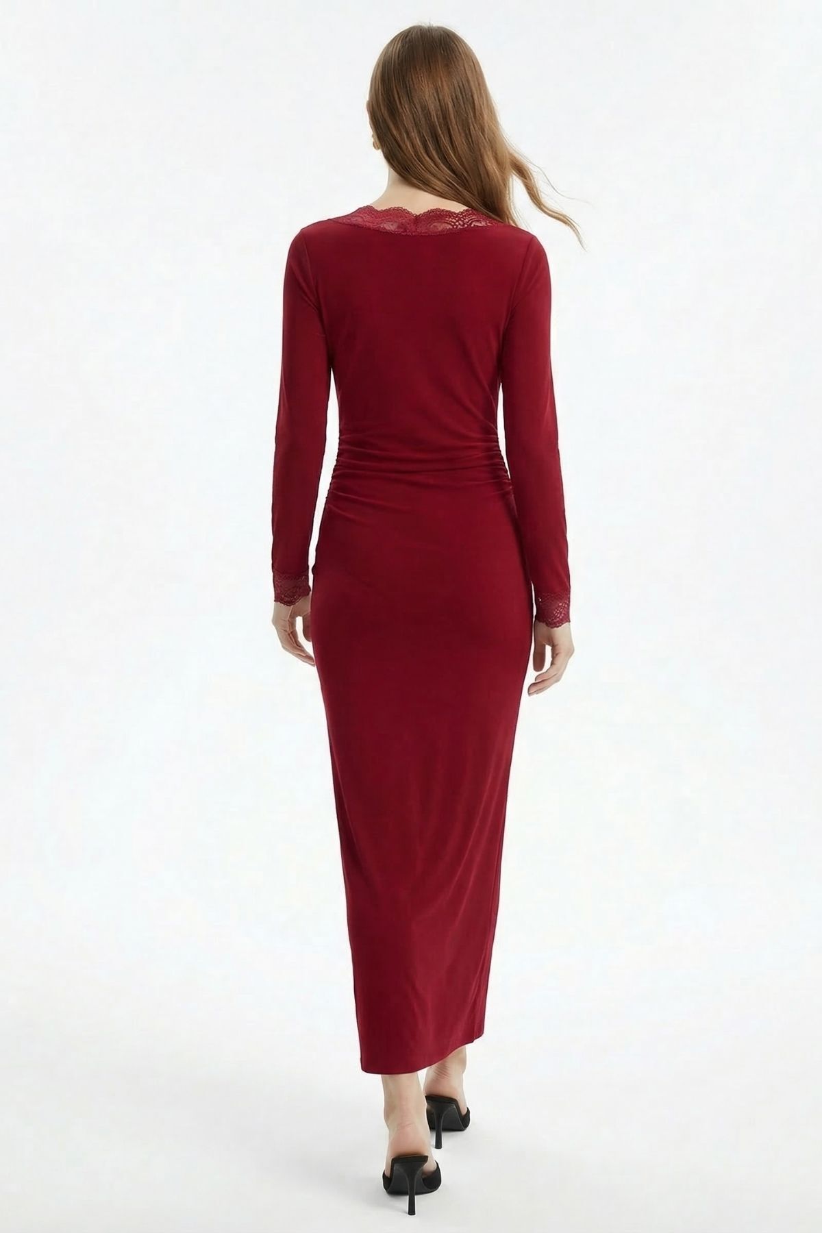 Bordo V Yaka Dantelli Elbise 15067